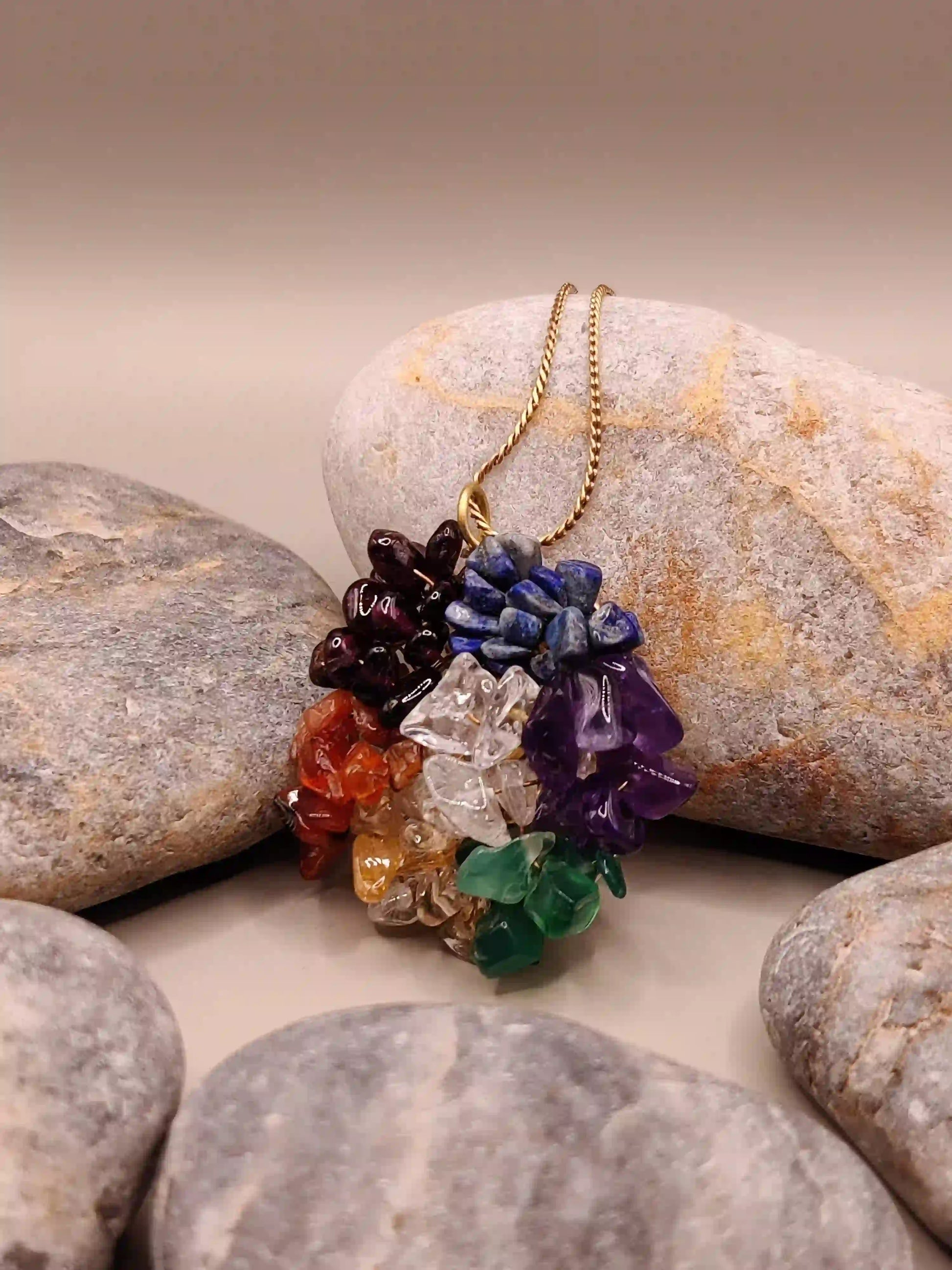 The 7 chakra necklace is made with semi-raw crystals that can emanate maximum amount of energy without looking dull like most raw crystals look and is made with brass wires and accompanied with a brass chain of 20-24 inches that will sit on your chest, close to your heart, healing your soul and your chakras. All necklaces have a warranty of 12 months and free repairs* for 12 months.