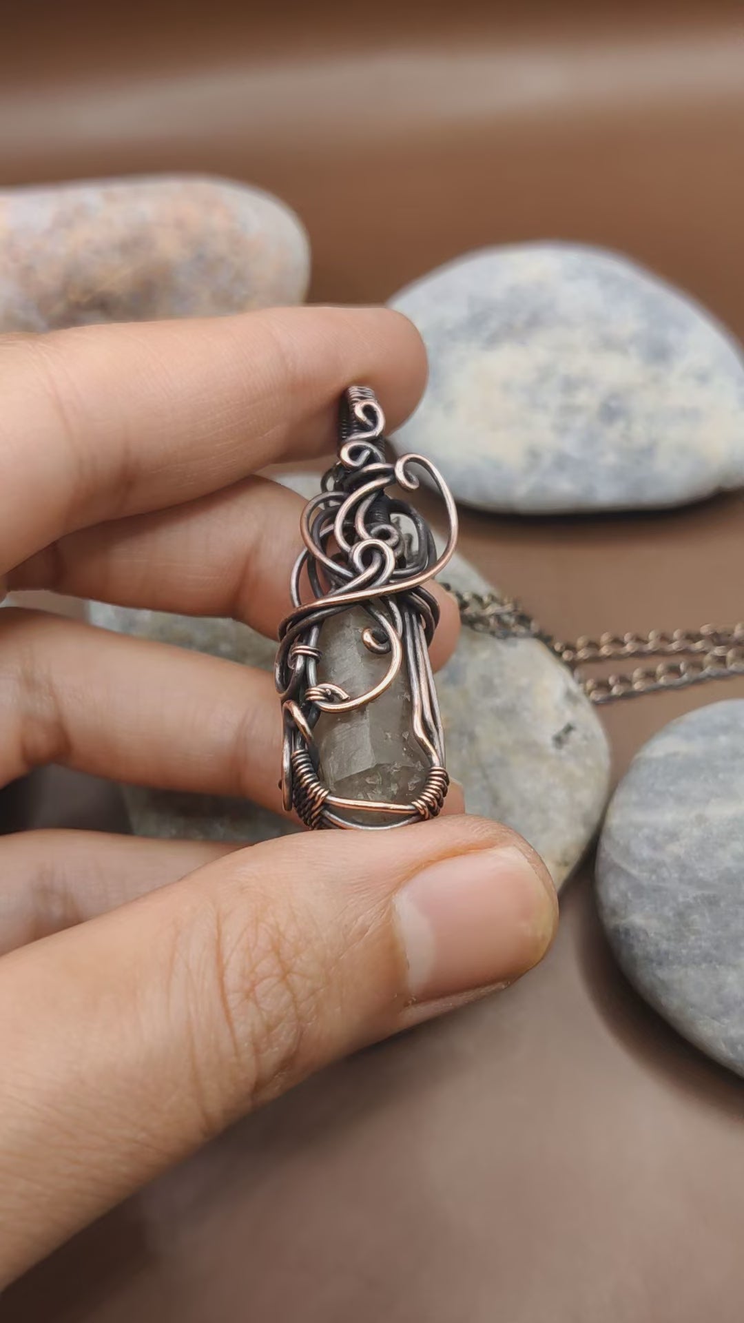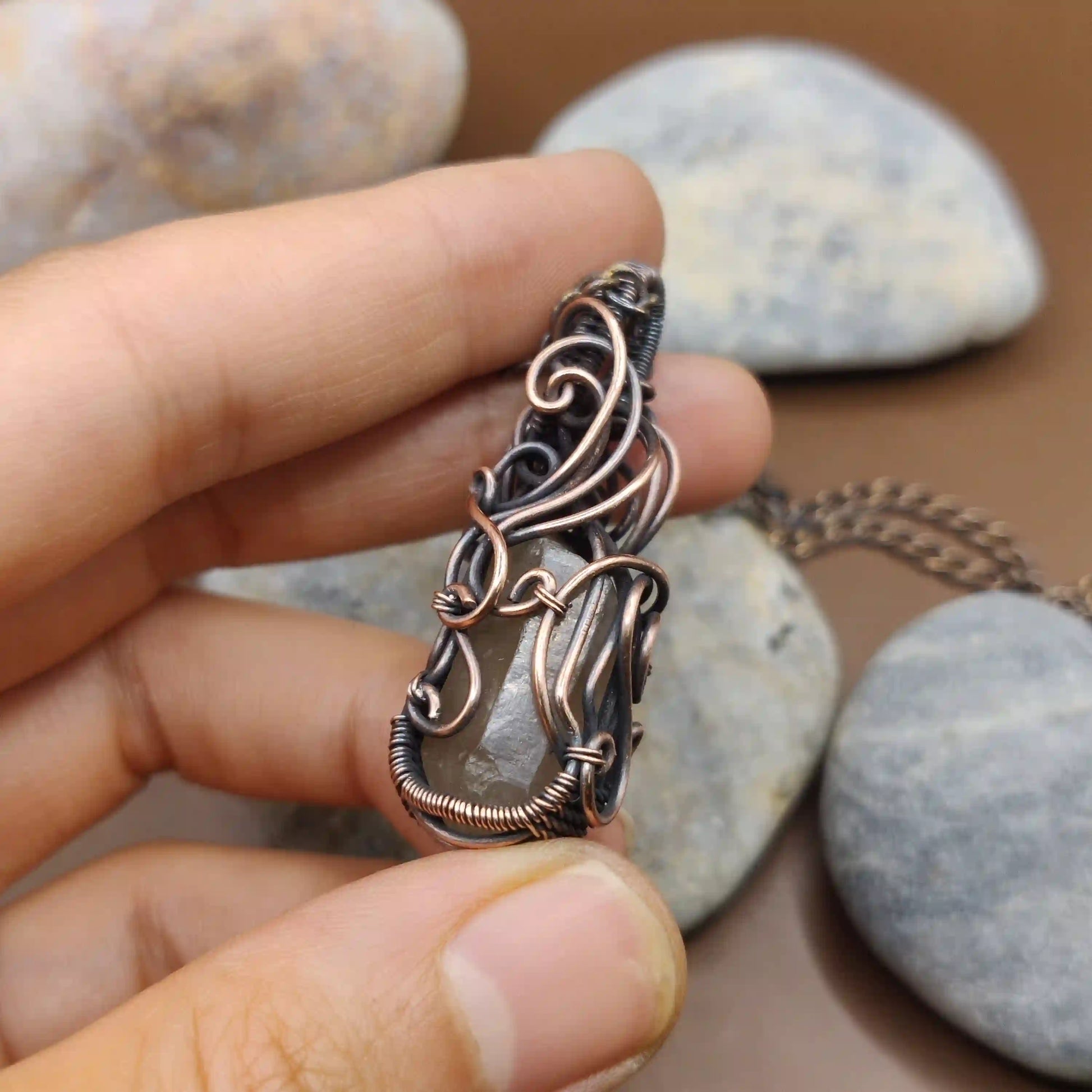 This necklace features a clear quartz crystal, known to amplify positive energy, encased in handcrafted, oxidized copper wire. The combination offers a touch of earthy elegance while promoting clarity and well-being. These are made up of raw crystal. Please handle with care.