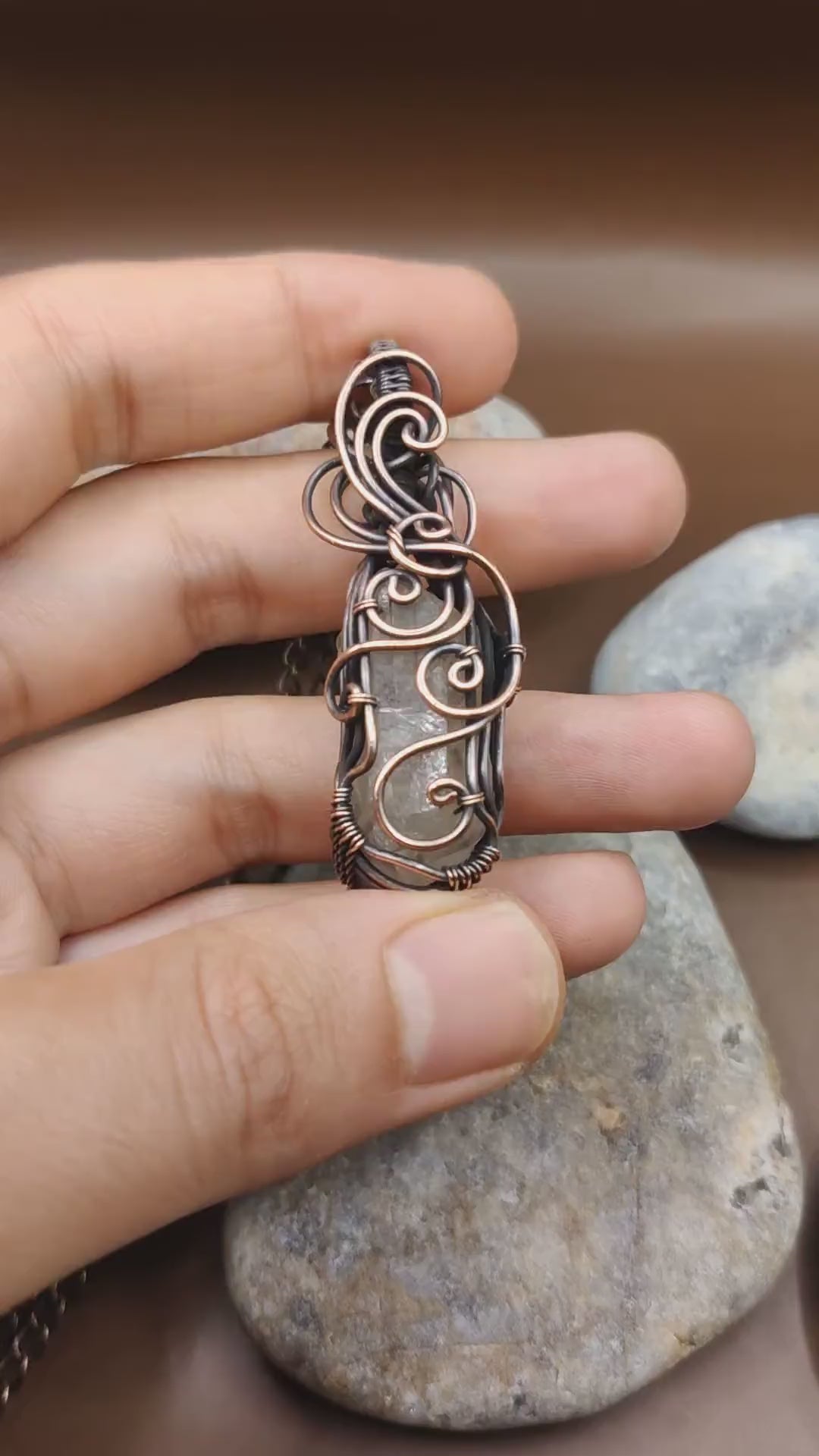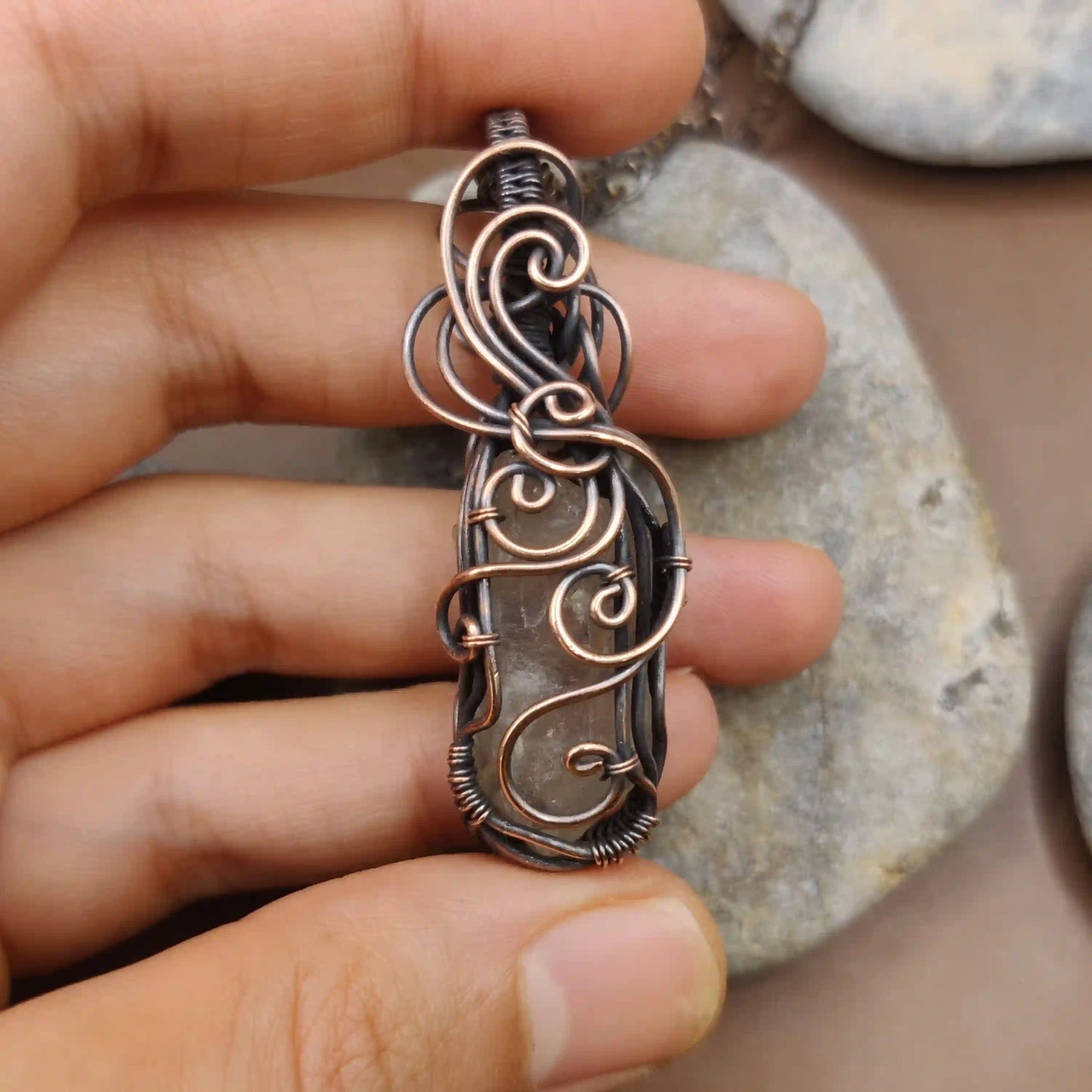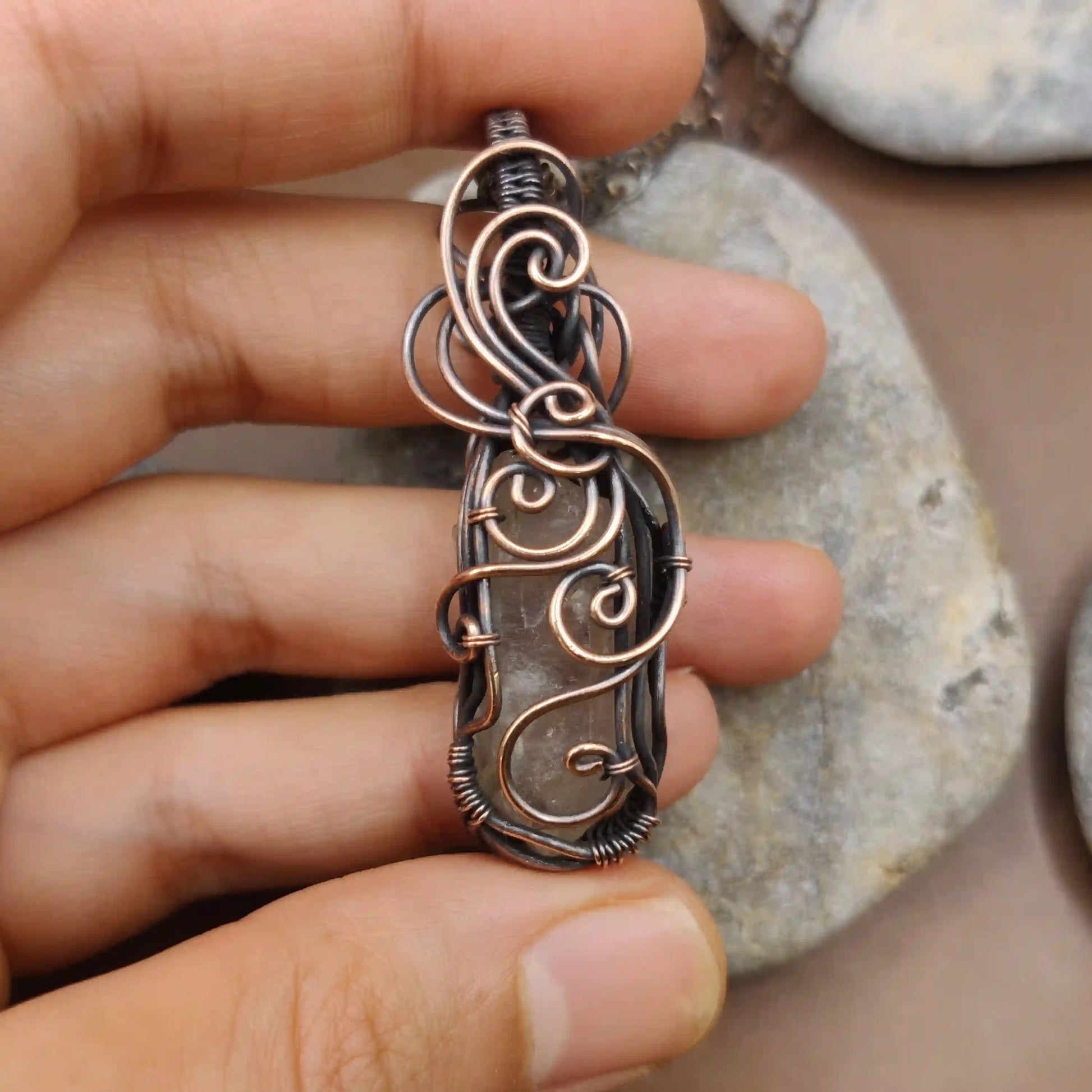Crafted with intention, this necklace showcases a clear quartz crystal, traditionally associated with balance and inner peace. The oxidized copper wire adds a timeless touch, while the crystal itself is believed to enhance focus and emotional well-being. These are made up of raw crystal. Please handle with care.