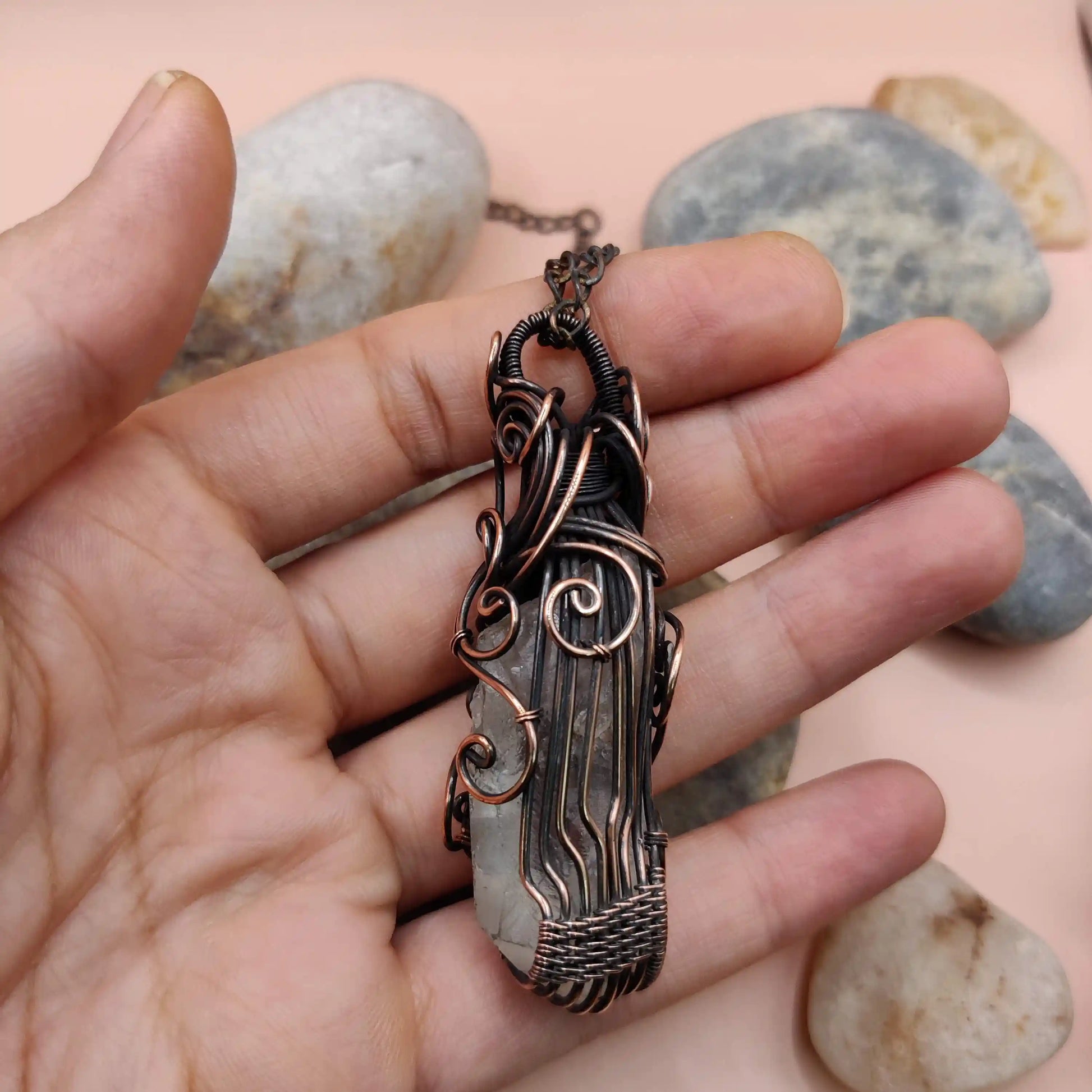 Adorn yourself with natural beauty and positive energy. This necklace features a clear quartz crystal, known for amplifying clarity and focus, wrapped in rustic, oxidized copper wire. Clear quartz is believed to balance and enhance your intentions, making it a perfect companion for daily wear.