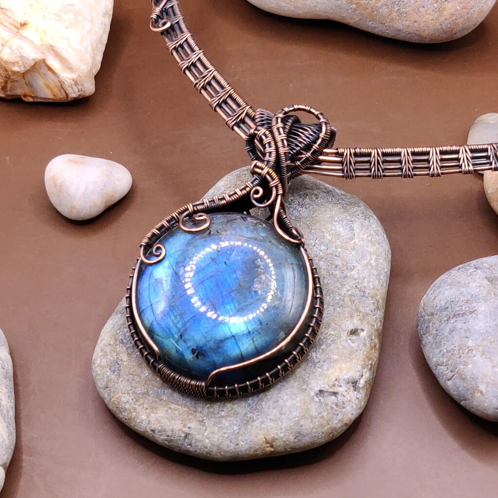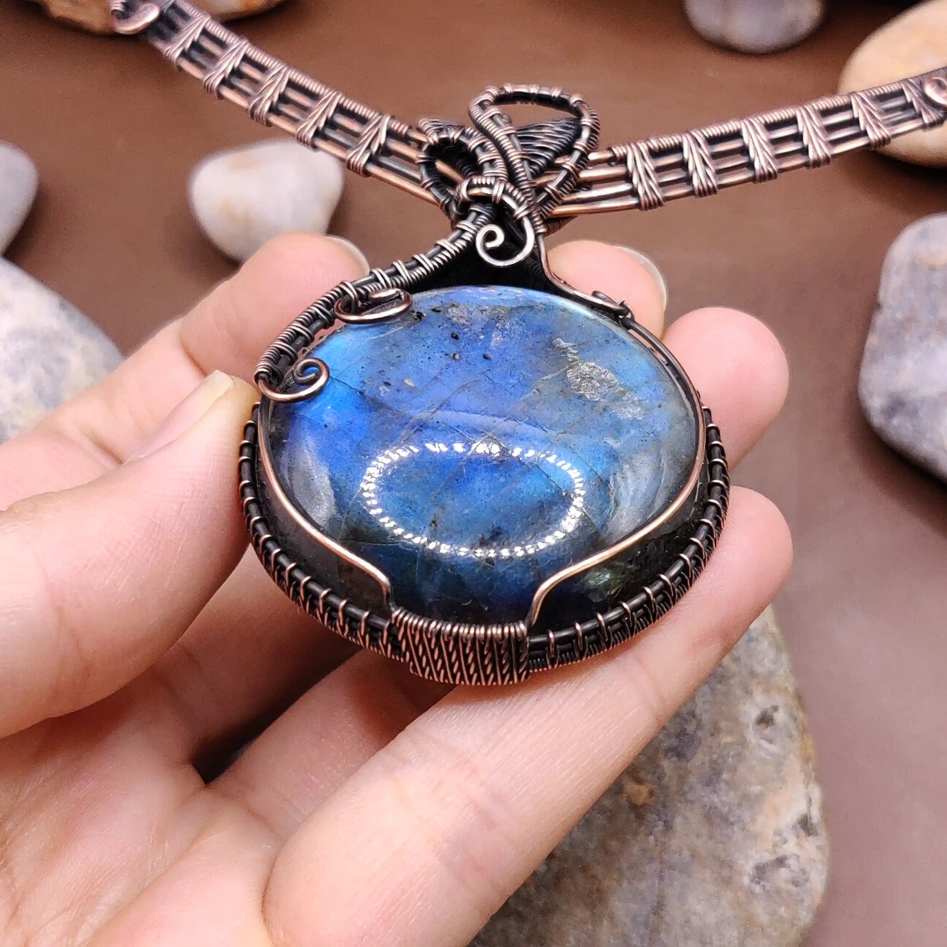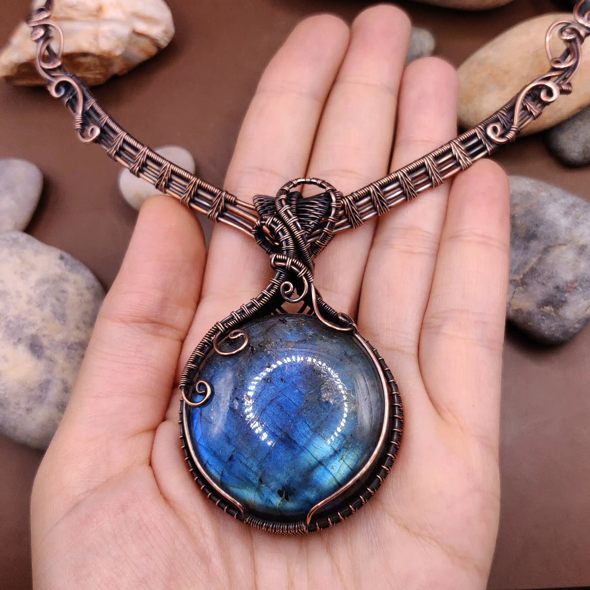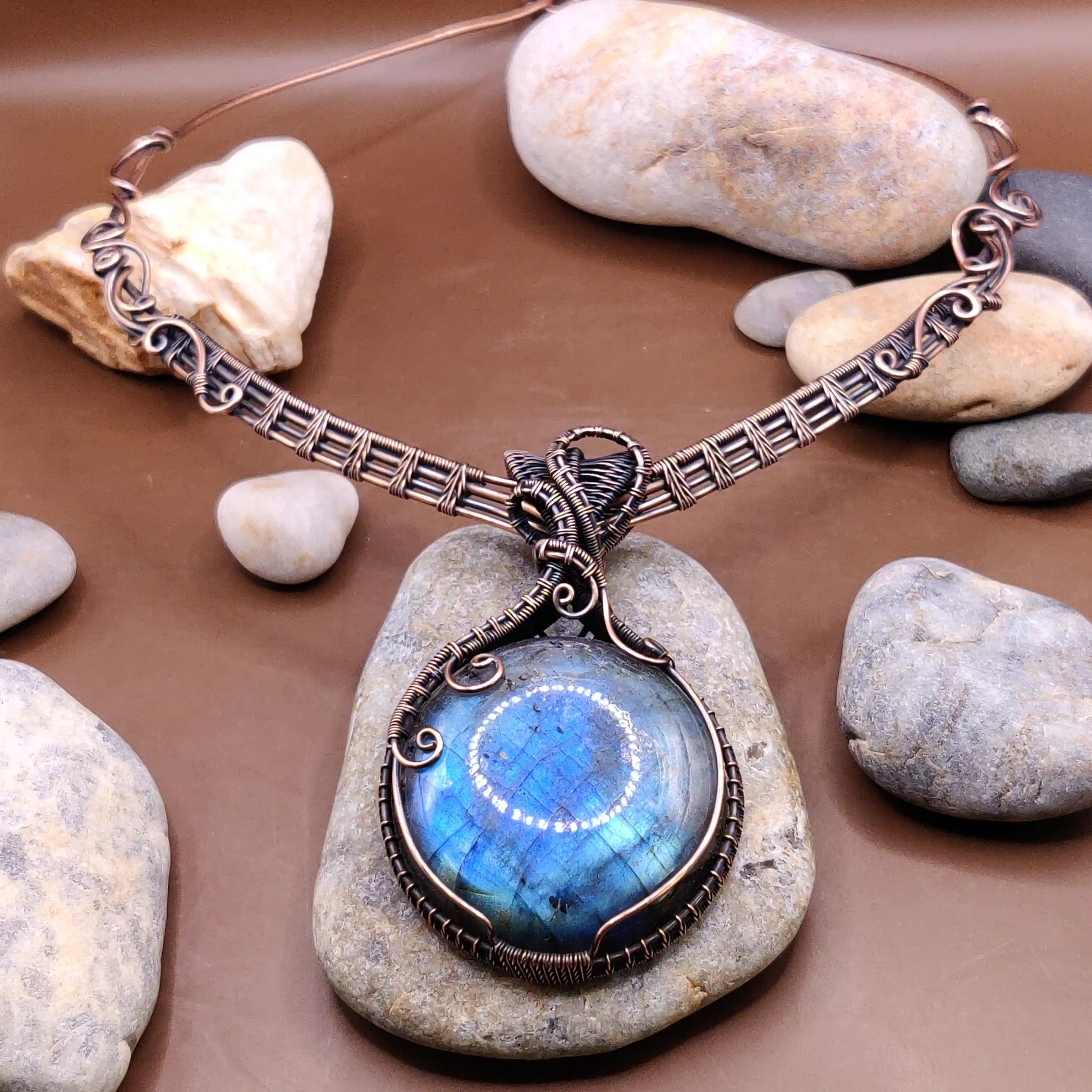 This one-of-a-kind necklace features a brilliant blue-flash Labradorite—an ethereal stone shimmering with hues of azure, gold, and silver—expertly set in oxidized copper. The pendant is suspended from a handmade Hasli-style copper collar, crafted with intricate wire weaving that adds a bold, structured elegance to the design. This is not merely a piece of jewelry—it’s a protective amulet and a statement of mystical presence.