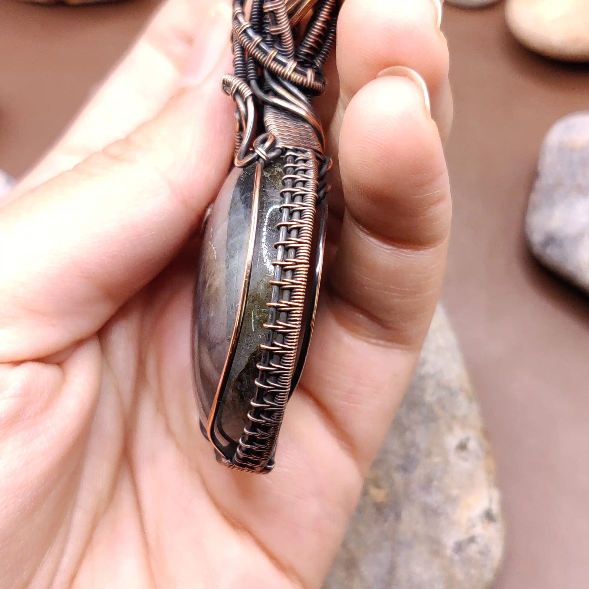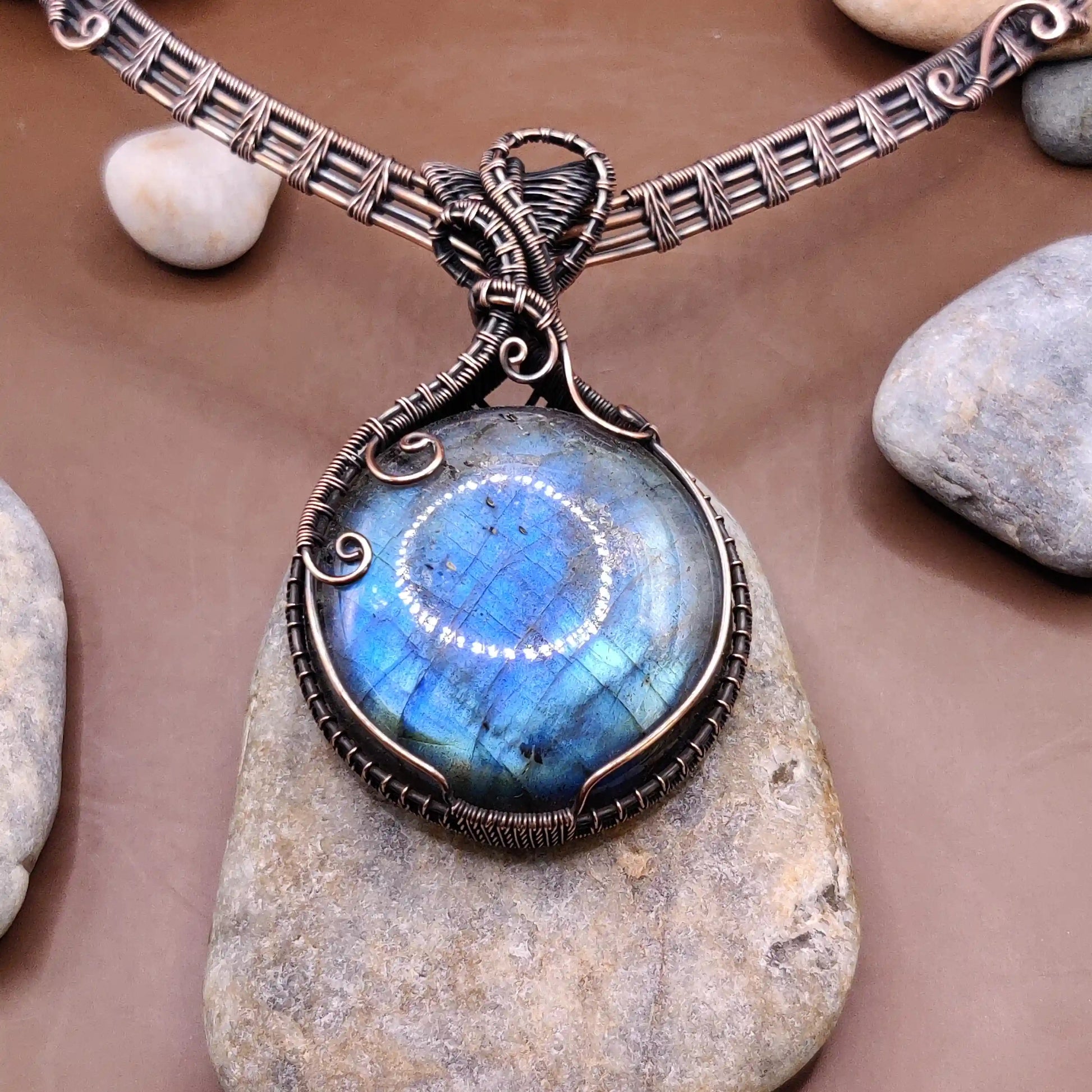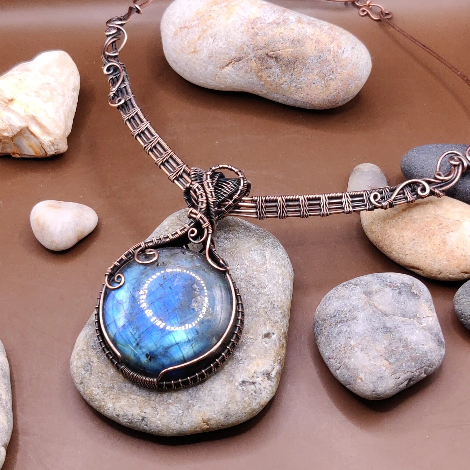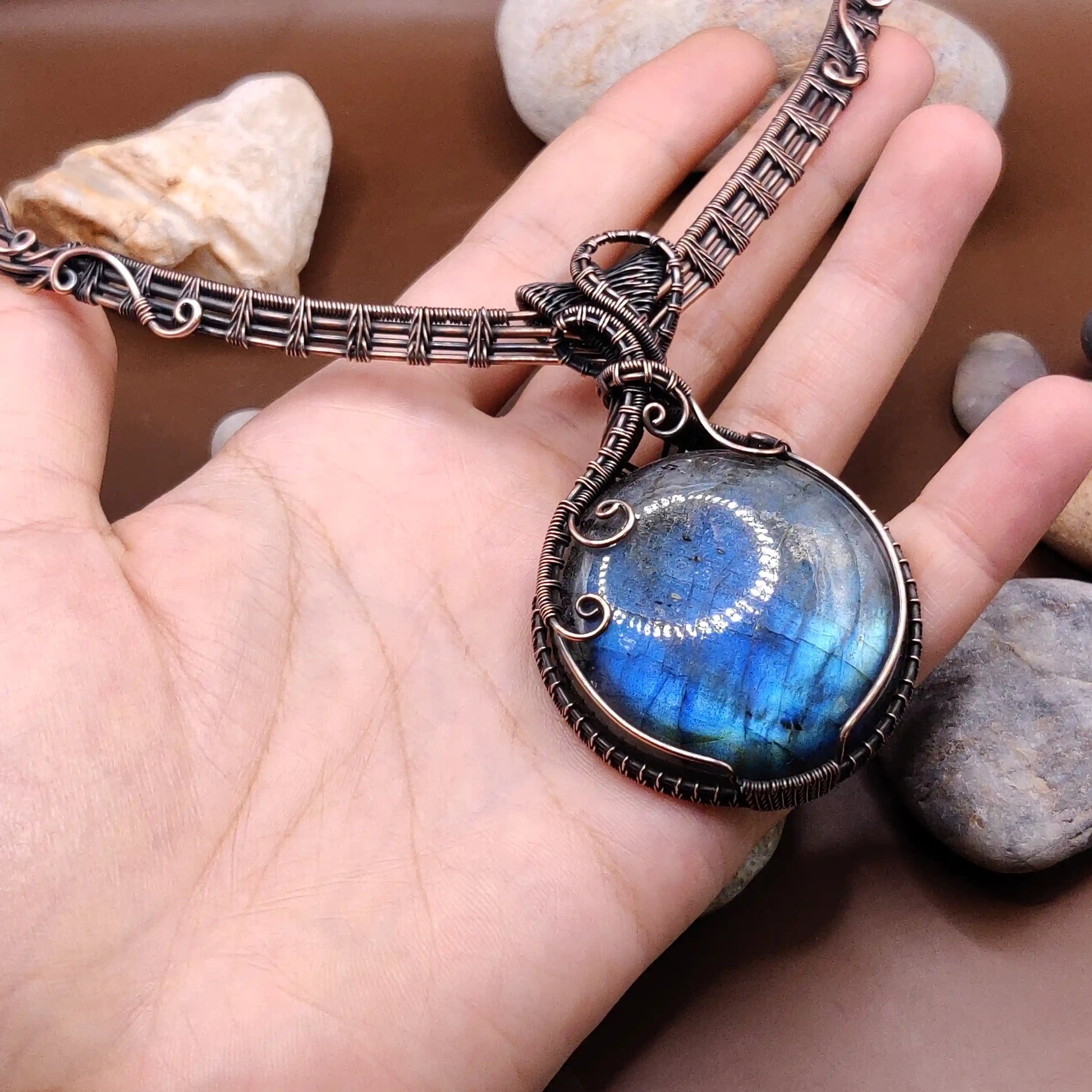 This one-of-a-kind necklace features a brilliant blue-flash Labradorite—an ethereal stone shimmering with hues of azure, gold, and silver—expertly set in oxidized copper. The pendant is suspended from a handmade Hasli-style copper collar, crafted with intricate wire weaving that adds a bold, structured elegance to the design. This is not merely a piece of jewelry—it’s a protective amulet and a statement of mystical presence.