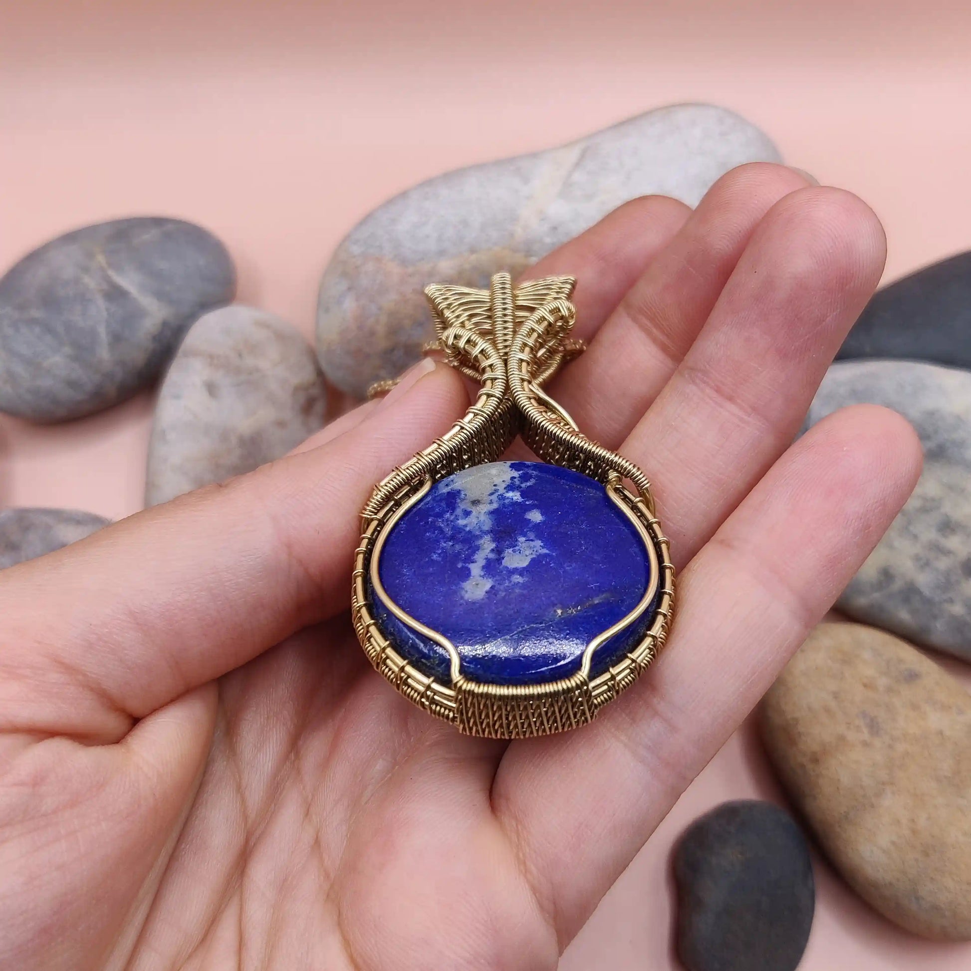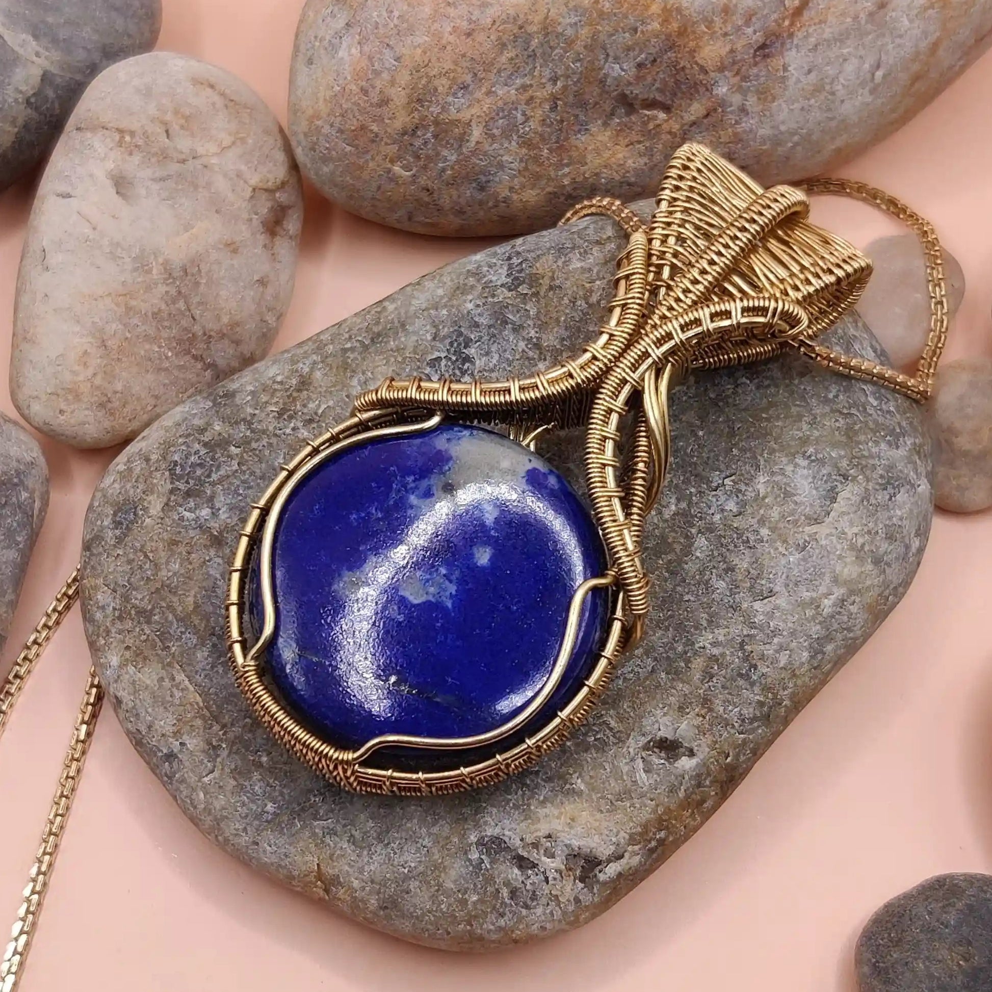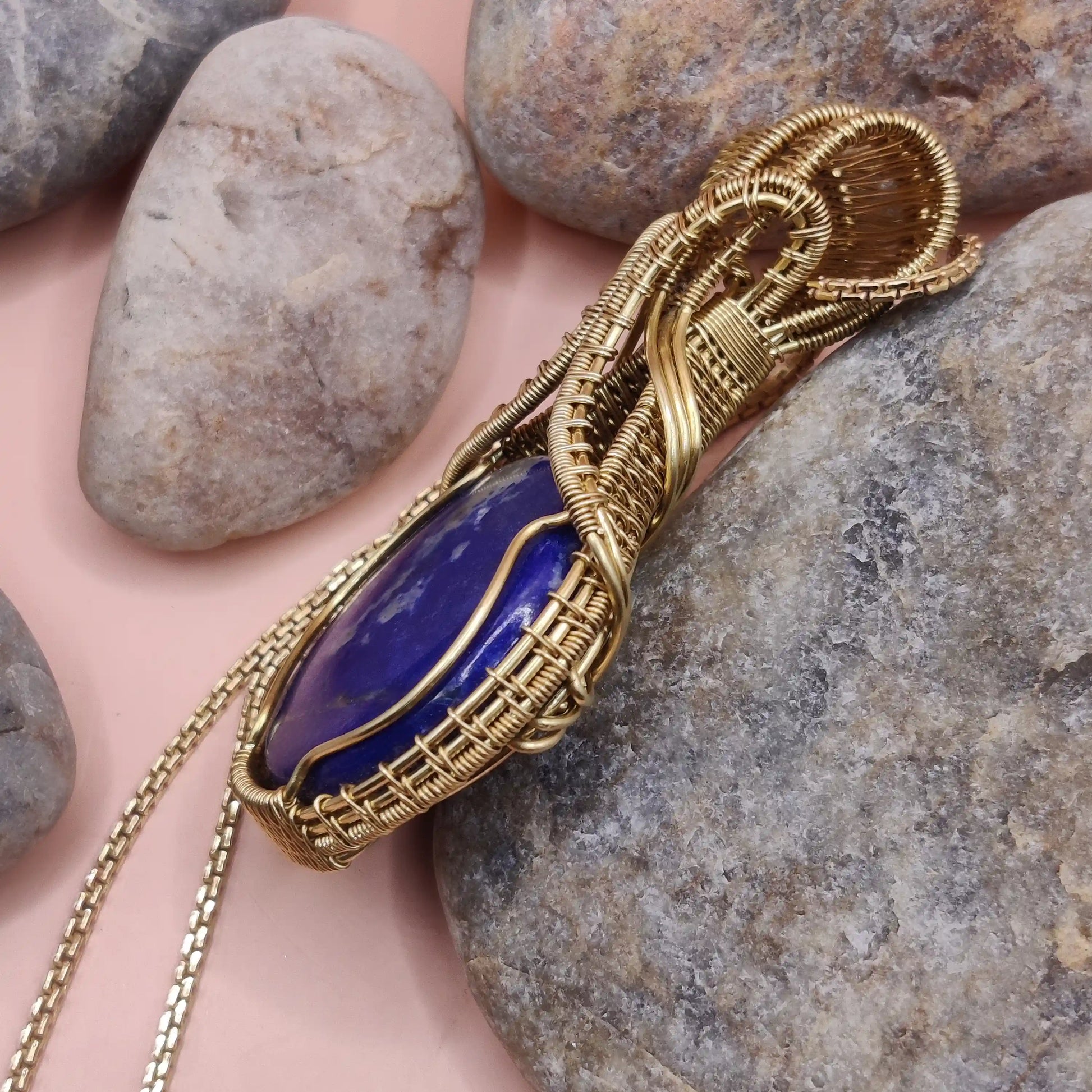 This exquisite handmade pendant features a deep blue Lapis Lazuli cabochon, elegantly wrapped in intricately detailed brass work, and suspended on a matching brass chain. A gemstone prized by ancient Egyptian royalty and revered by mystics through the ages, Lapis Lazuli radiates a sense of inner nobility and cosmic wisdom. With golden flecks of pyrite dancing through its rich azure body, this pendant evokes the night sky—calling forth clarity, truth, and spiritual insight.