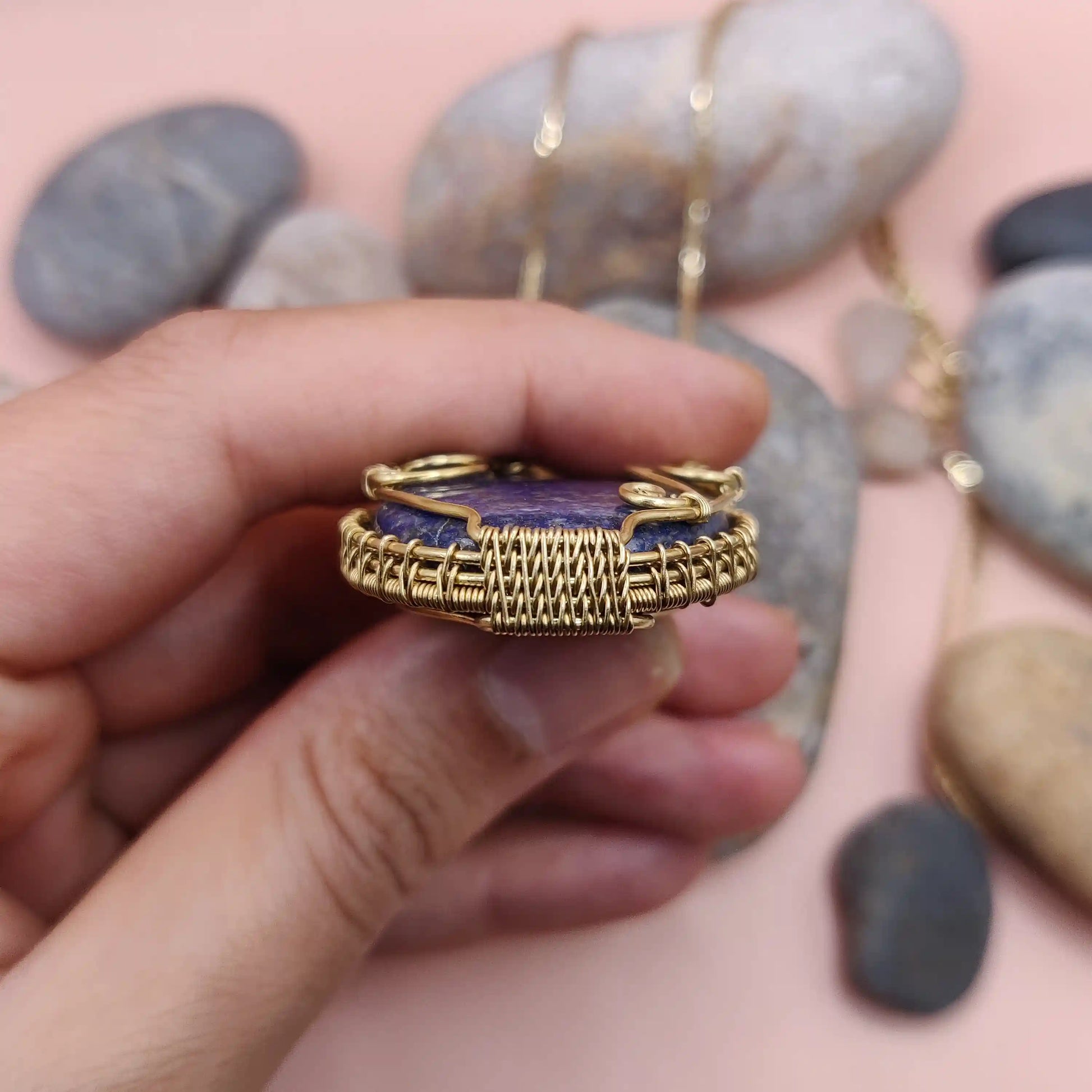 This exquisite handmade pendant features a deep blue Lapis Lazuli cabochon, elegantly wrapped in intricately detailed brass work, and suspended on a matching brass chain. A gemstone prized by ancient Egyptian royalty and revered by mystics through the ages, Lapis Lazuli radiates a sense of inner nobility and cosmic wisdom. With golden flecks of pyrite dancing through its rich azure body, this pendant evokes the night sky—calling forth clarity, truth, and spiritual insight.
