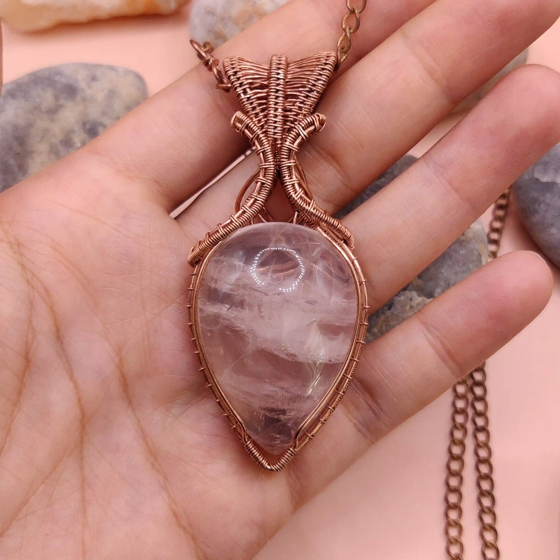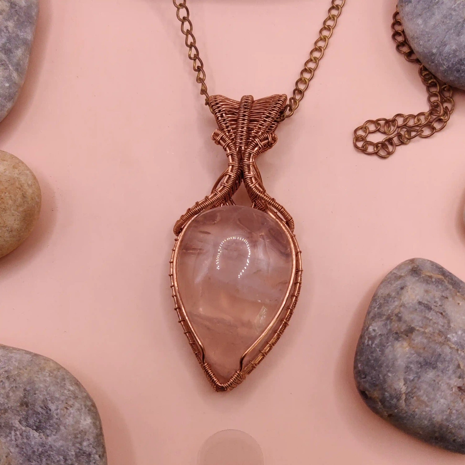 This delicate yet powerful necklace features a beautiful natural Rose Quartz gemstone, known for its gentle pink hue and serene energy. Set in warm copper with a clean, elegant finish, the pendant hangs from a simple matching chain—making it perfect for everyday wear or sacred ritual. Soft in its appearance yet deeply healing in its vibration, this piece is a quiet but constant companion on your journey toward self-love, emotional clarity, and heart-centered living.
