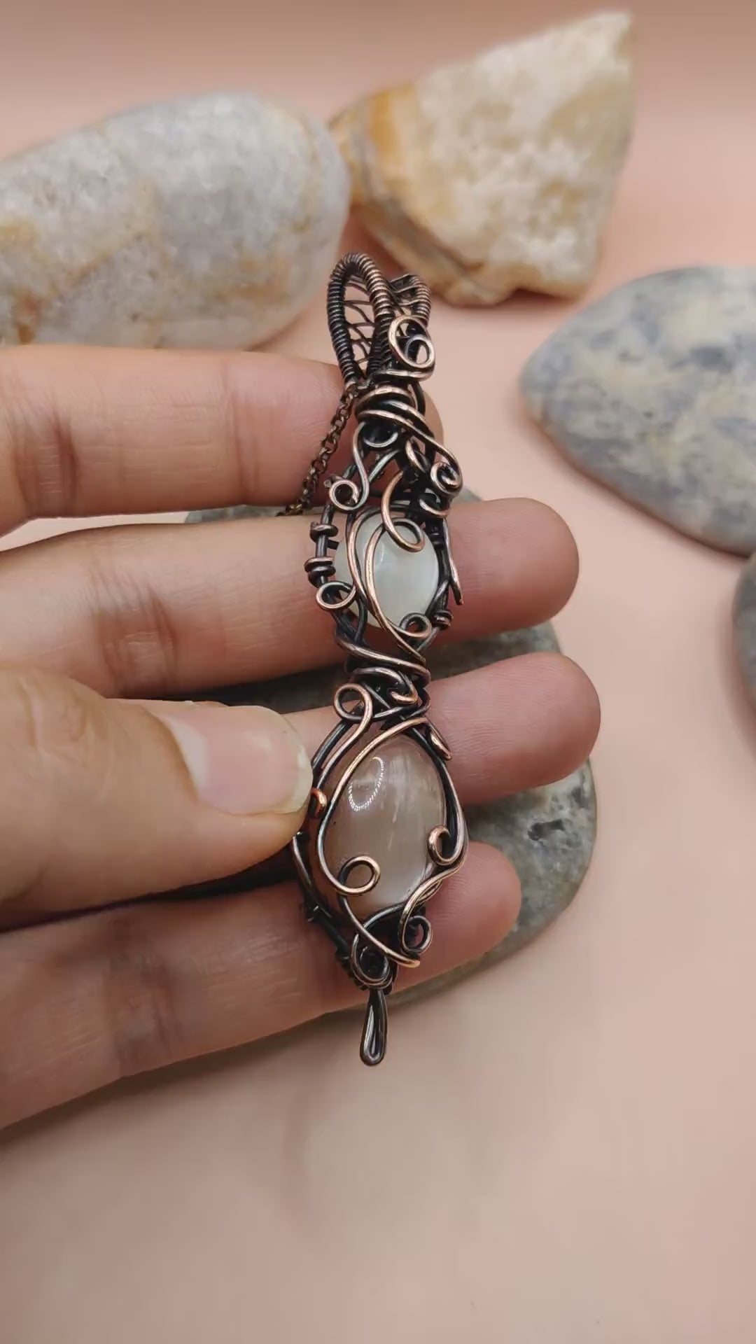 This necklace combines the power of two moonstones! White moonstone helps you stay calm and listen to your intuition, like a wise friend. Peach moonstone brings out your creativity and helps you feel good, like a burst of sunshine. Wrapped in cool copper wire, it's a beautiful way to connect with the moon's magic.