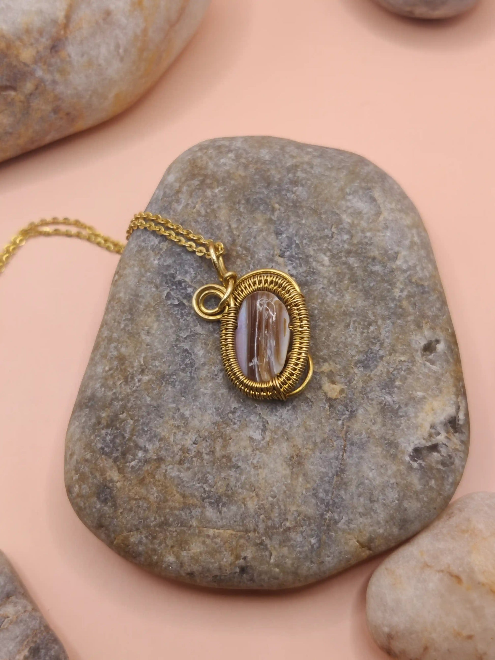 Its golden tone complements the soft iridescence of Mother of Pearl, making the overall piece both subtle and soulful.
