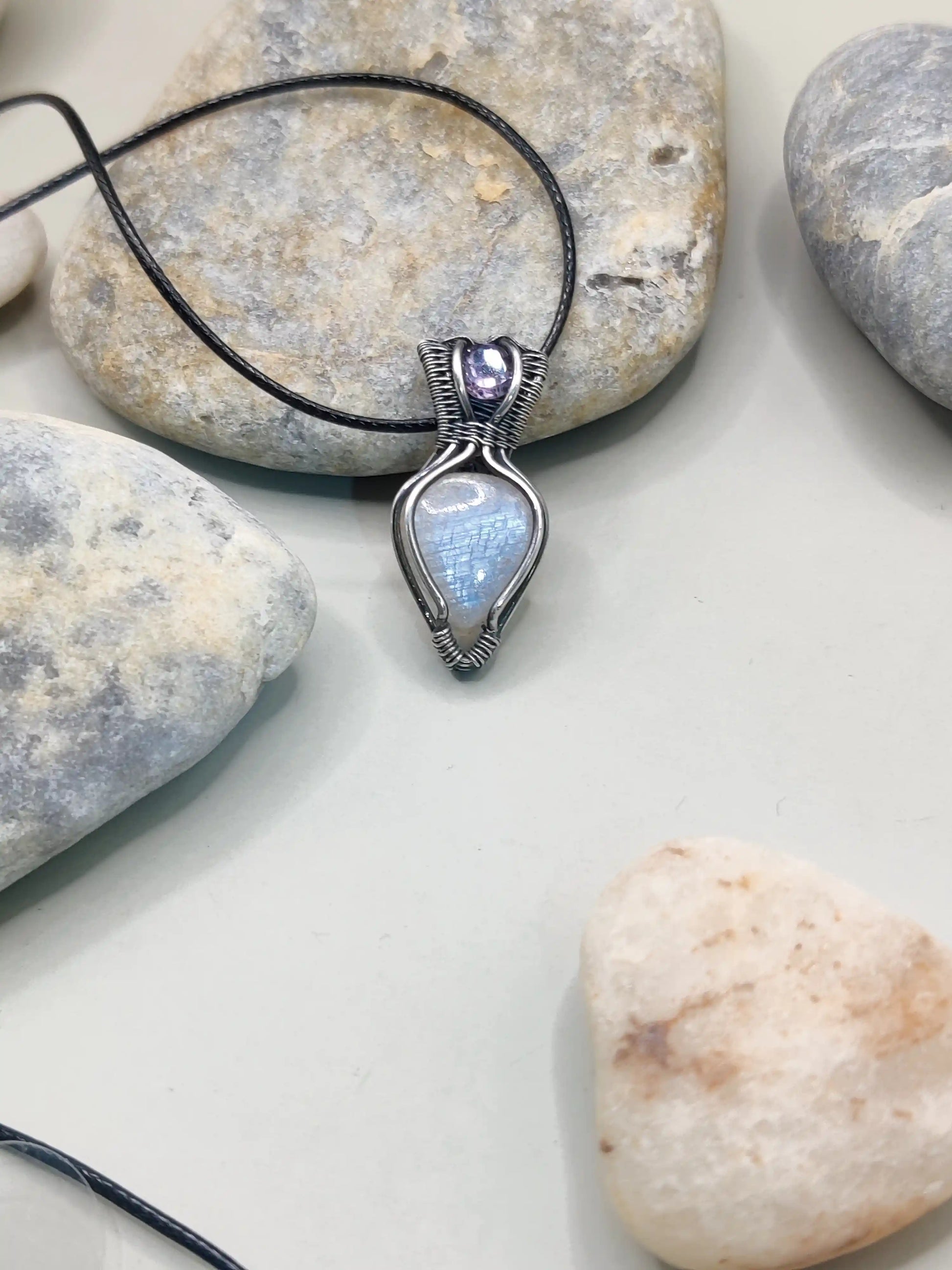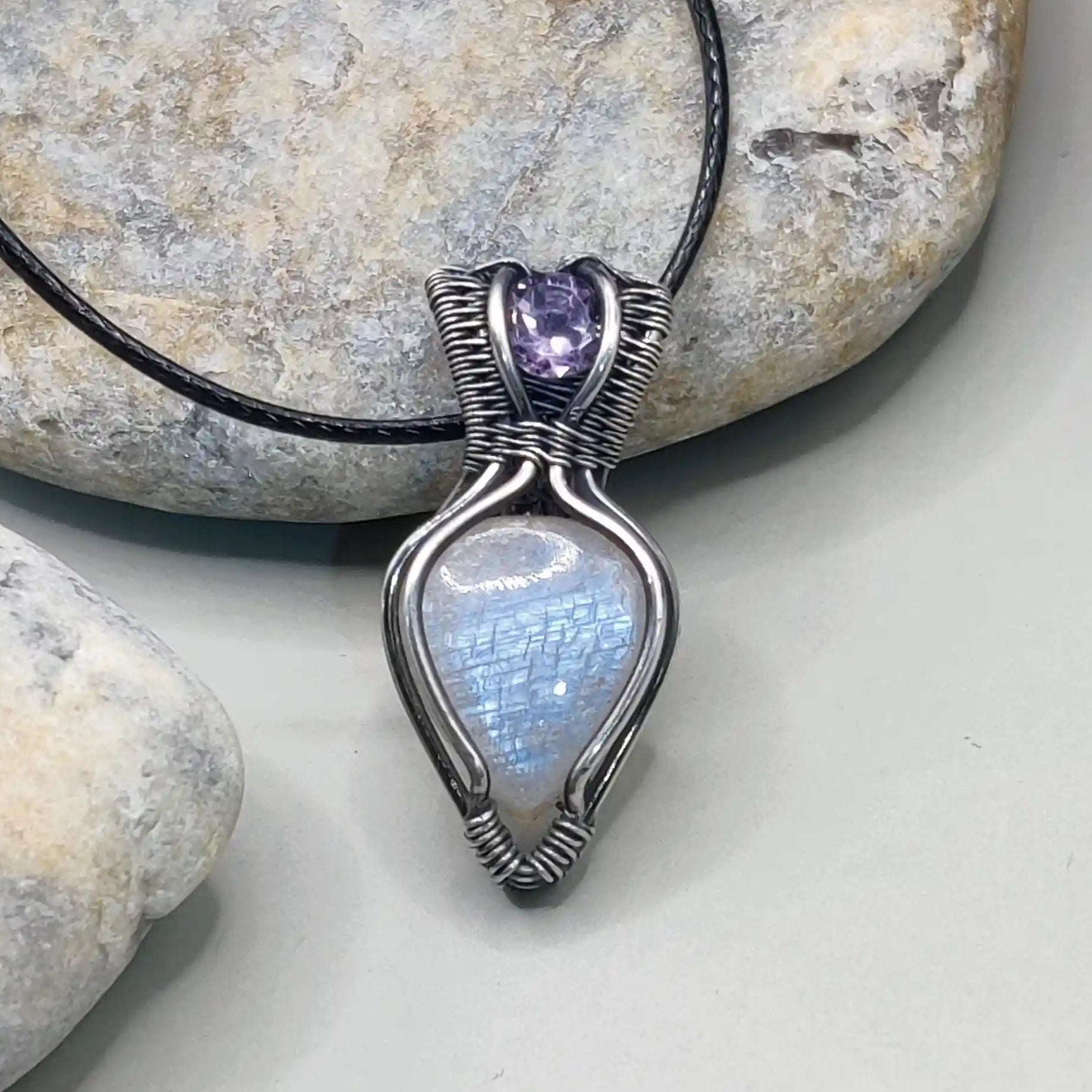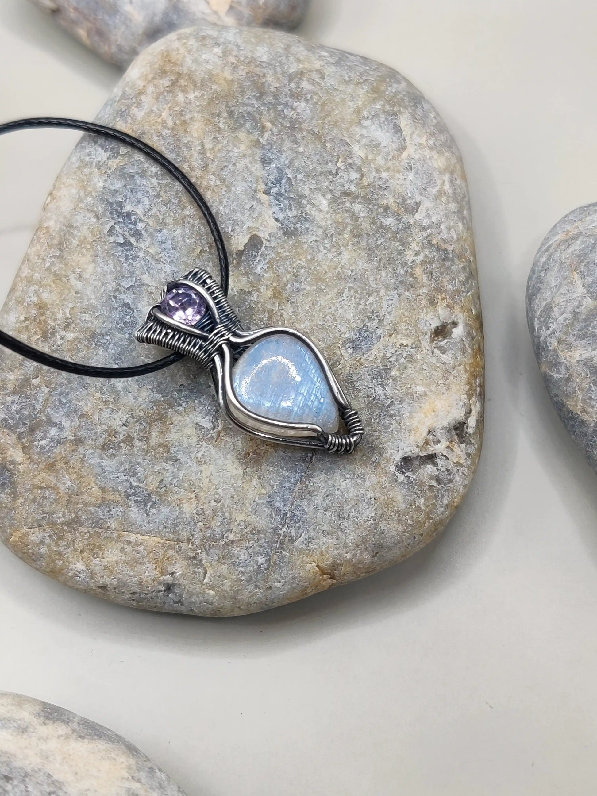 This pendant showcases a natural belomorite moonstone and amethyst, set in intricate sterling silver wirework that highlights their celestial beauty. Its sophisticated yet versatile design makes it perfect for any occasion.