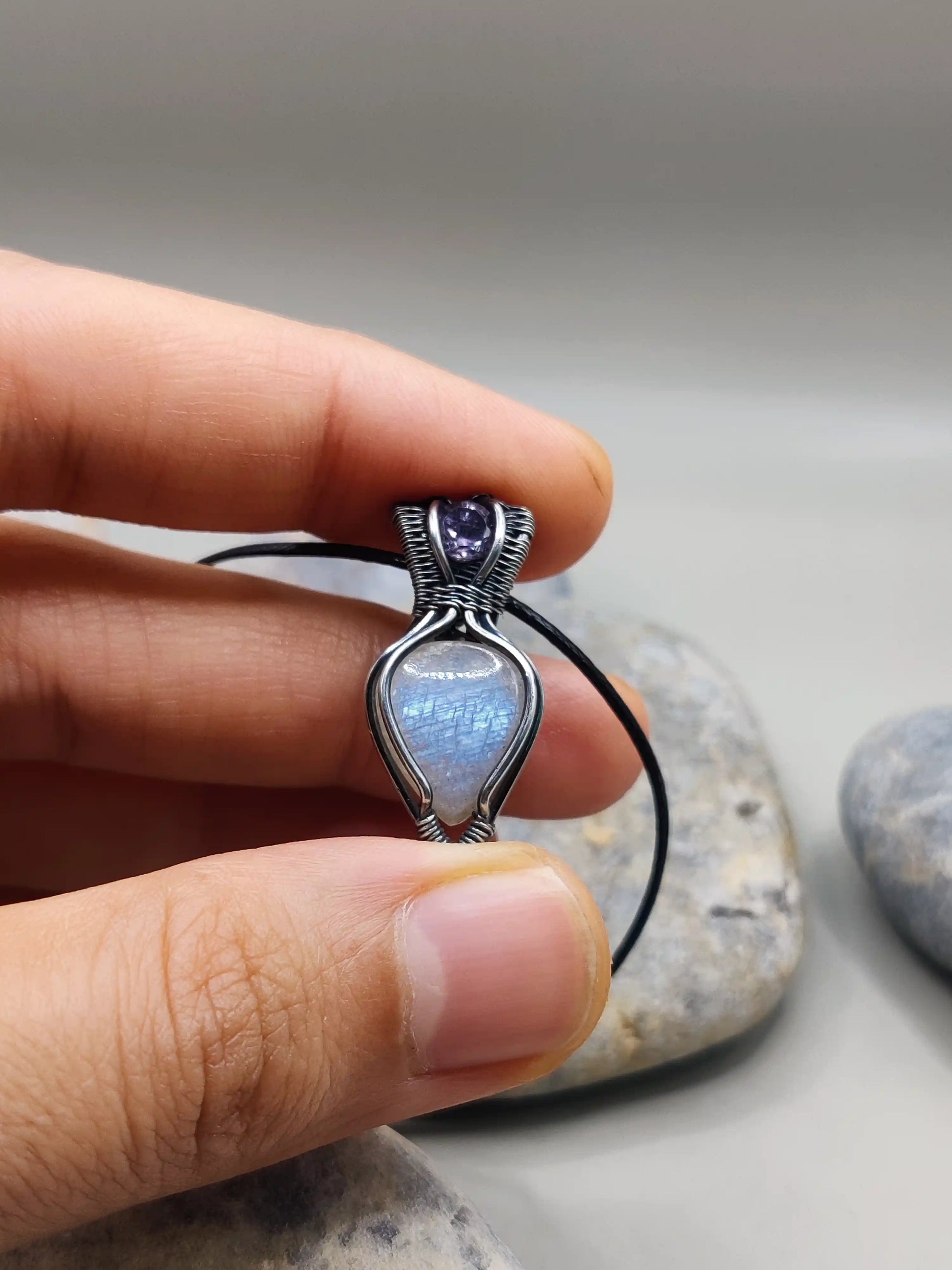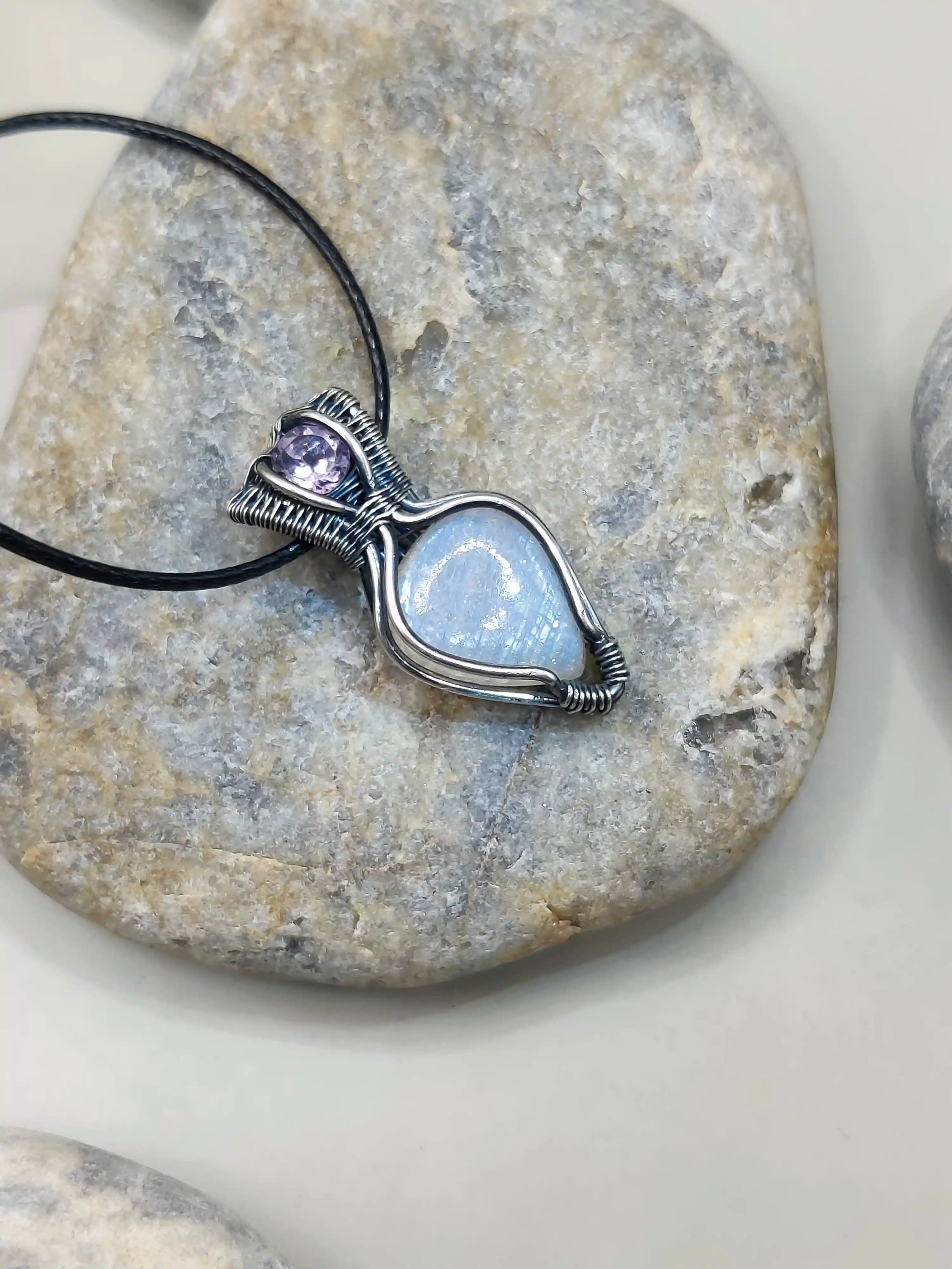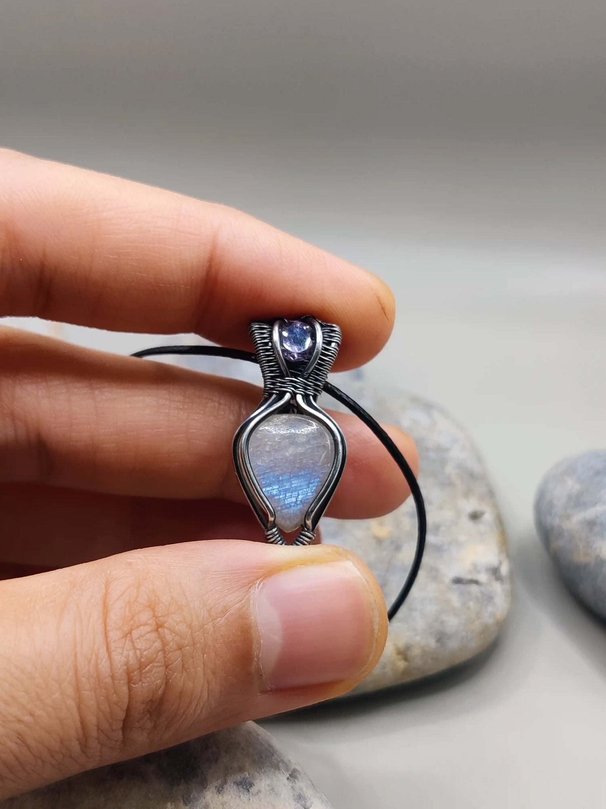 This pendant showcases a natural belomorite moonstone and amethyst, set in intricate sterling silver wirework that highlights their celestial beauty. Its sophisticated yet versatile design makes it perfect for any occasion.