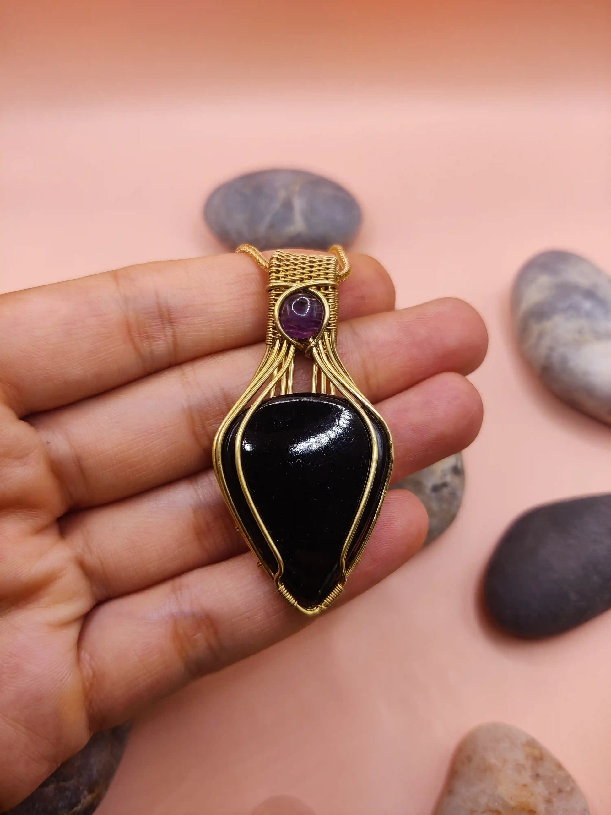 This handcrafted pendant features a raw Black Tourmaline crystal paired with a smaller Amethyst stone, both set in a simple yet striking brass frame and matched with a coordinating brass chain. The design balances raw strength with refined beauty—making it a powerful yet wearable piece for both men and women. This piece is not only jewelry; it is a spiritual tool for grounding, shielding, and mental clarity.