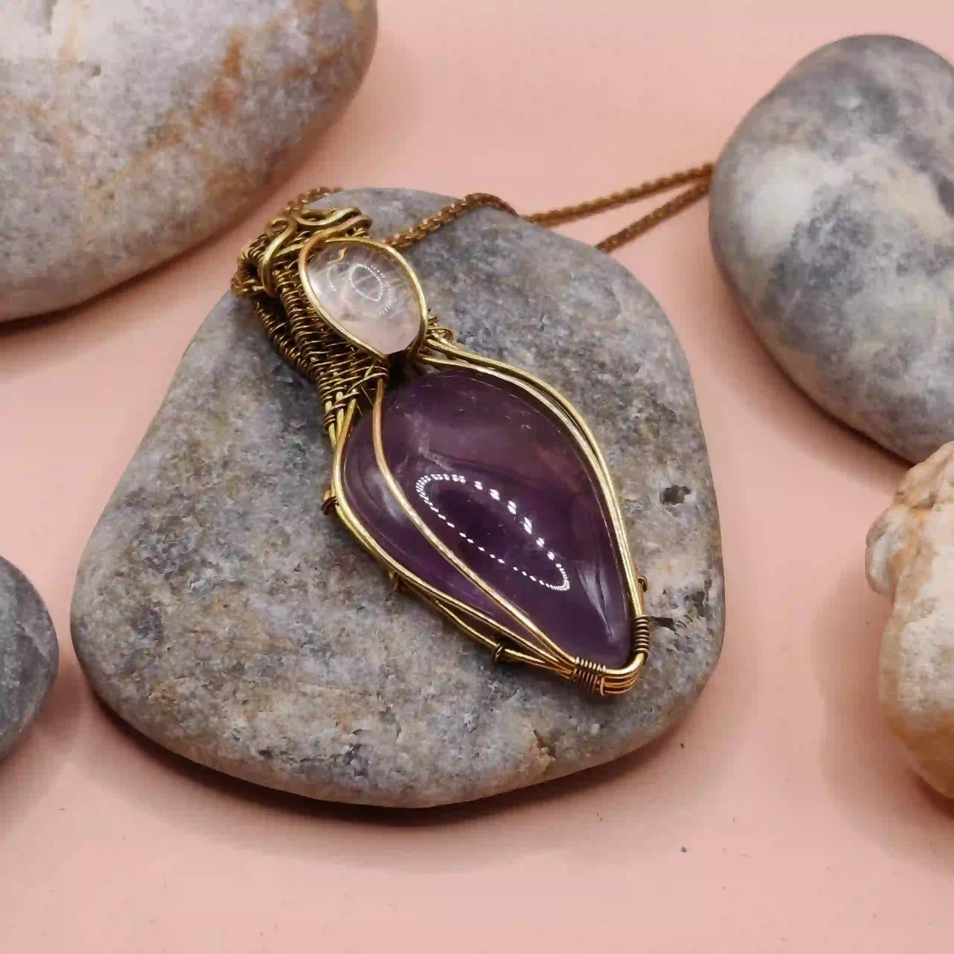 The pendant features stunning amethyst and rose quartz stones set in intricate brass wirework. This combination ensures a cohesive and elegant look, perfect for any occasion.