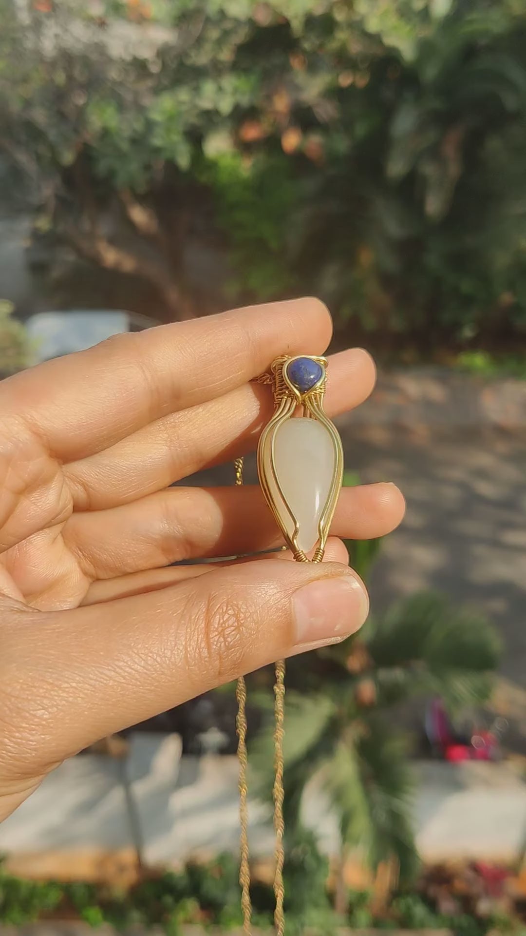 Embrace the harmonious energies of white moonstone, lapis lazuli, and brass with this exquisite necklace, and let it guide you towards a more serene, wise, and balanced life.