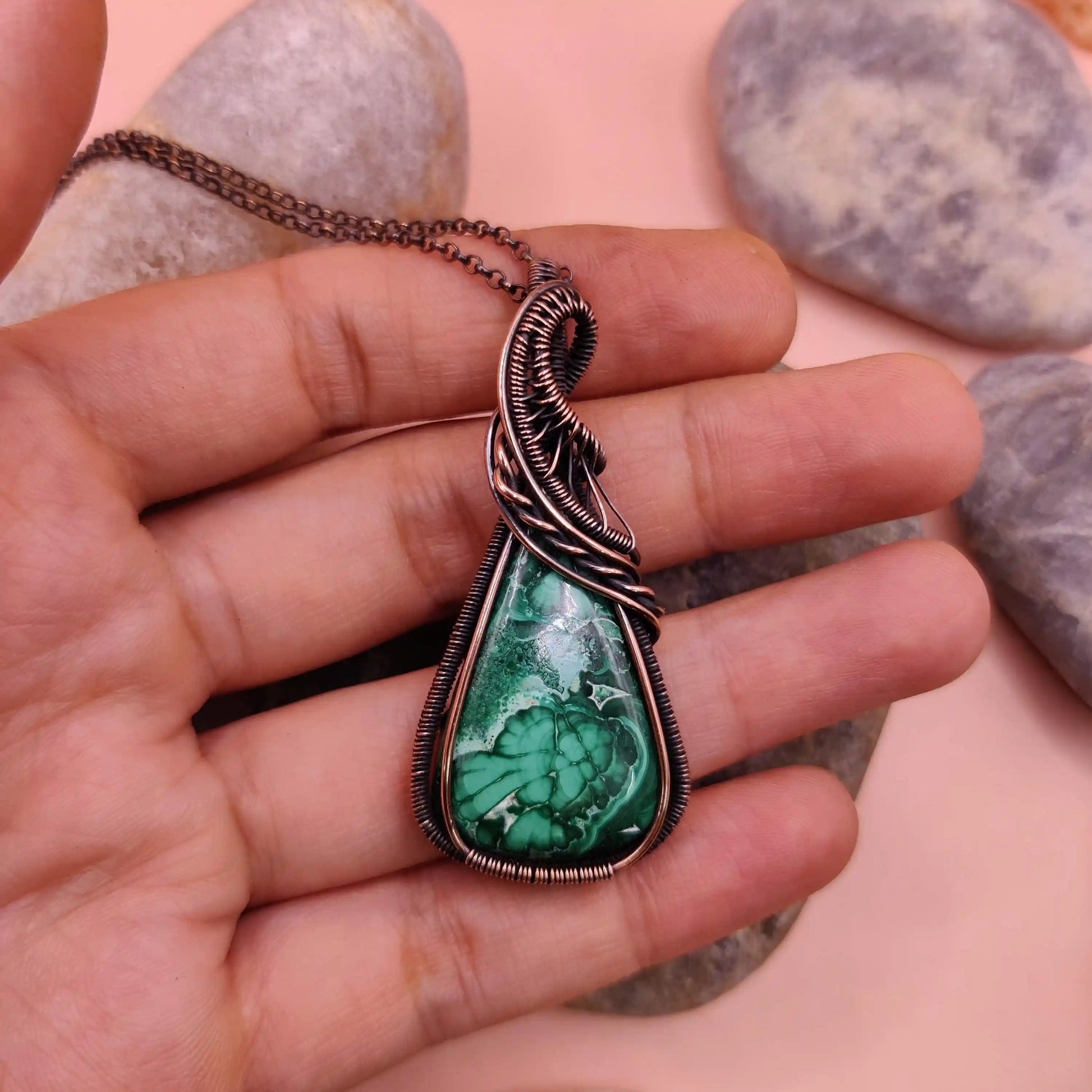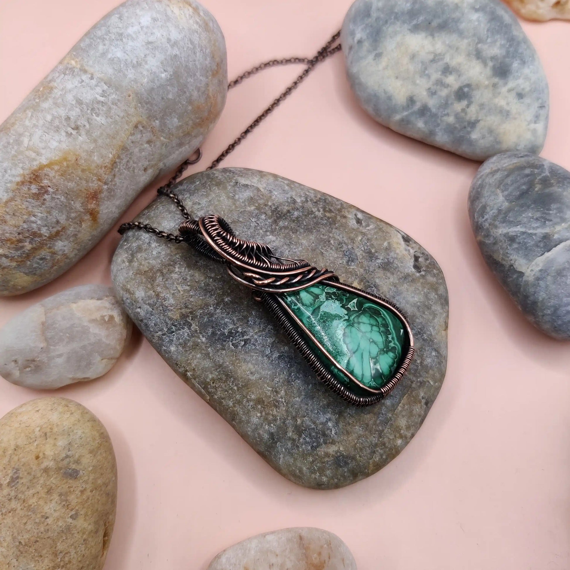 Embrace the protective and grounding energy of original malachite with this meticulously handcrafted oxidized copper necklace. Featuring a striking malachite pendant, this piece is designed for those who seek strength, transformation, and a touch of timeless beauty in their accessories.