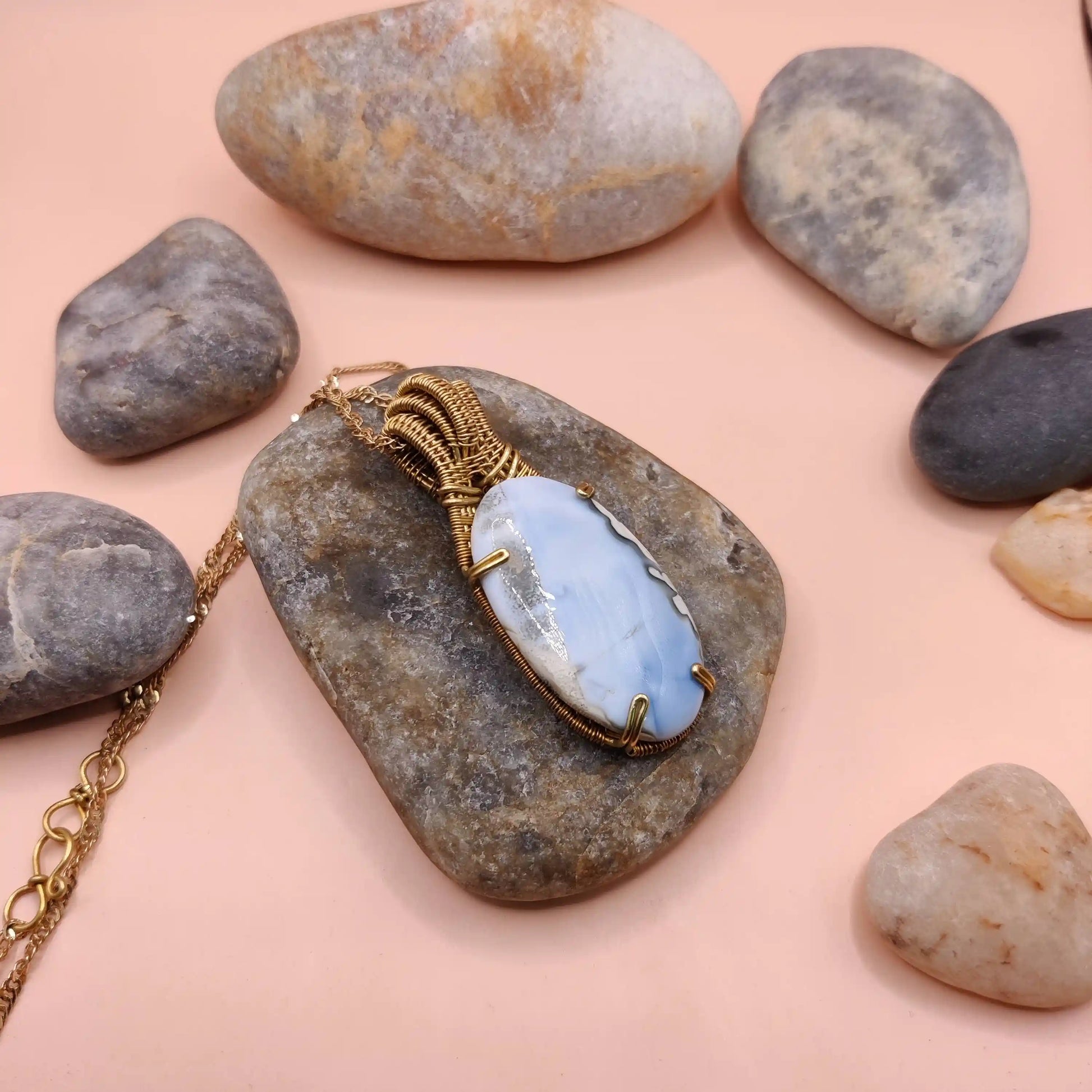 The necklace features a stunning Owyhee Blue Opal stone, elegantly wrapped in brass wire. This fixed-length chain is designed to showcase the pendant beautifully, ensuring a cohesive and elegant look.