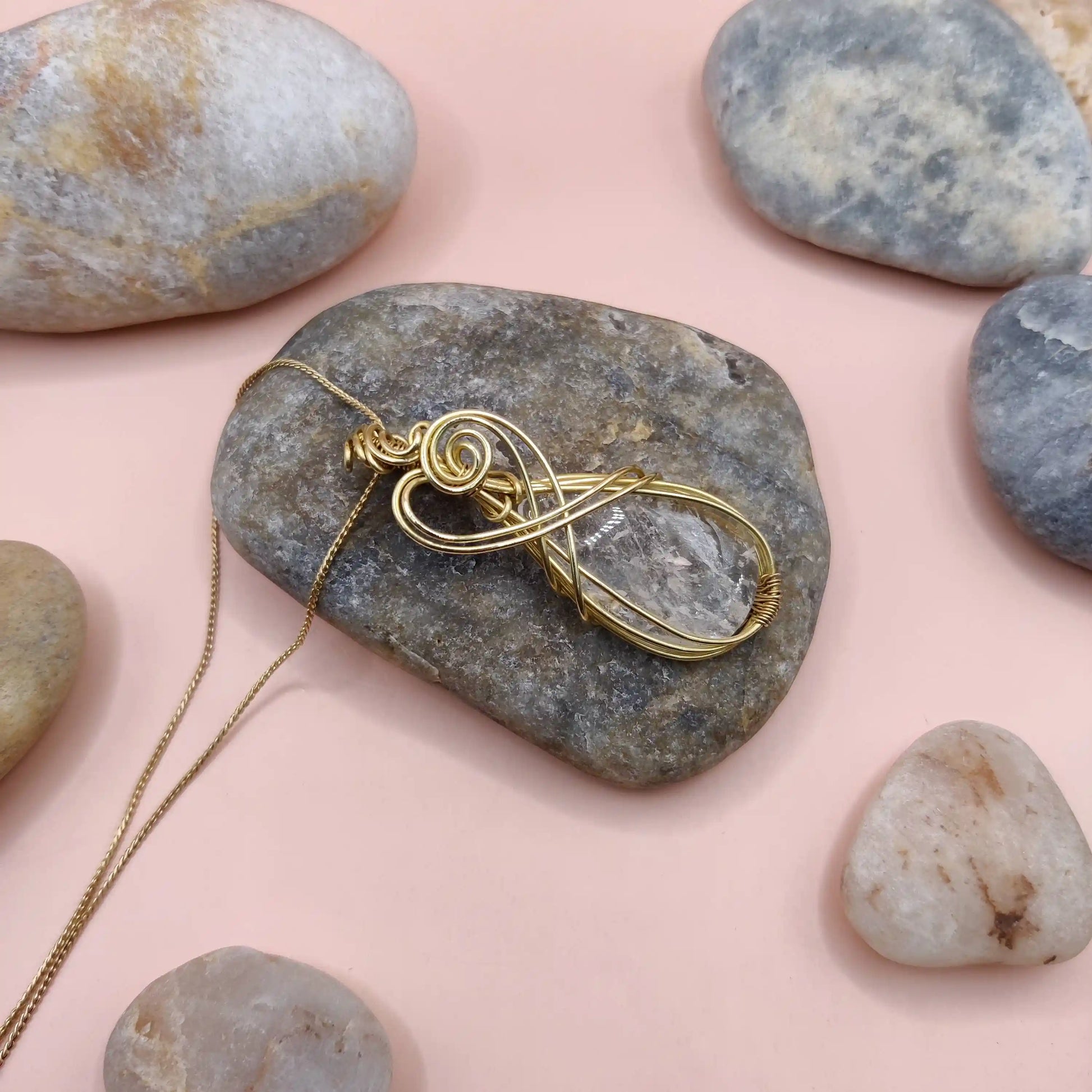 • Handmade with a natural clear quartz pendant and pure brass chain
