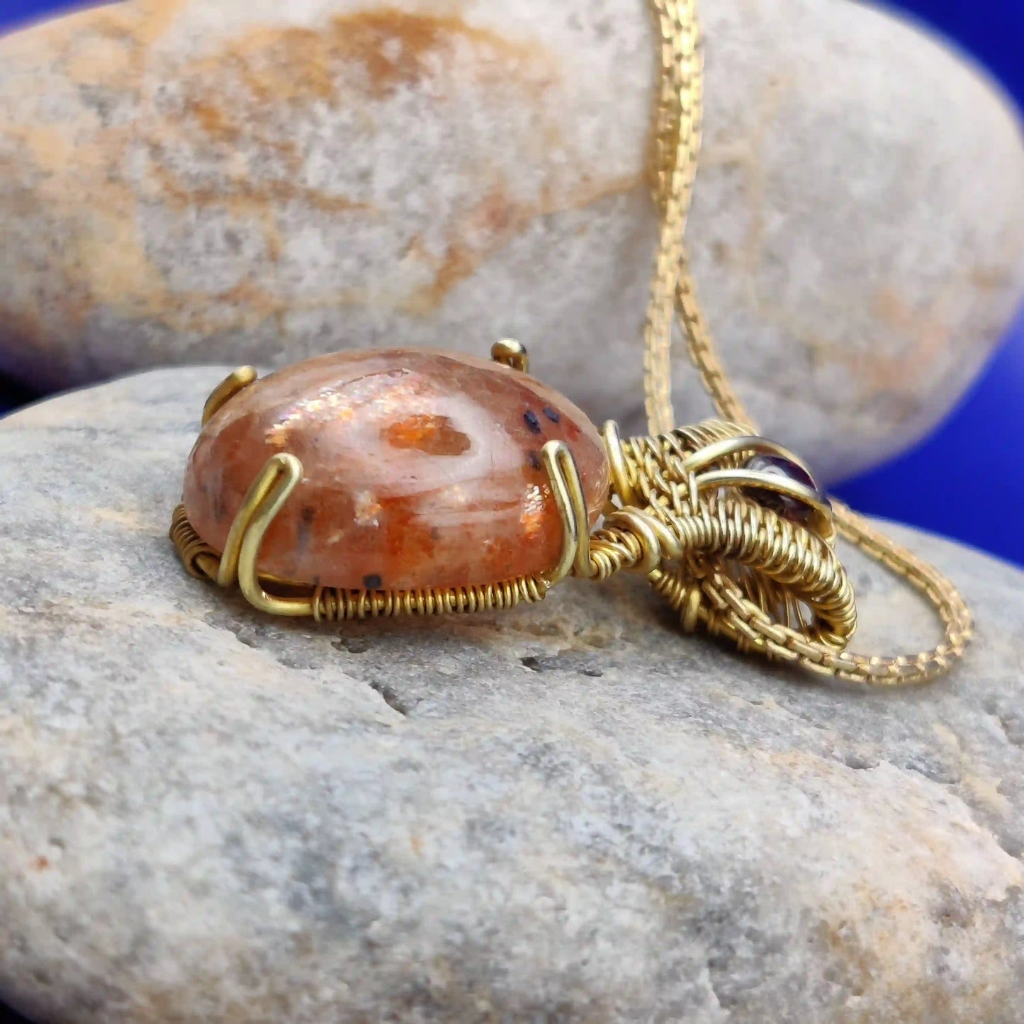 Unleash the vibrant energy within with this captivating necklace featuring a sunstone, known for its uplifting properties, nestled alongside a fiery garnet, associated with passion and empowerment. Both stones are lovingly hand-wrapped in gleaming brass wire, creating a radiant piece bursting with positive energy.