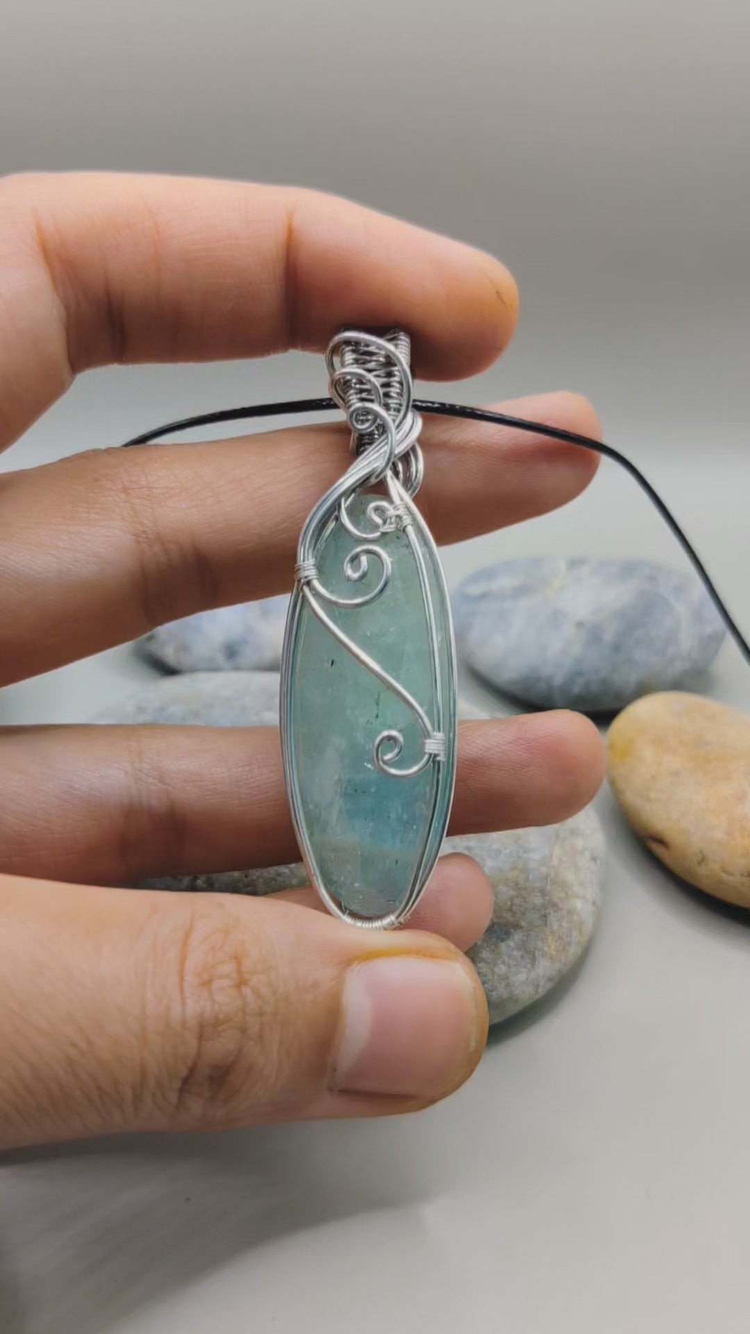 A serene aquamarine stone, wrapped in lustrous silver wire, creates a delicate necklace. This calming gem is said to promote tranquility, making it a perfect everyday accessory or thoughtful gift.