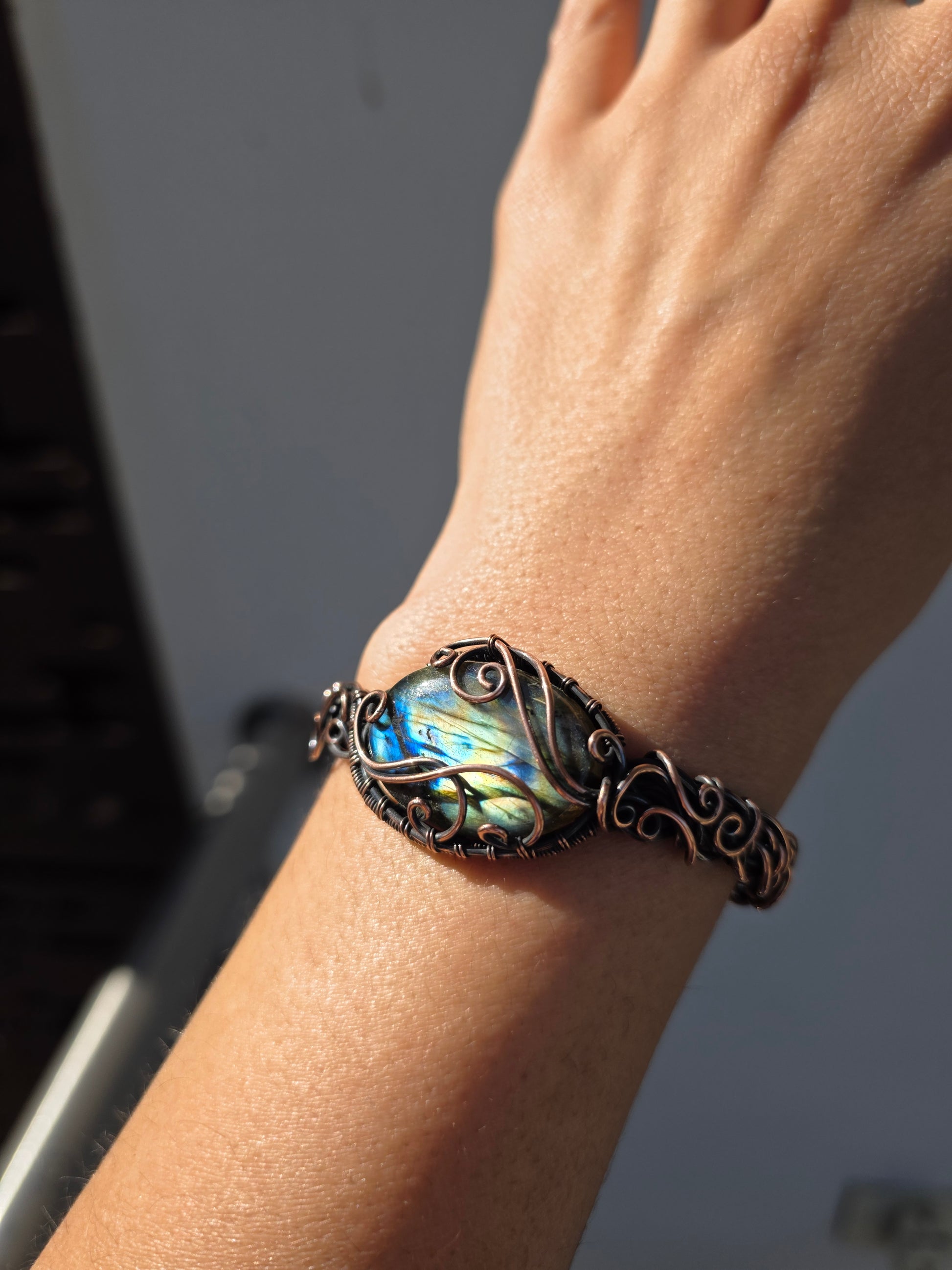 Let the mystical energy of labradorite and the grounding power of copper guide you on a journey of self-discovery, intuition, and empowerment. This extraordinary cuff bracelet is more than just an accessory—it is a talisman of strength and transformation.
