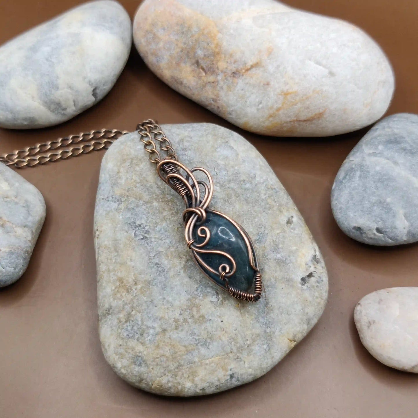 • Handmade with a natural fluorite pendant and pure copper chain or cord