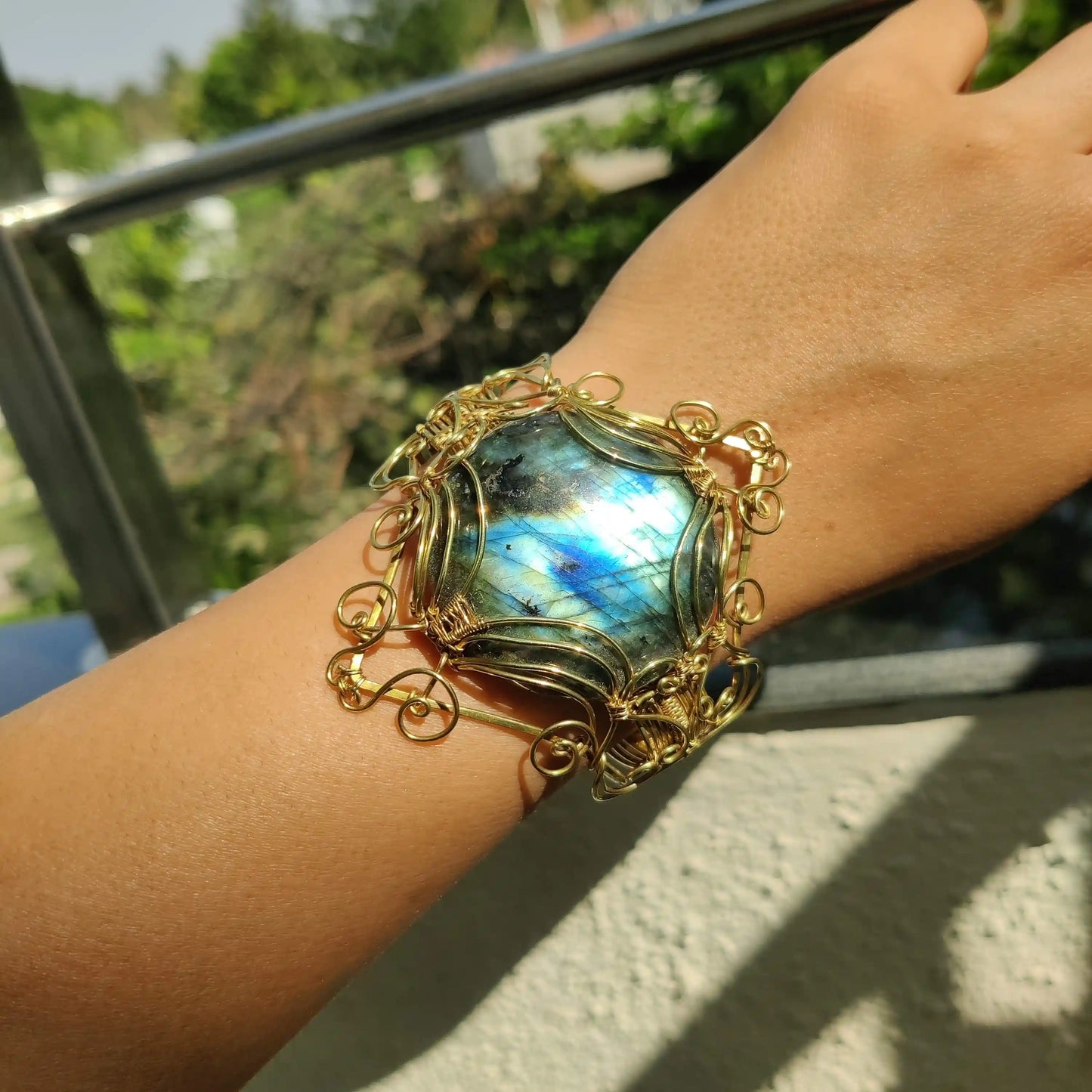 Let the mystical energy of labradorite and the grounding strength of brass guide you on a journey of intuition, transformation, and empowerment. This extraordinary cuff bracelet is more than just an accessory—it is a talisman of strength and timeless beauty.