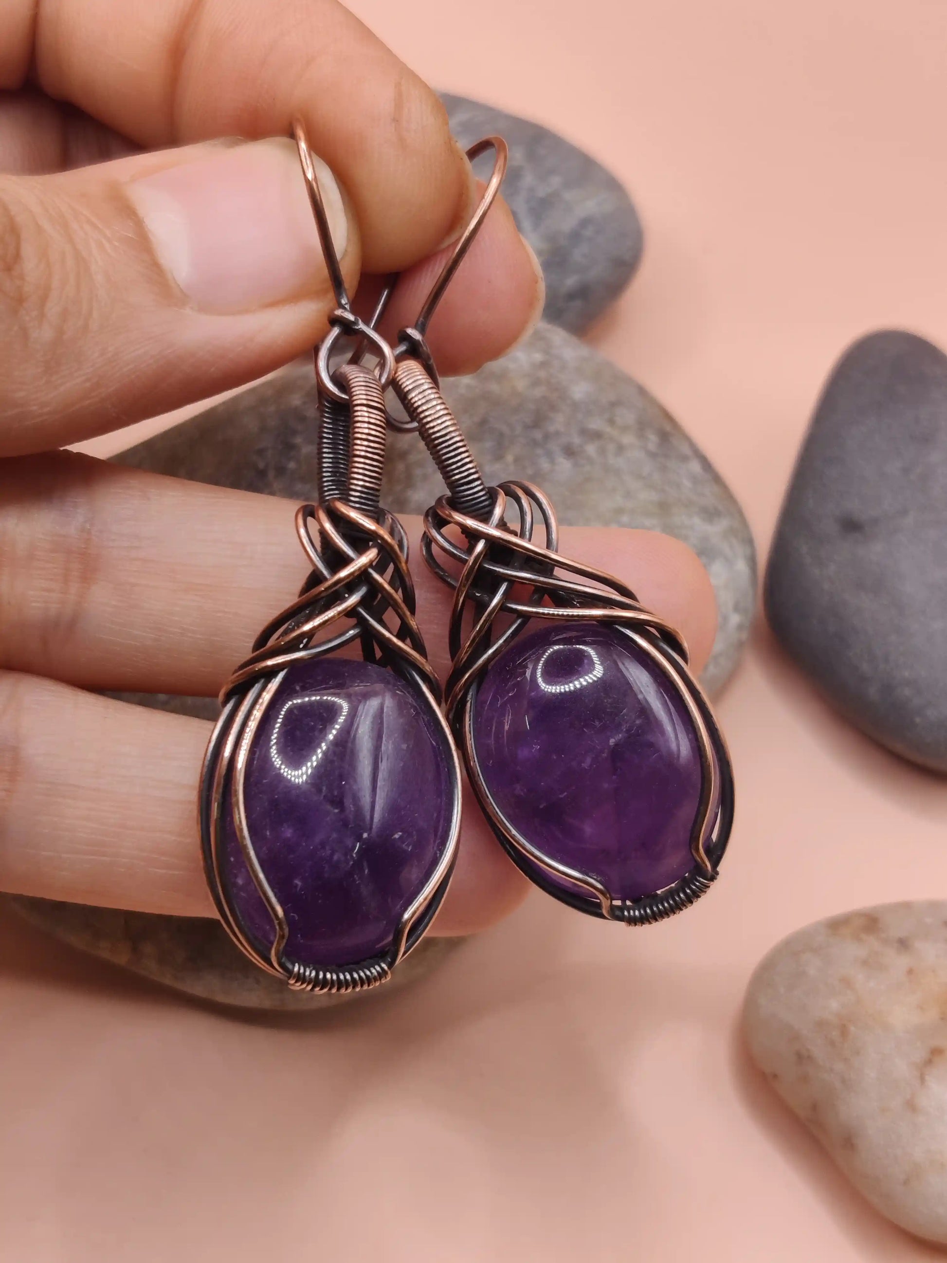Copper has long been used in spiritual practices for its ability to channel and enhance energy flow. In these earrings, copper not only complements the tone of the Amethyst but also: