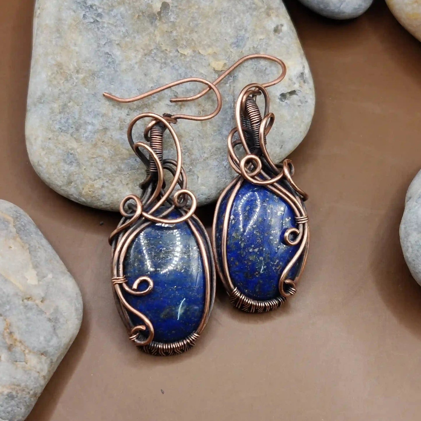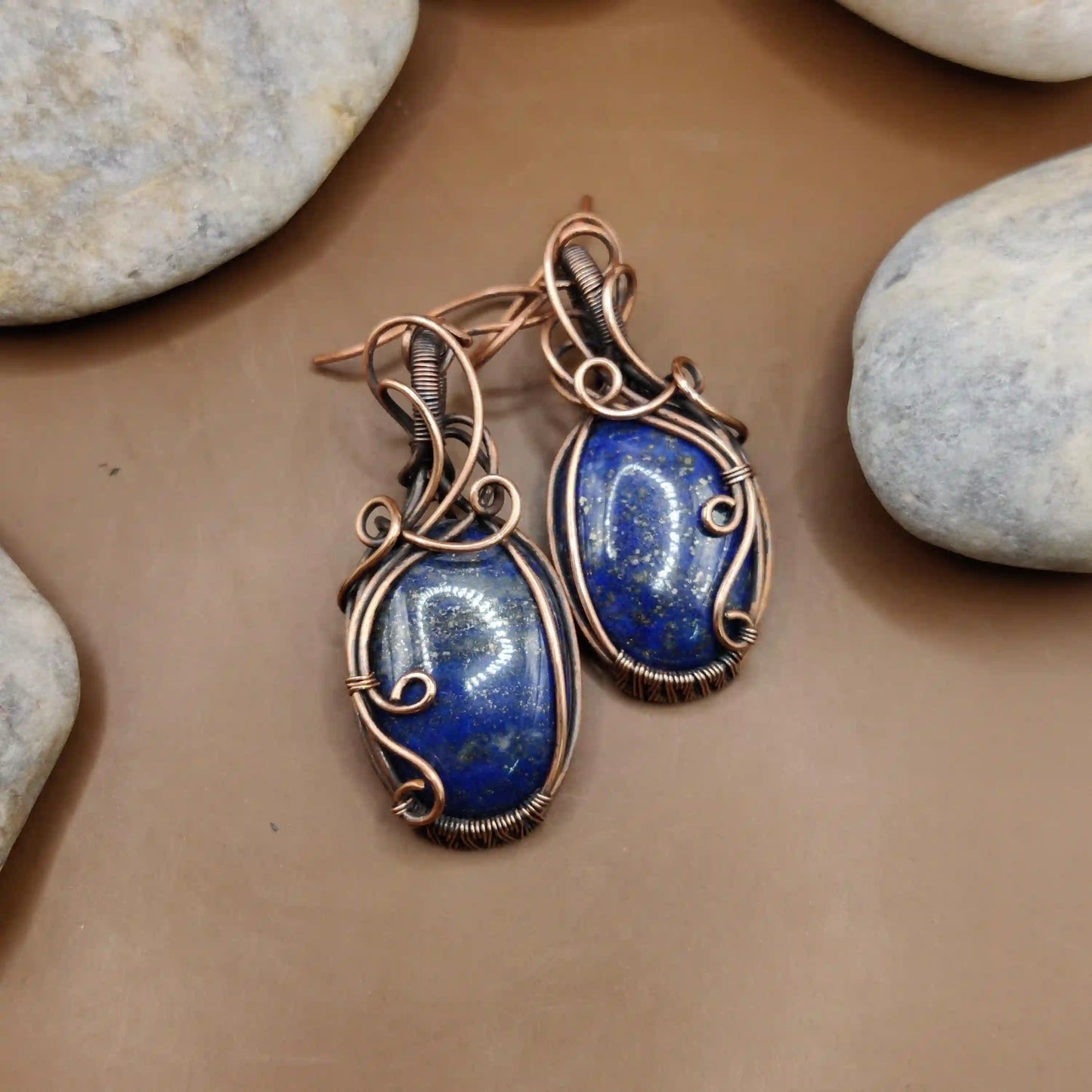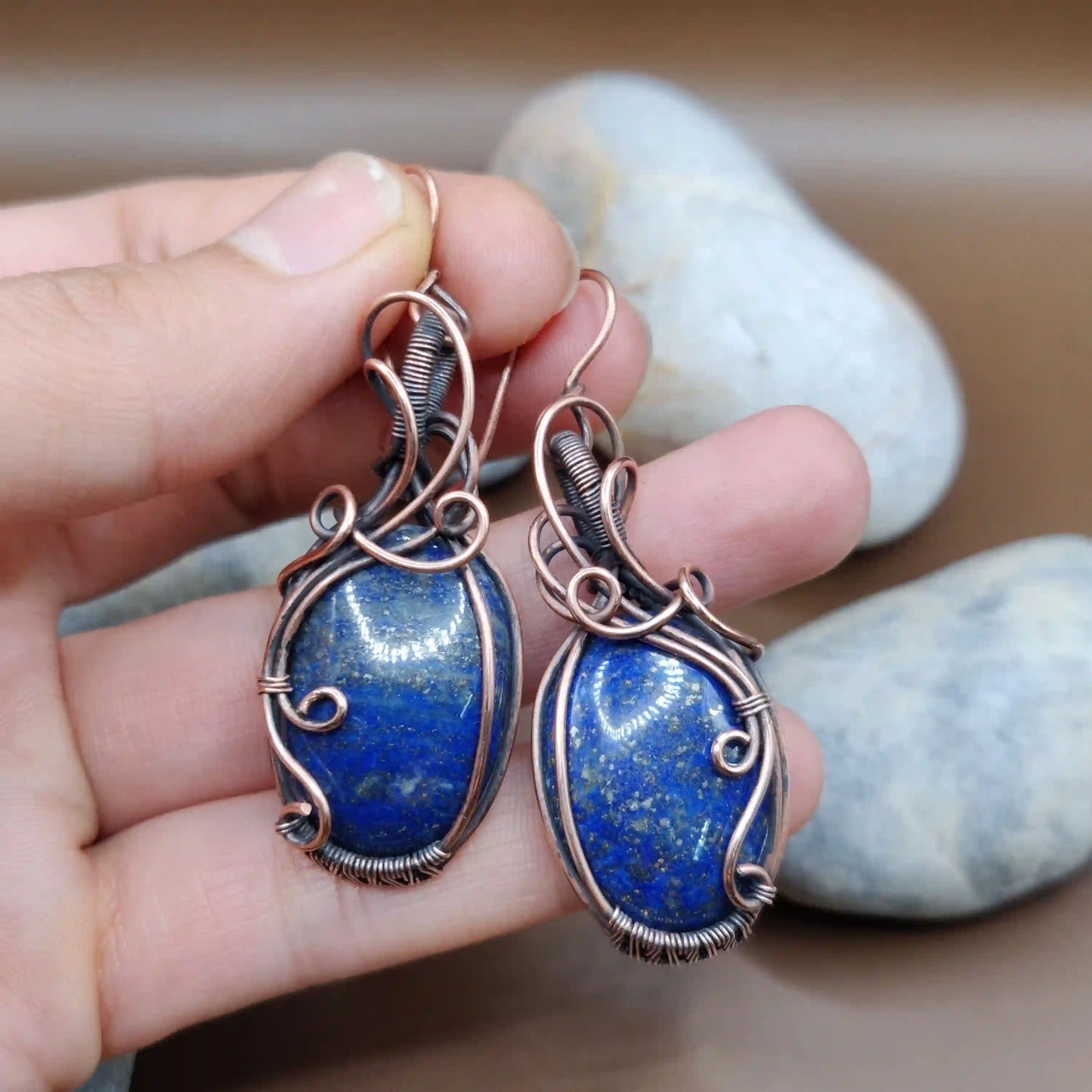 Deep blue lapis lazuli, believed to promote truth and self-awareness, is artfully wrapped in oxidized copper. These bohemian earrings add a touch of magic to your look while fostering emotional balance and spiritual connection.
