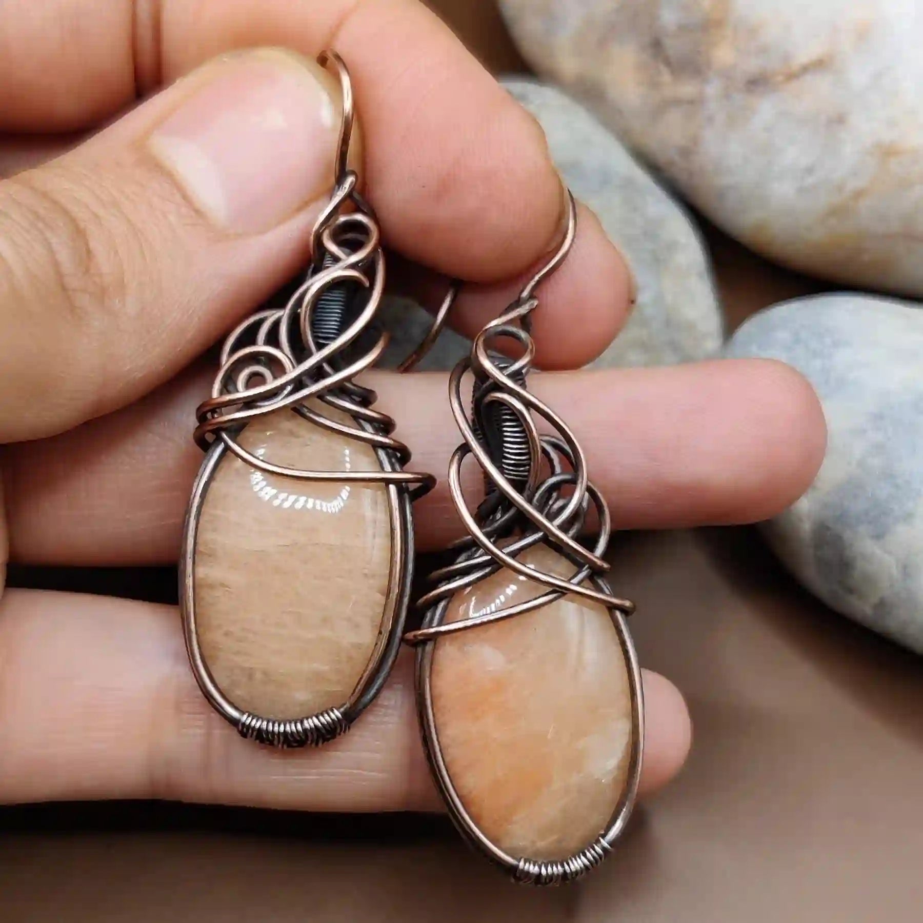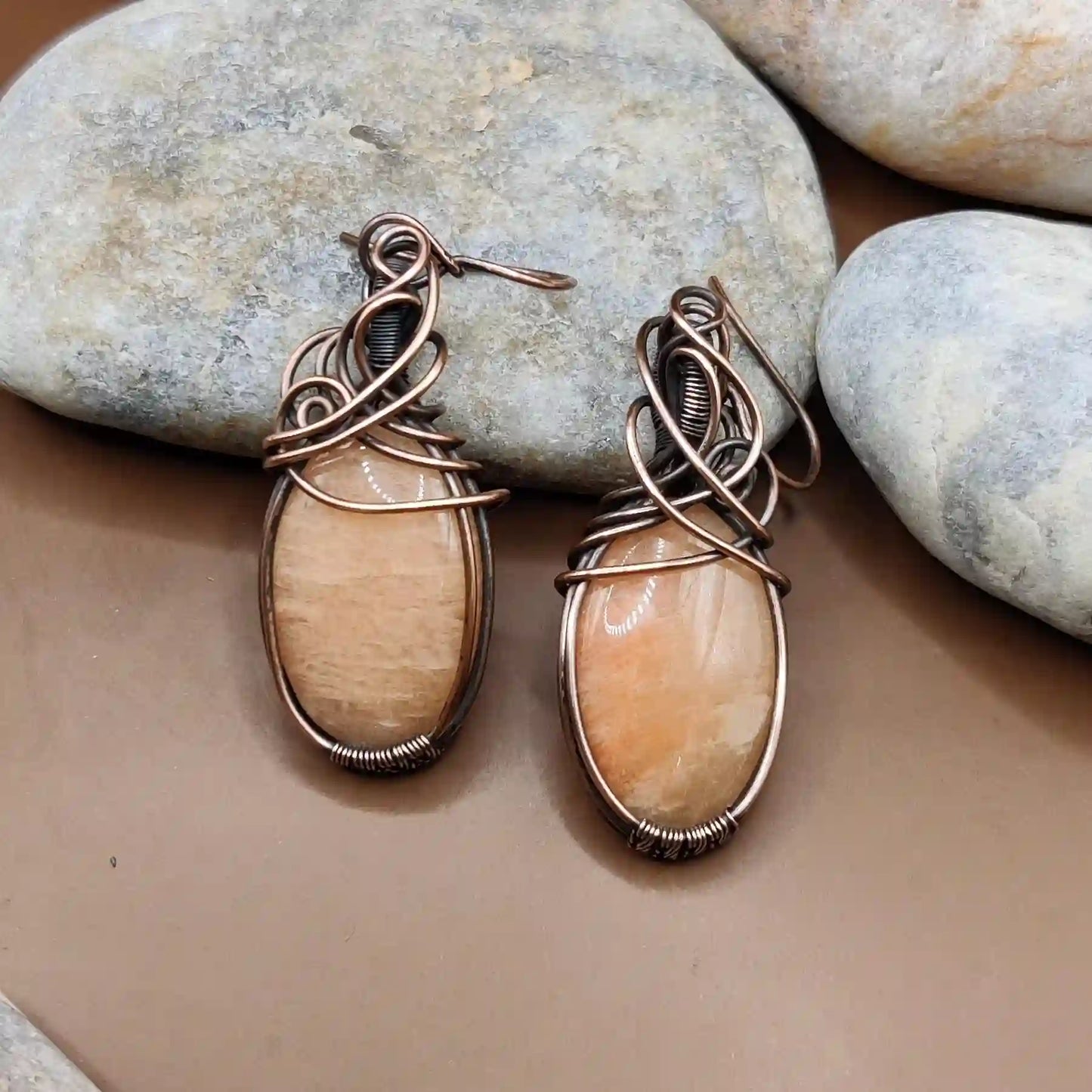 The earrings feature stunning amazonite stones complemented by intricate copper wirework. This combination ensures a cohesive and elegant look, perfect for any occasion.
