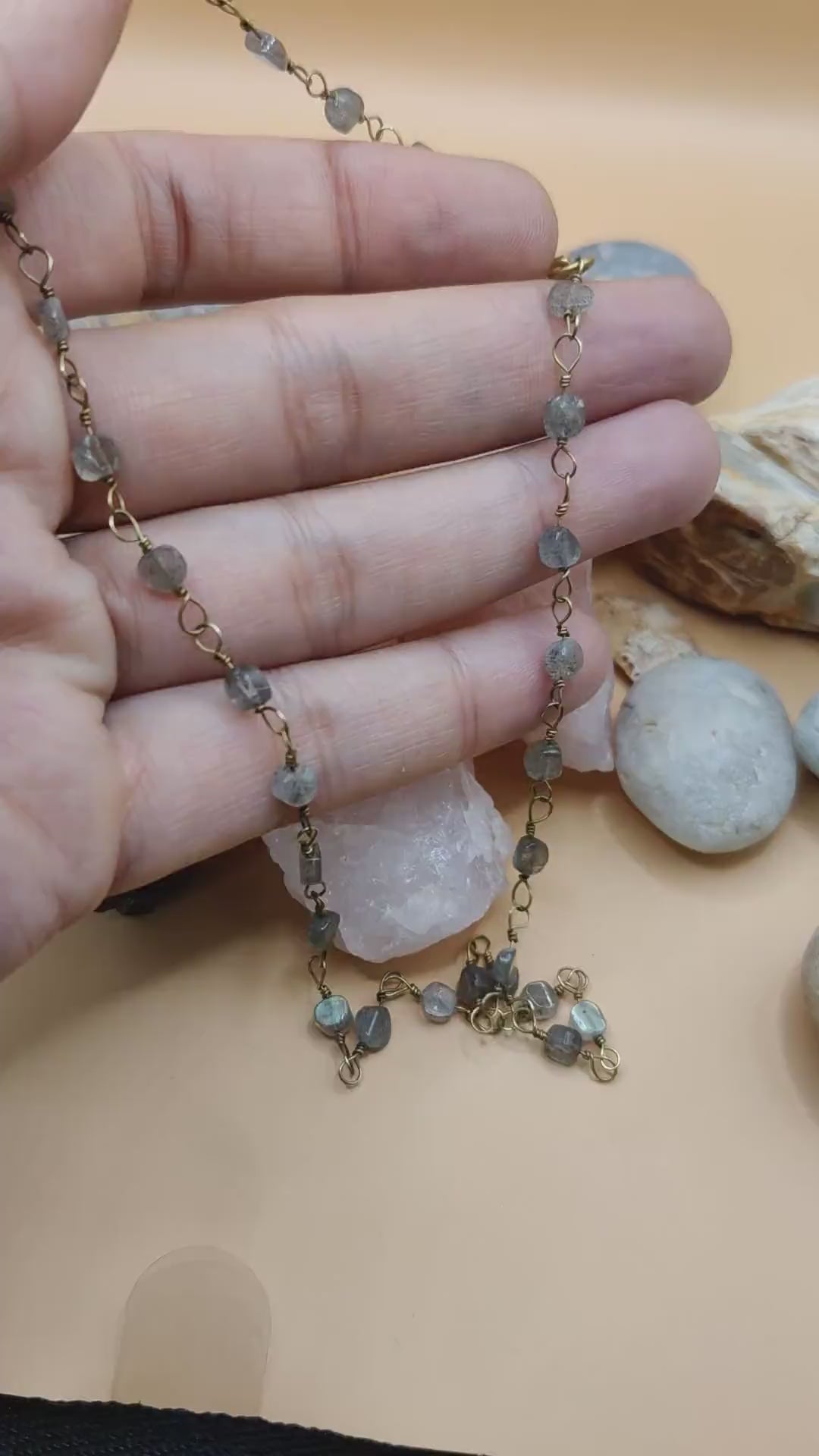 Discover the perfect fusion of natural elegance and spiritual wellness with our Handmade Brass Chain with Labradorite Beads. Each piece is meticulously crafted to highlight the unique properties of labradorite, along with the warm, timeless appeal of brass, creating a harmonious accessory that is as beautiful as it is beneficial.