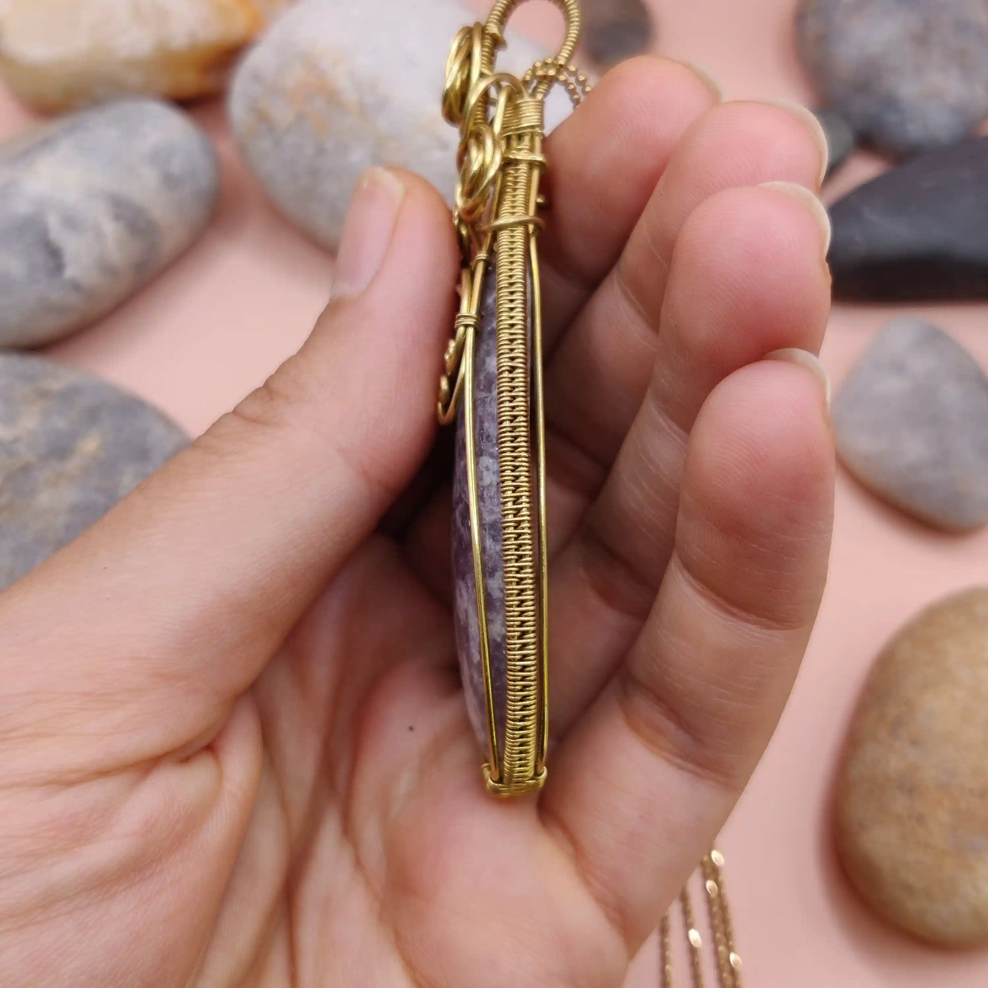This necklace showcases a natural lepidolite pendant wrapped in brass wirework, complemented by a matching brass chain. The minimalist yet striking design makes it a versatile accessory.