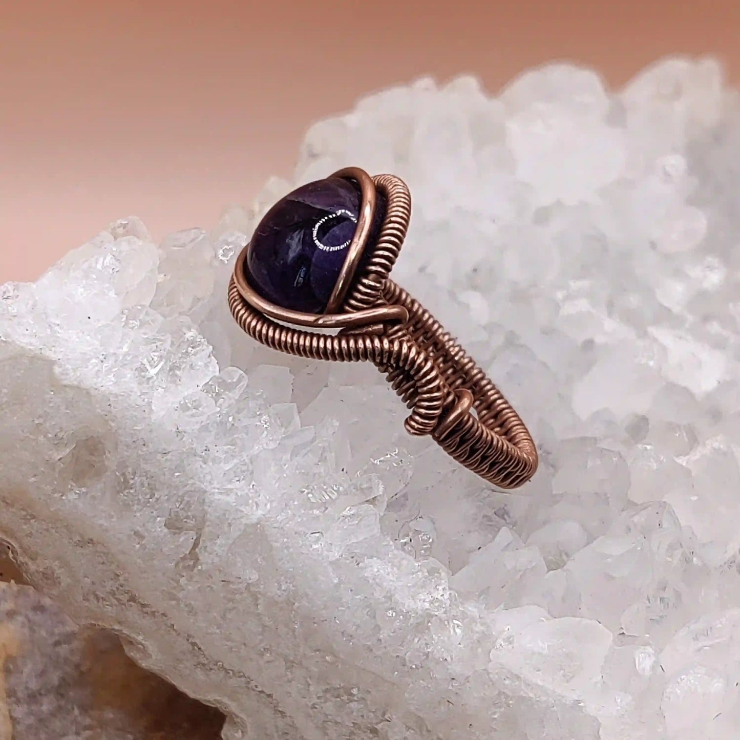 The ring features a stunning natural amethyst stone set in intricate copper wirework. This combination ensures a cohesive and elegant look, perfect for any occasion.