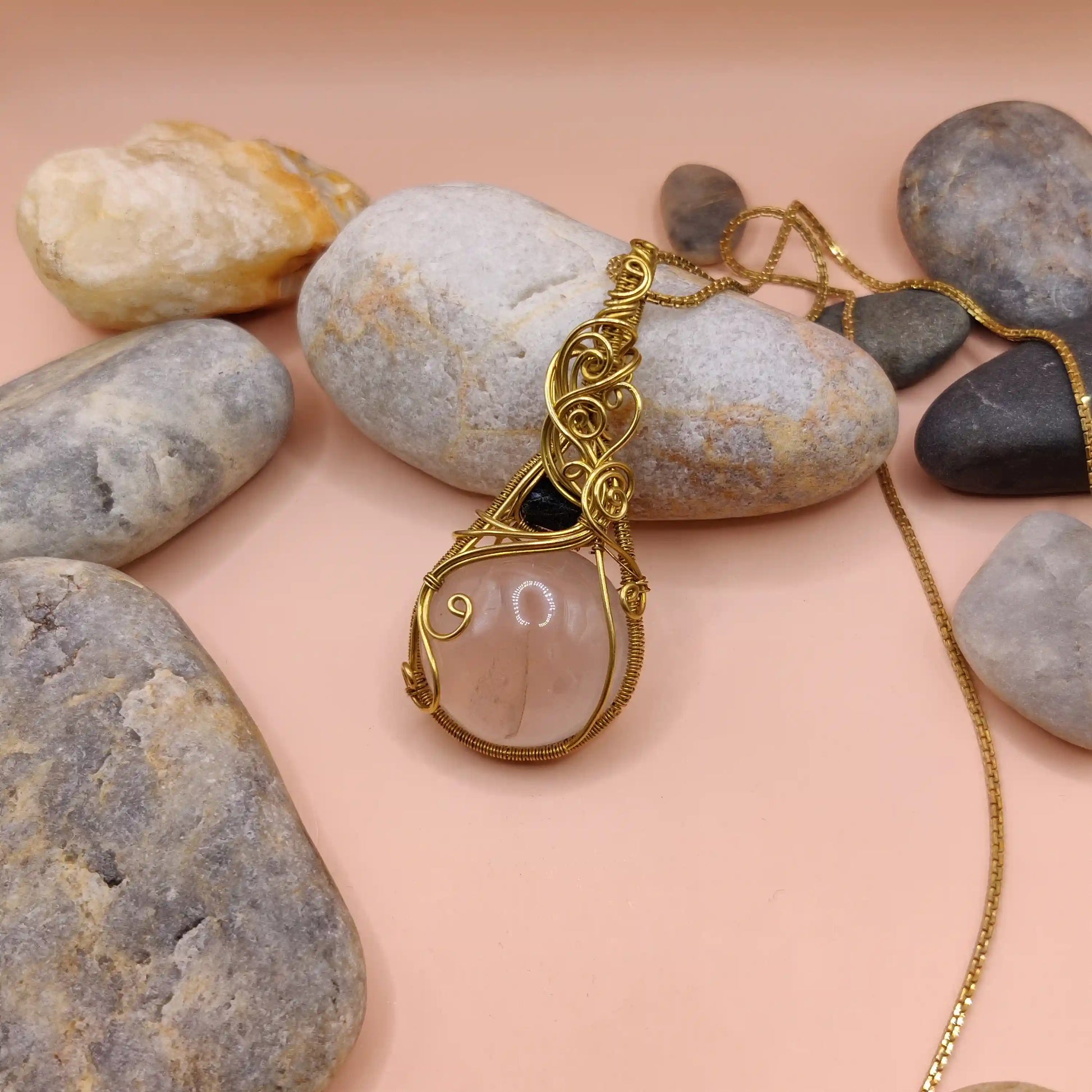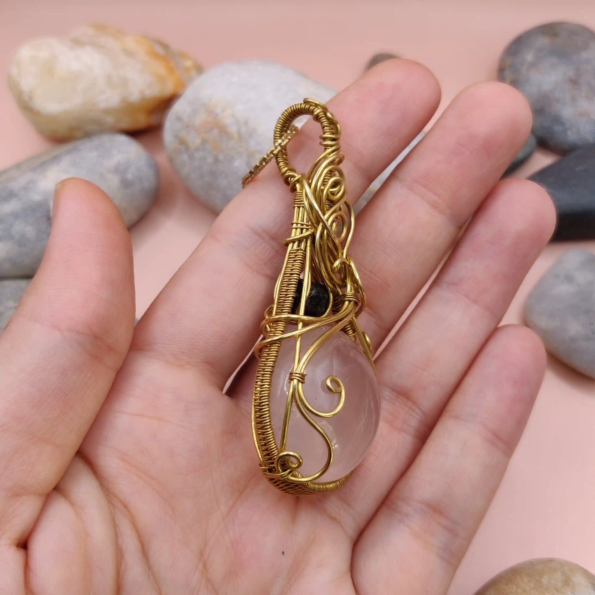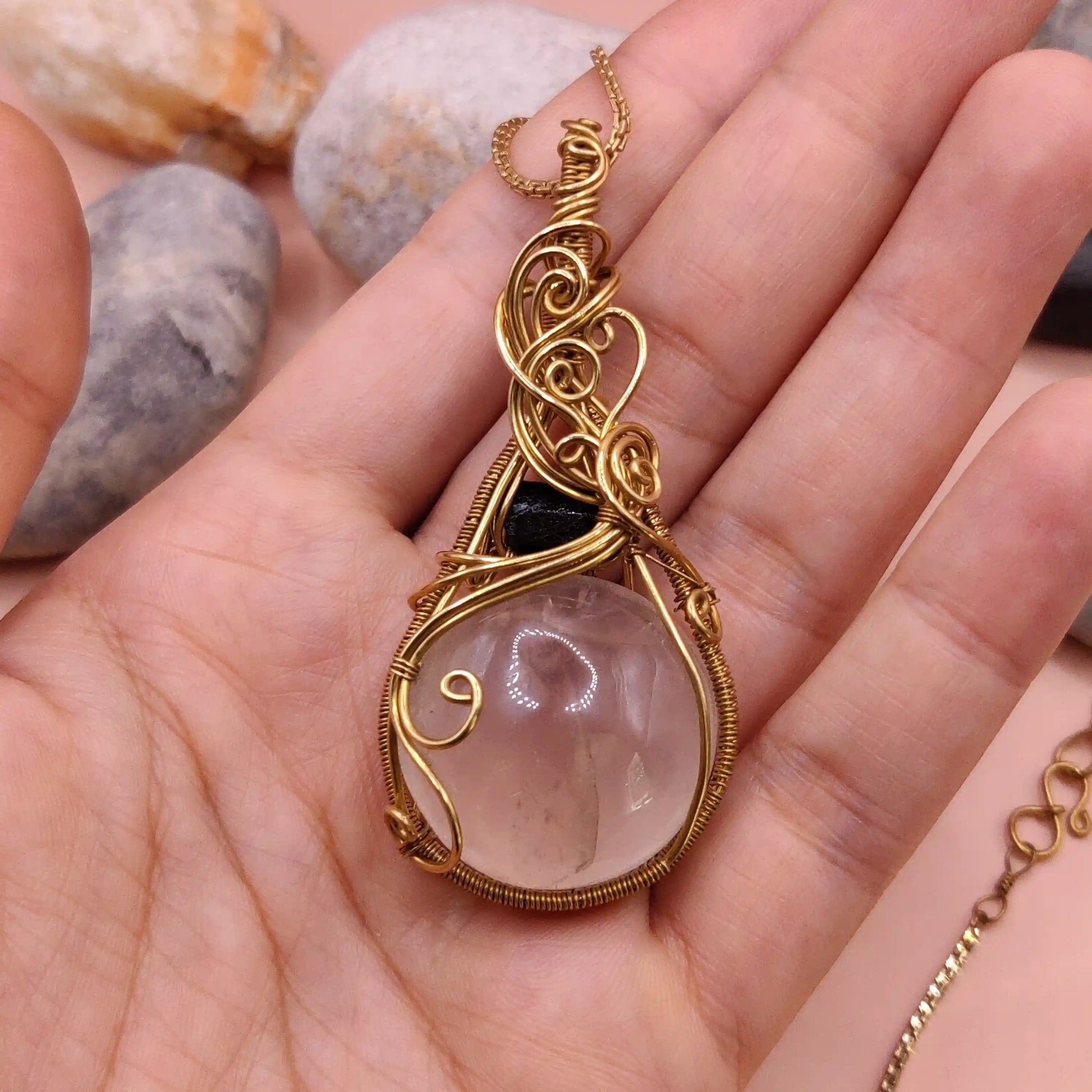 This elegant handcrafted pendant features a large, soft pink Rose Quartz cabochon nestled in a warm brass setting, accentuated with a small raw Black Tourmaline crystal. The intricate brasswork adds a vintage charm, while the combination of these two powerful stones creates a talisman that nurtures the heart while shielding the spirit. Paired with a matching brass chain, this necklace offers both grace and grounded strength.