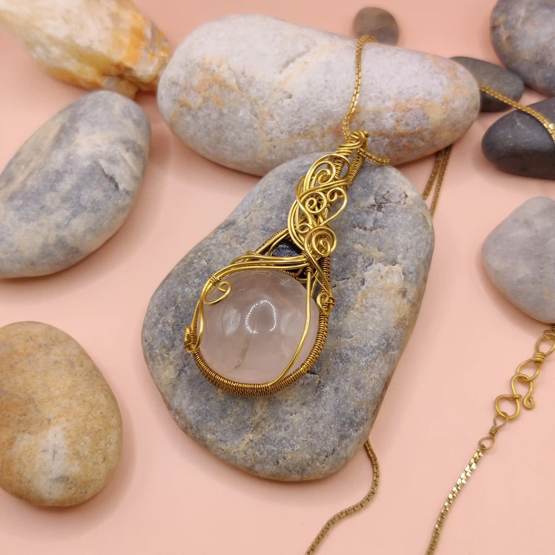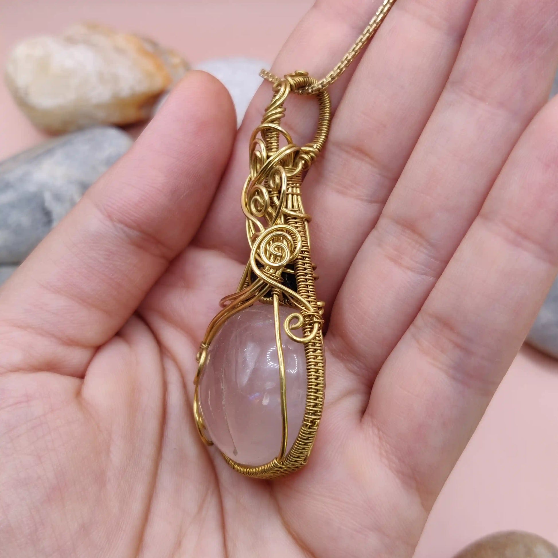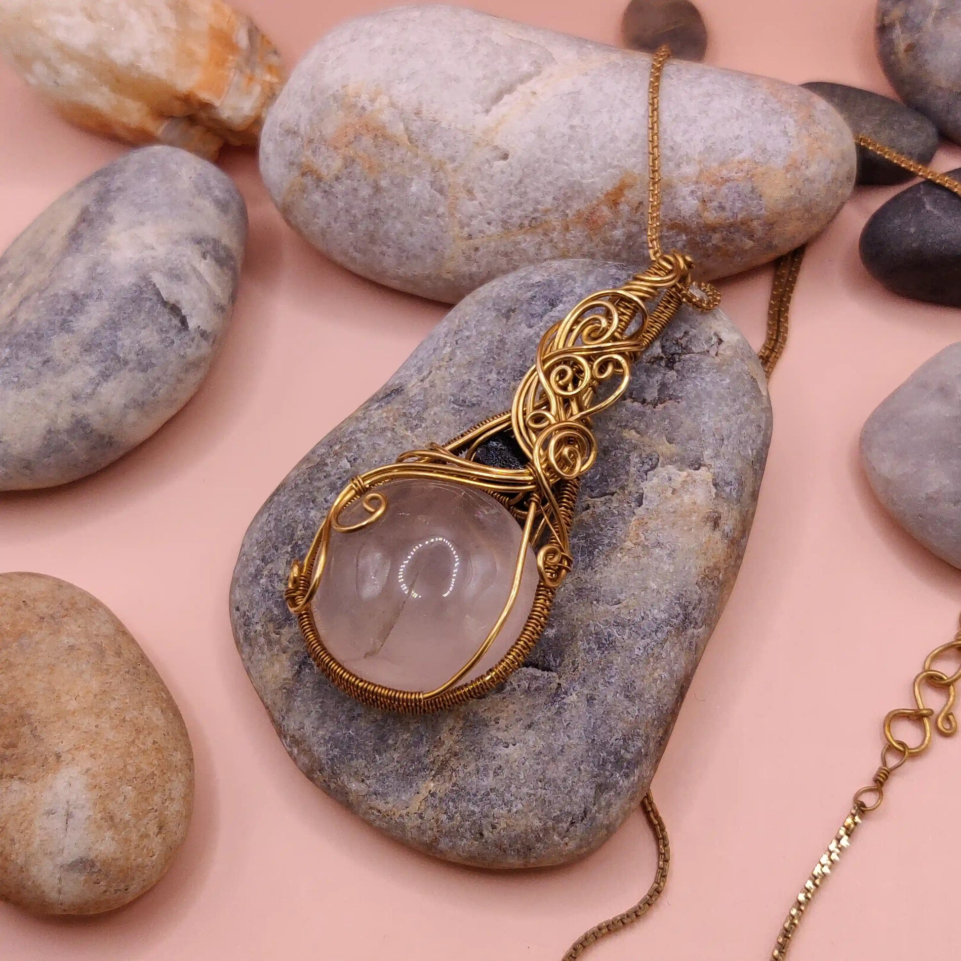 This elegant handcrafted pendant features a large, soft pink Rose Quartz cabochon nestled in a warm brass setting, accentuated with a small raw Black Tourmaline crystal. The intricate brasswork adds a vintage charm, while the combination of these two powerful stones creates a talisman that nurtures the heart while shielding the spirit. Paired with a matching brass chain, this necklace offers both grace and grounded strength.
