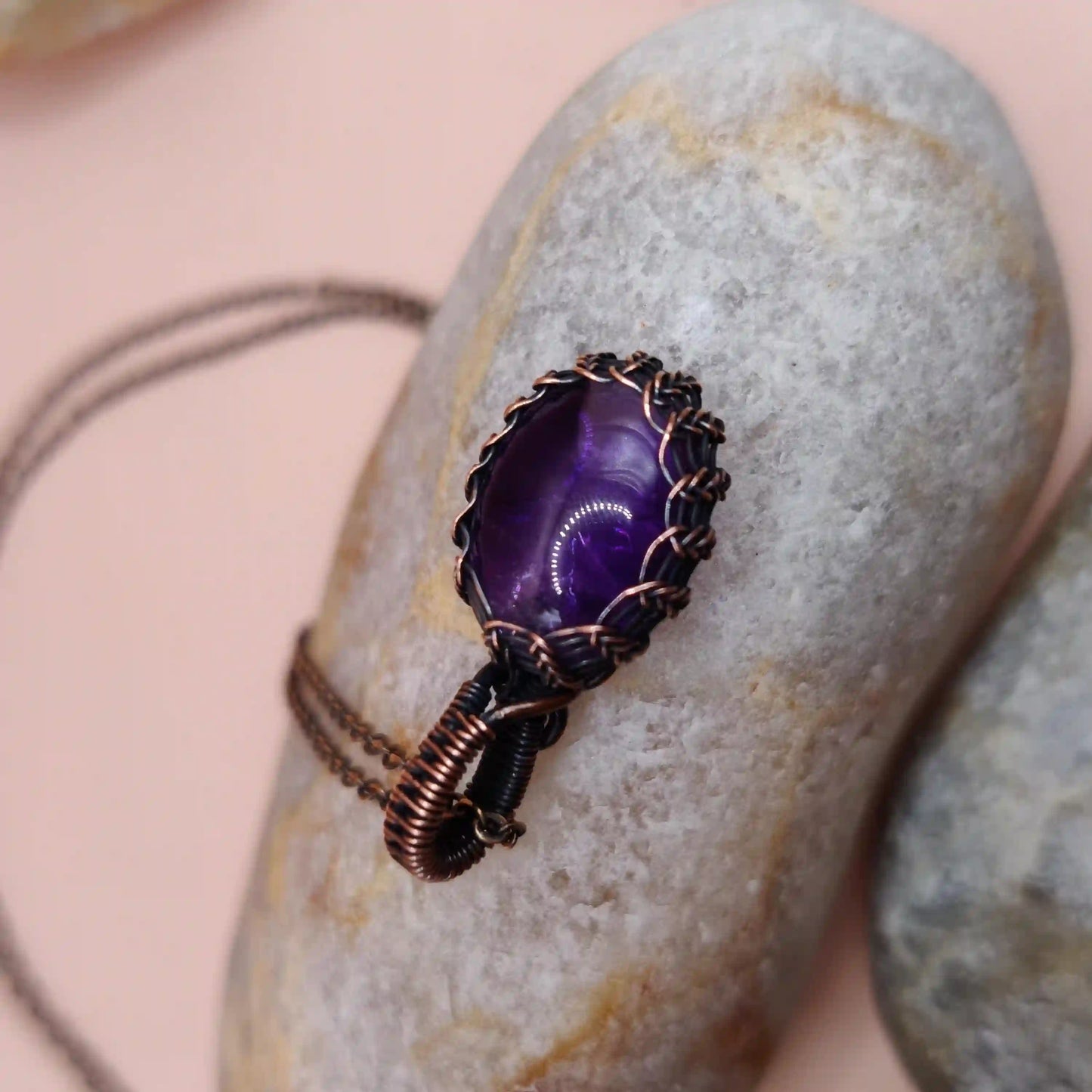 Adorned with Amethyst, the stone of tranquility, this necklace, wrapped in oxidized copper wire, offers a touch of elegance and potential healing. Amethyst is believed to promote relaxation, reduce stress and anxiety, and improve sleep quality. It may also bring inner peace and harmony.