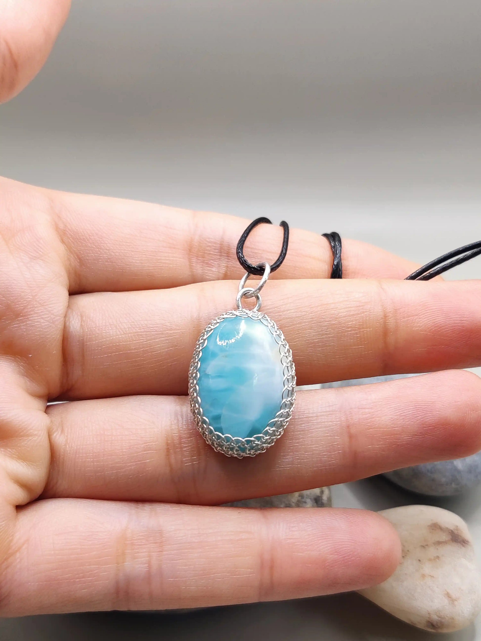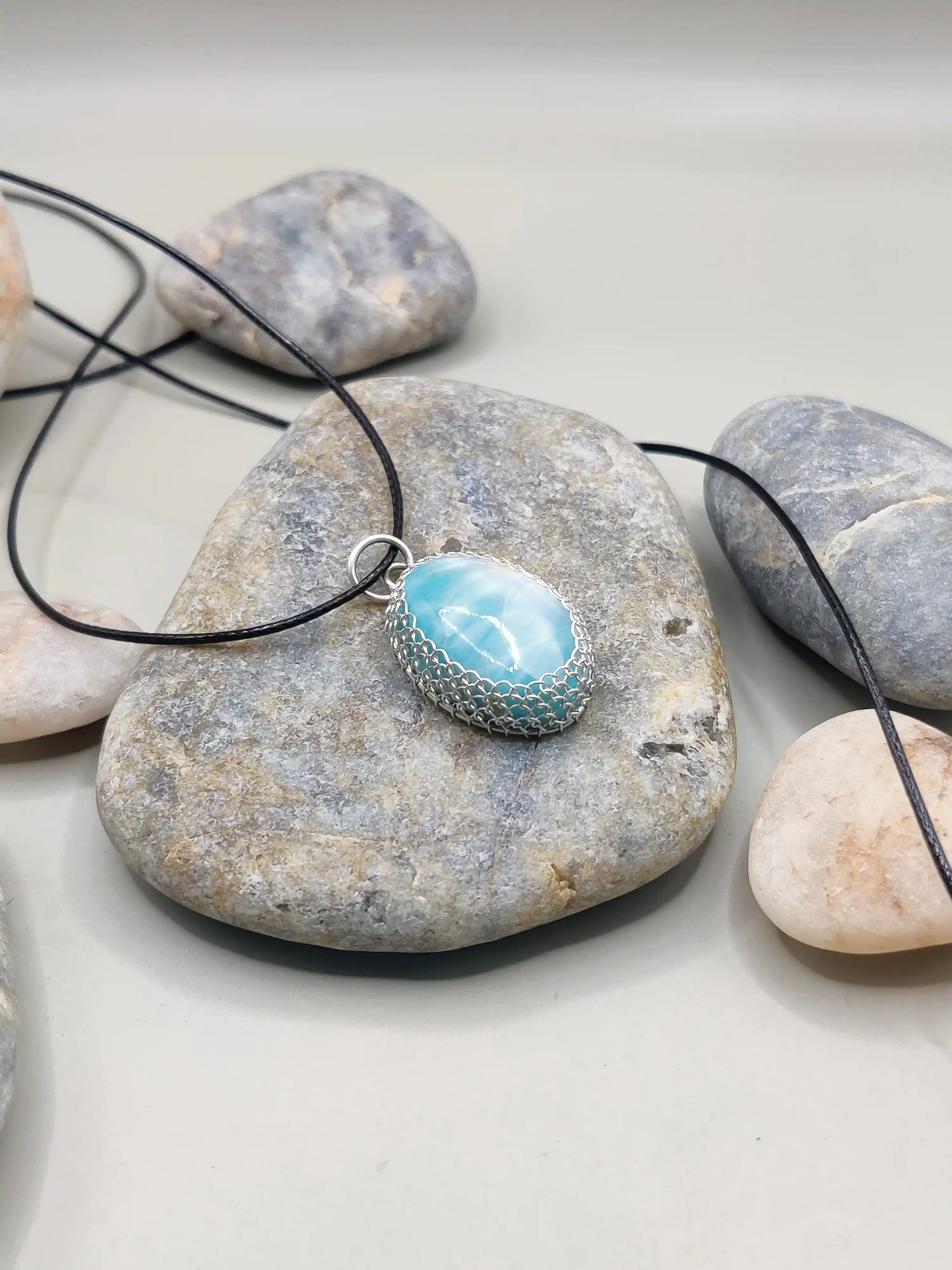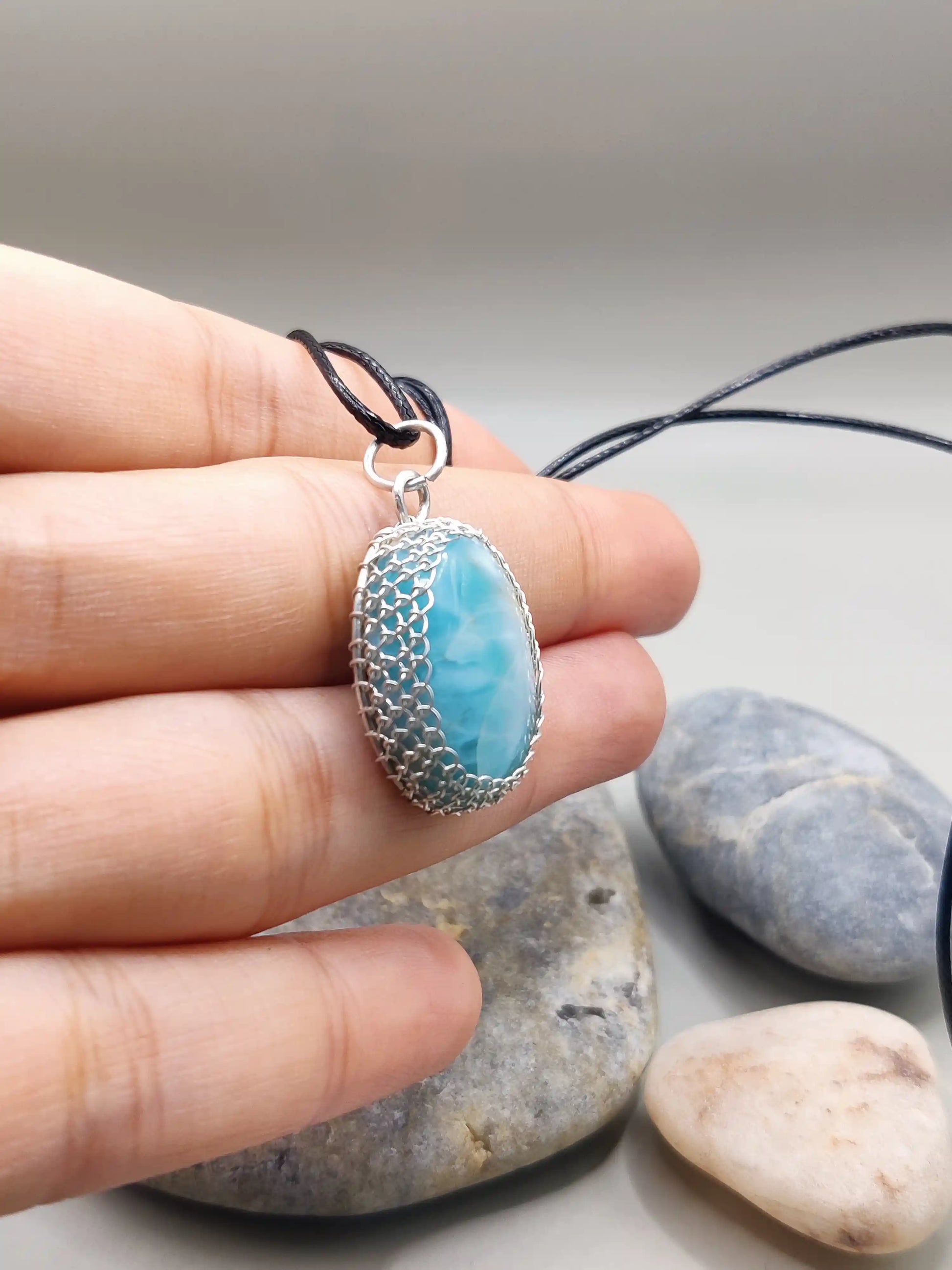 This pendant features a high-quality larimar gemstone, intricately wrapped in sterling silver wire with a delicate weaving pattern that enhances its natural beauty. The detailed craftsmanship creates a sophisticated, one-of-a-kind piece, perfect for those who appreciate fine artistry and spiritual depth.