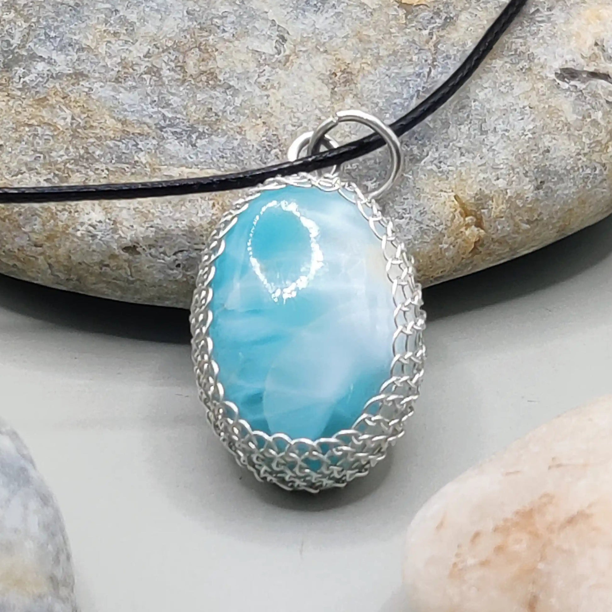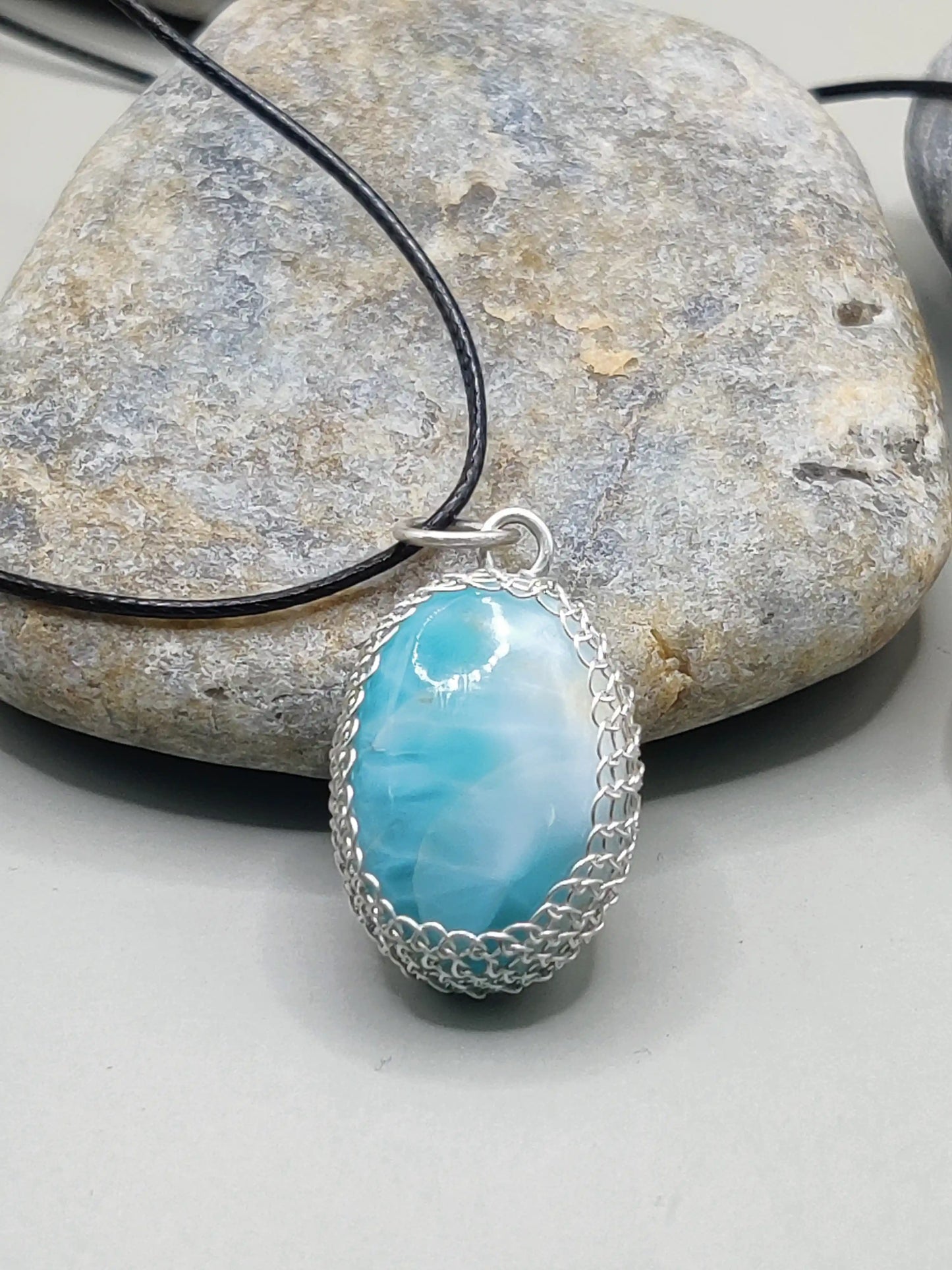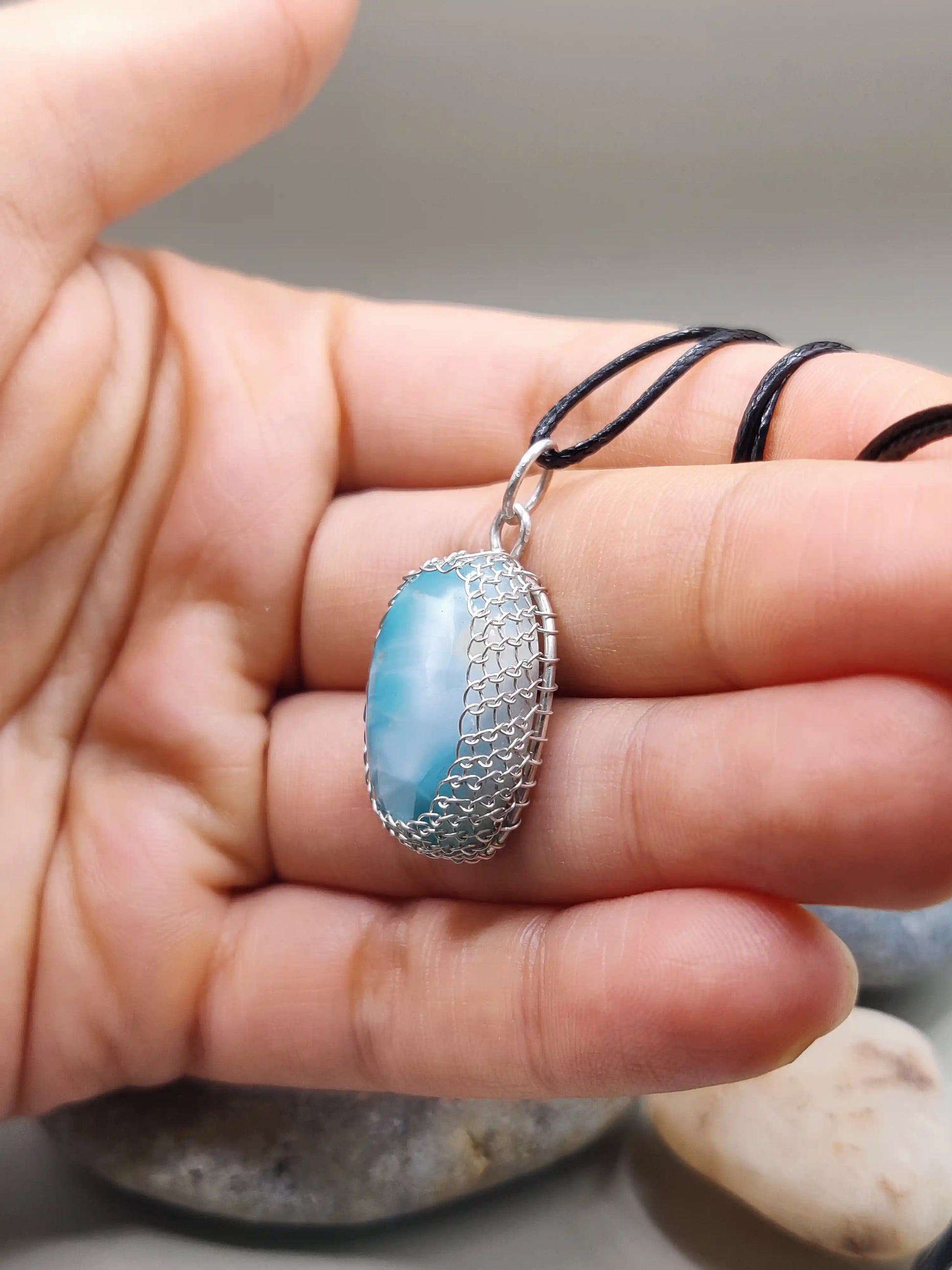 This pendant features a high-quality larimar gemstone, intricately wrapped in sterling silver wire with a delicate weaving pattern that enhances its natural beauty. The detailed craftsmanship creates a sophisticated, one-of-a-kind piece, perfect for those who appreciate fine artistry and spiritual depth.