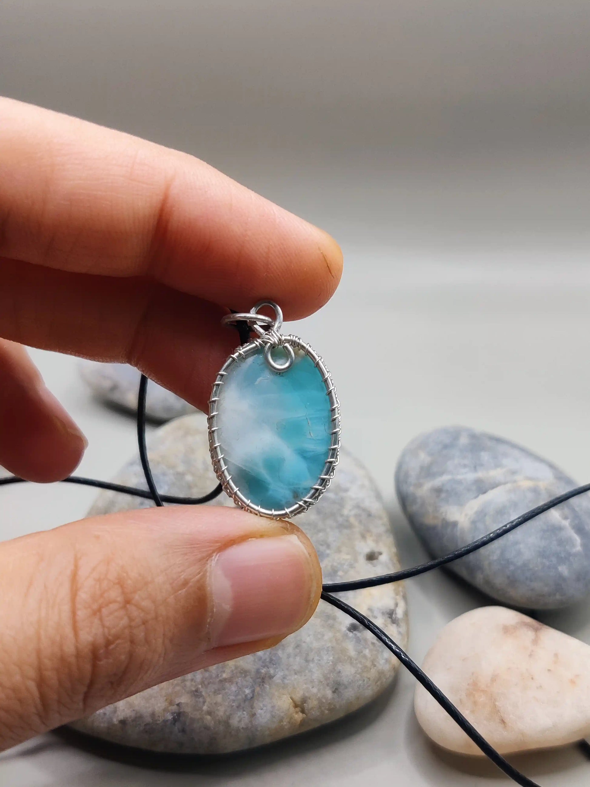 Immerse yourself in the soothing energy of this handcrafted pendant, featuring a mesmerizing larimar gemstone set in 925 sterling silver with an intricate wire-weaving pattern. The serene blue hues of larimar, reminiscent of the Caribbean Sea, blend harmoniously with the elegance of sterling silver, creating a piece that embodies peace, clarity, and artistic beauty.