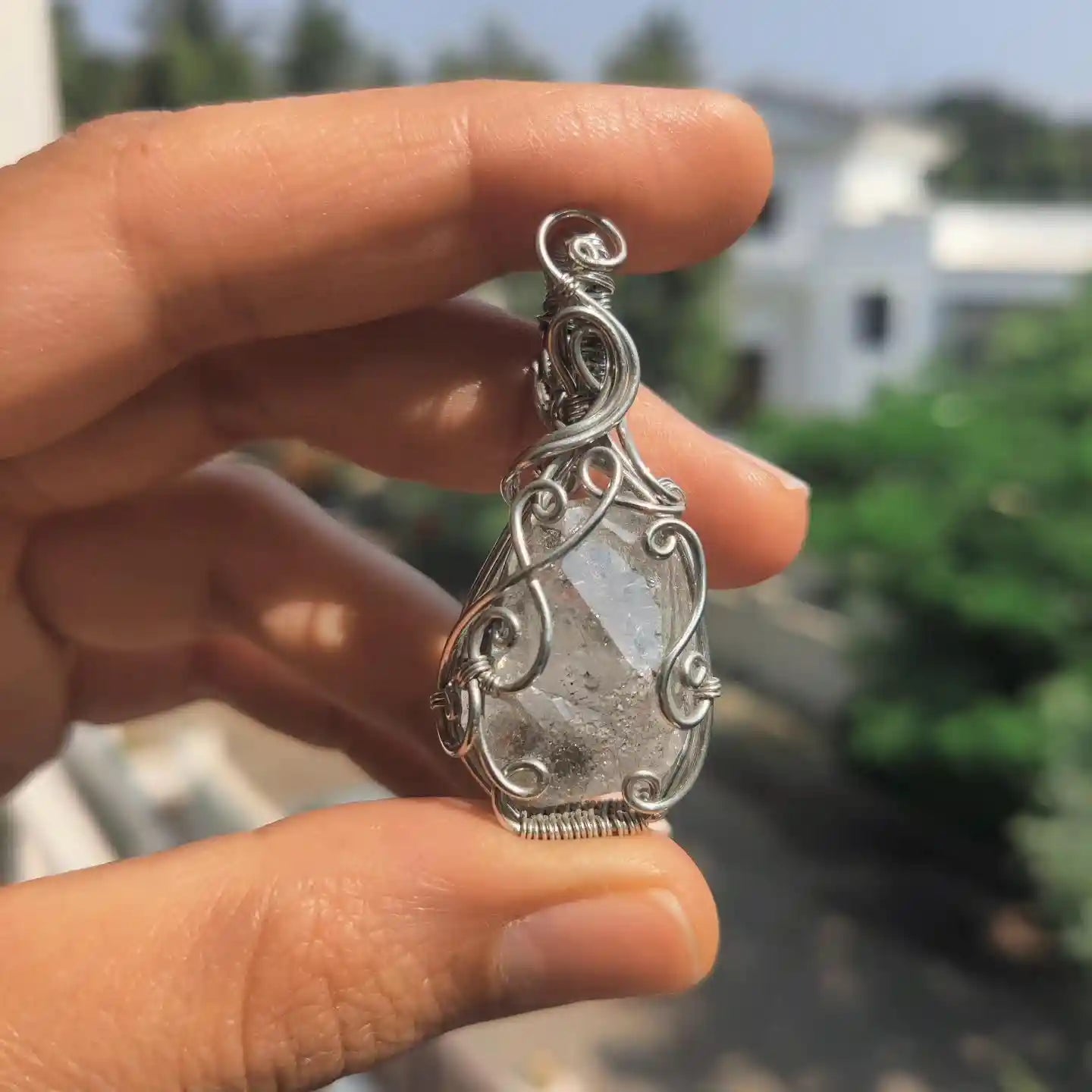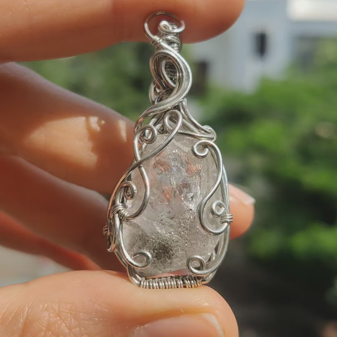 This pendant features a high-quality, natural Herkimer diamond, elegantly set in handcrafted sterling silver wirework. Its minimalist yet striking design allows the crystal’s brilliance to shine, making it a versatile and sophisticated addition to any collection.