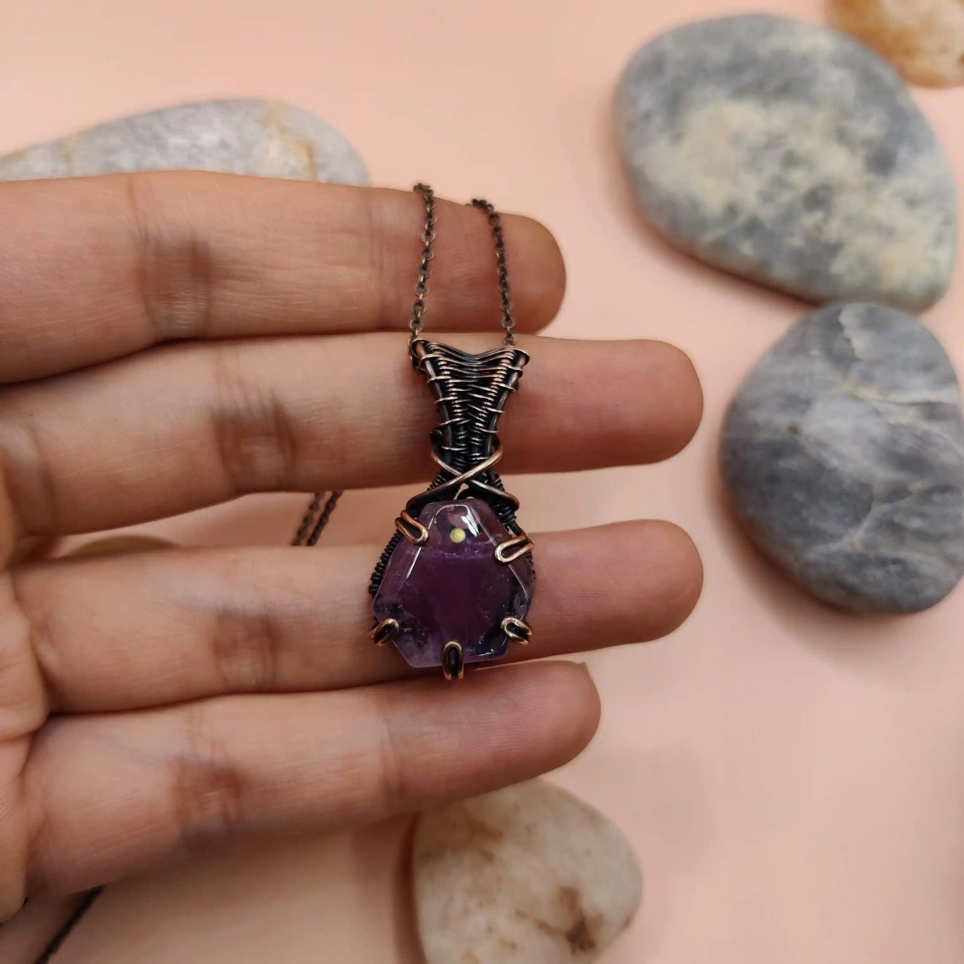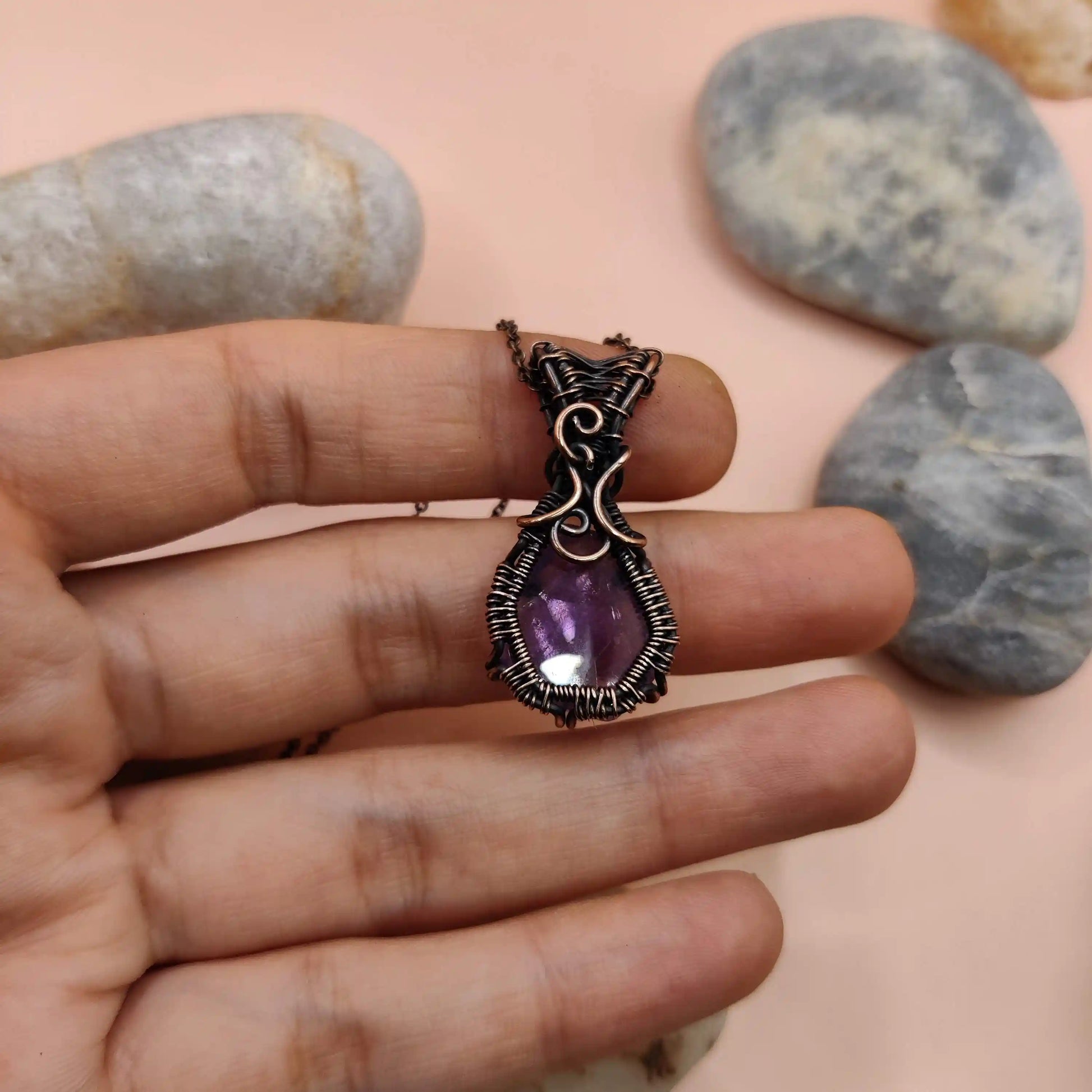 This necklace features a luminous amethyst pendant wrapped in oxidized copper, with intricate wirework that accentuates the natural beauty of the stone. Paired with a matching copper chain, the design exudes elegance and spiritual strength.