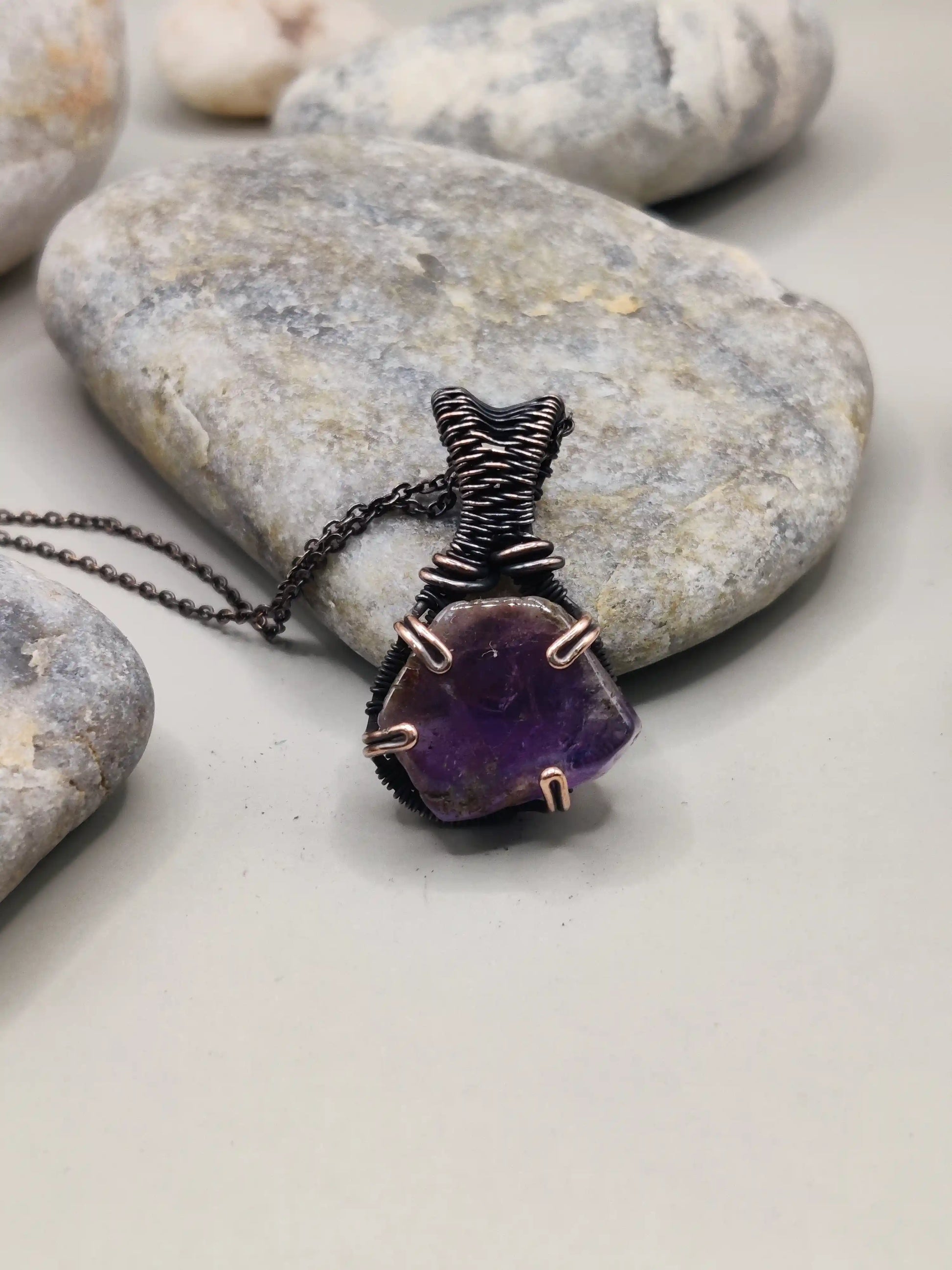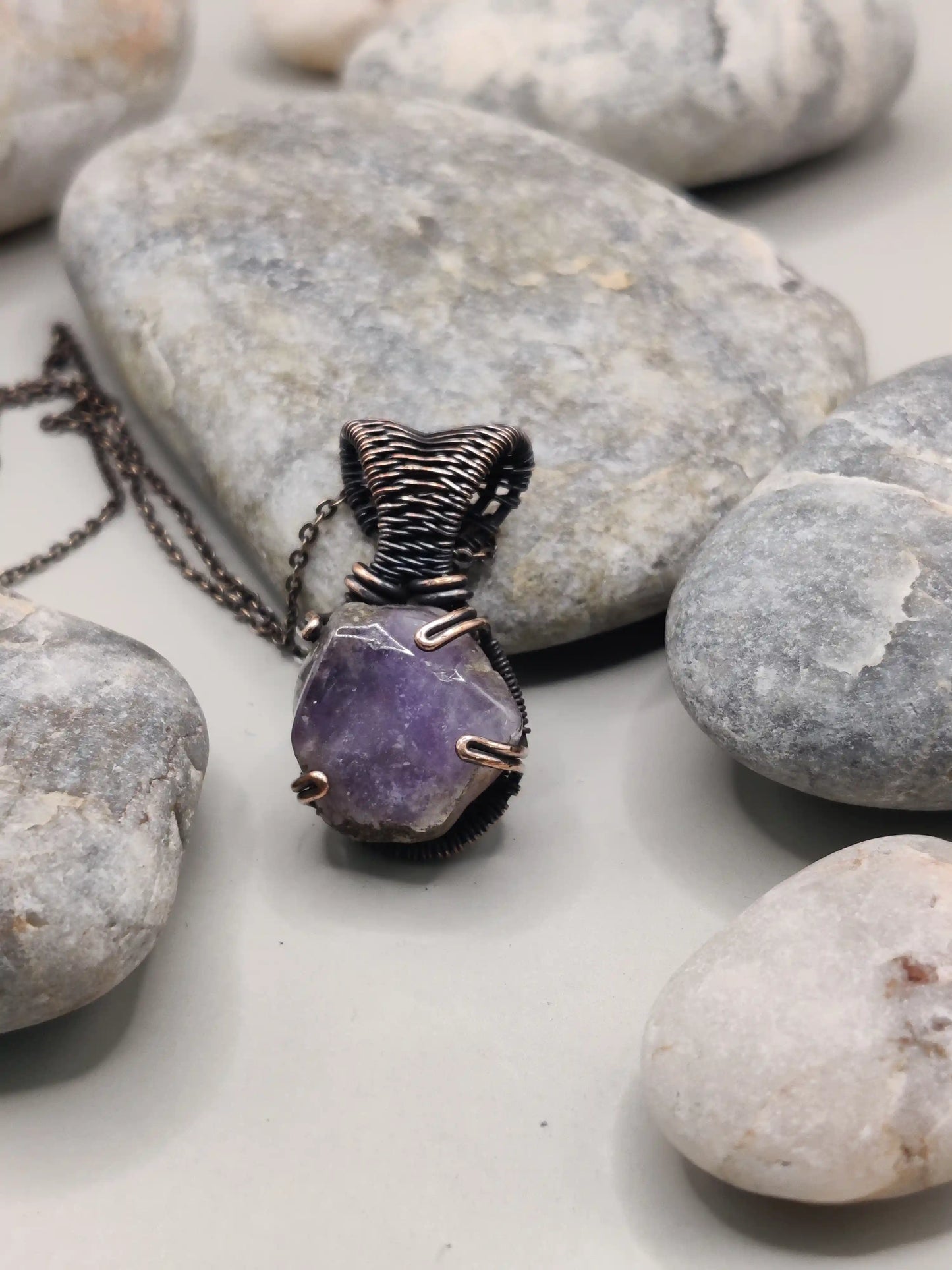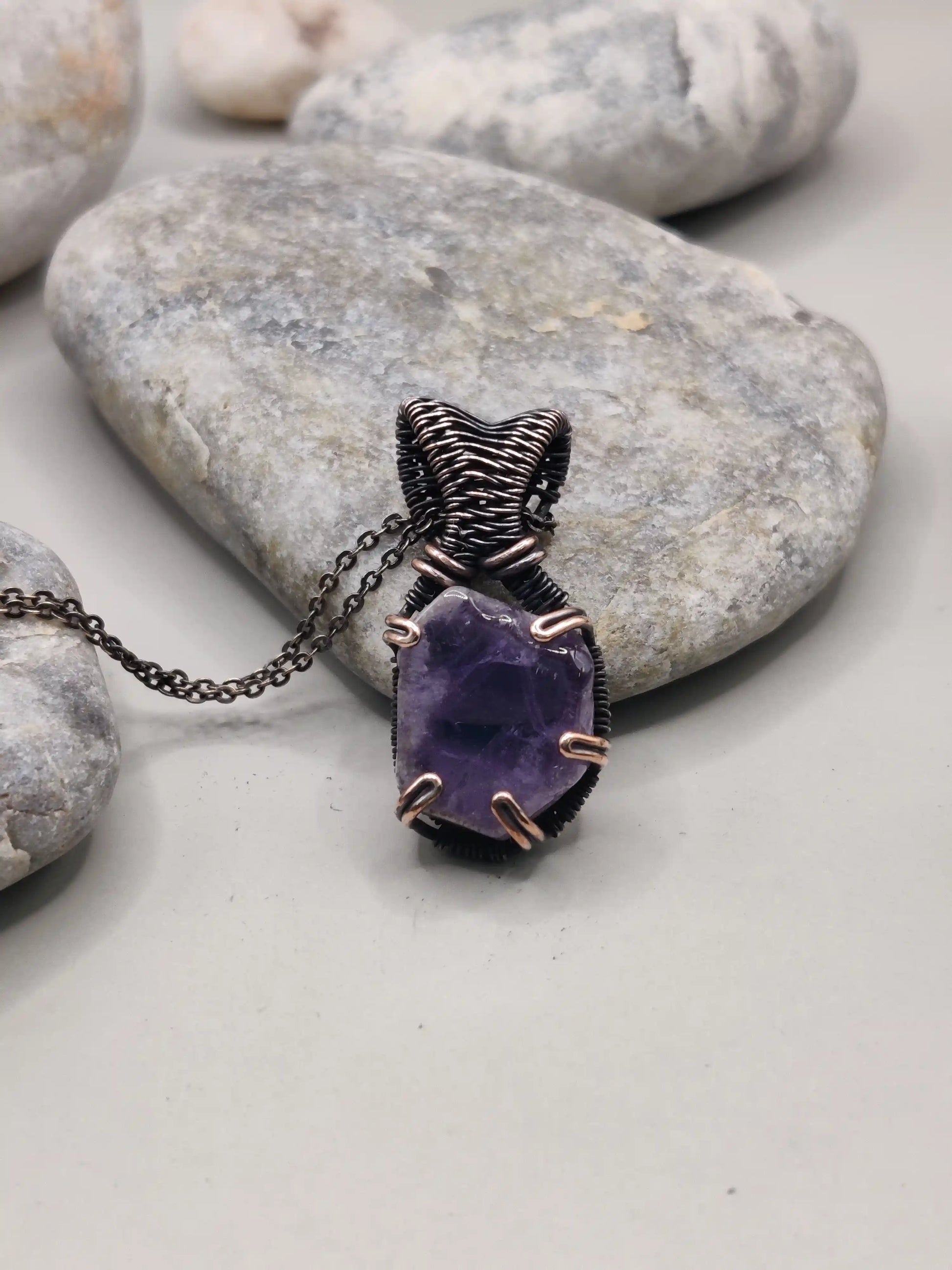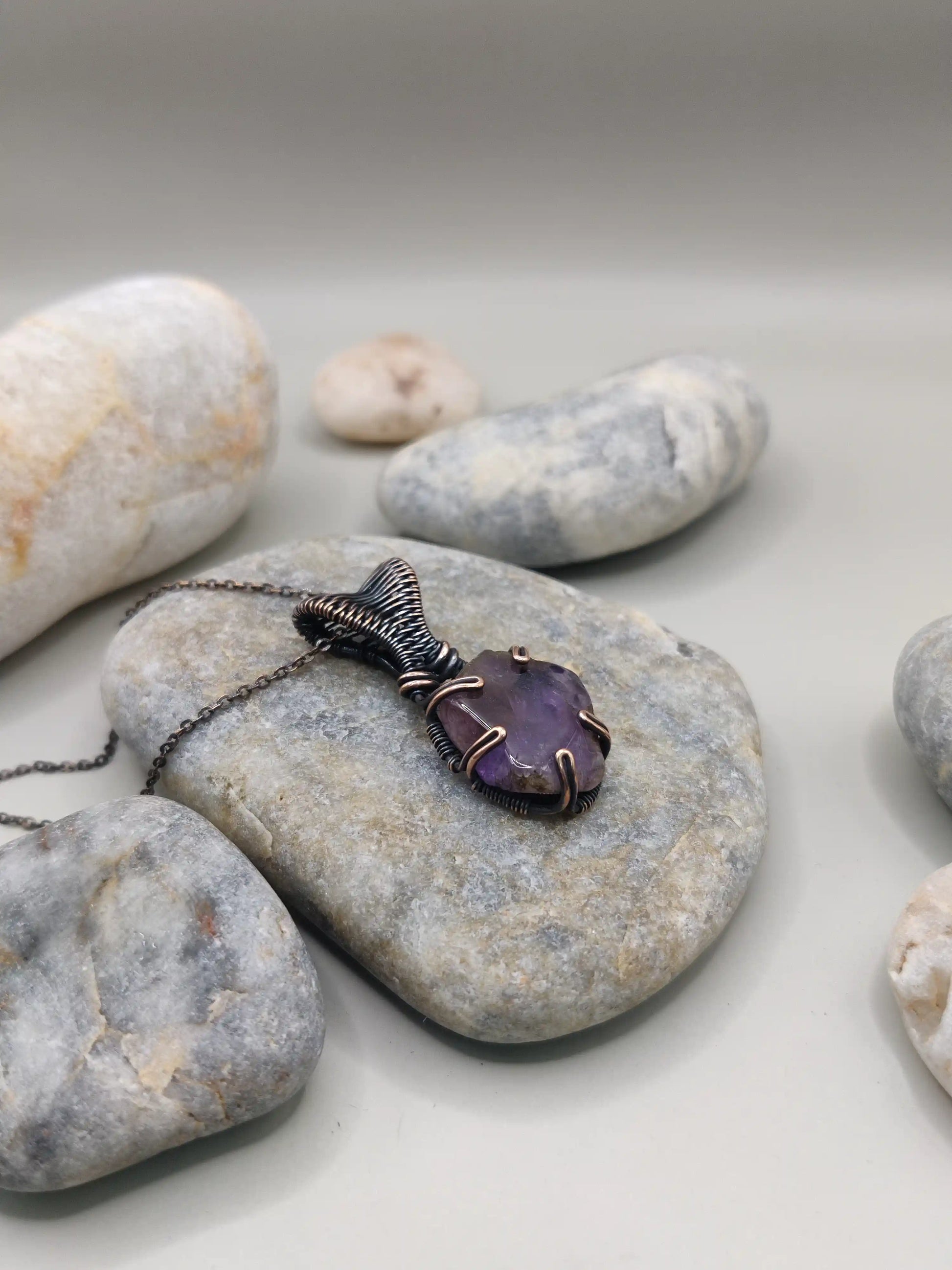This necklace features a luminous amethyst pendant wrapped in oxidized copper, with intricate wirework that accentuates the natural beauty of the stone. Paired with a matching copper chain, the design exudes elegance and spiritual strength.