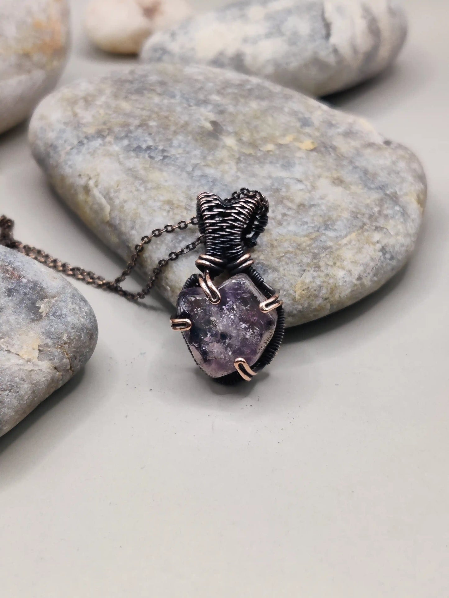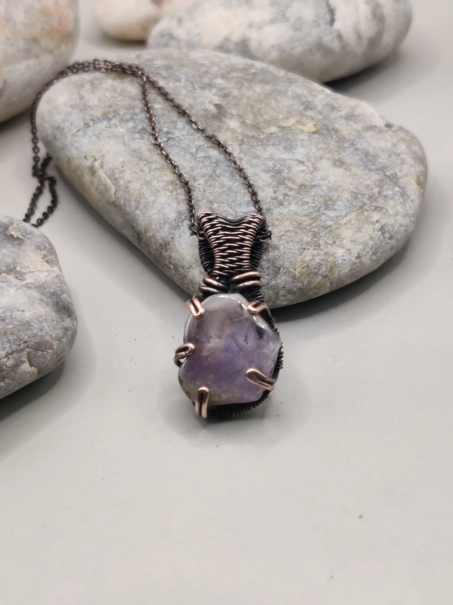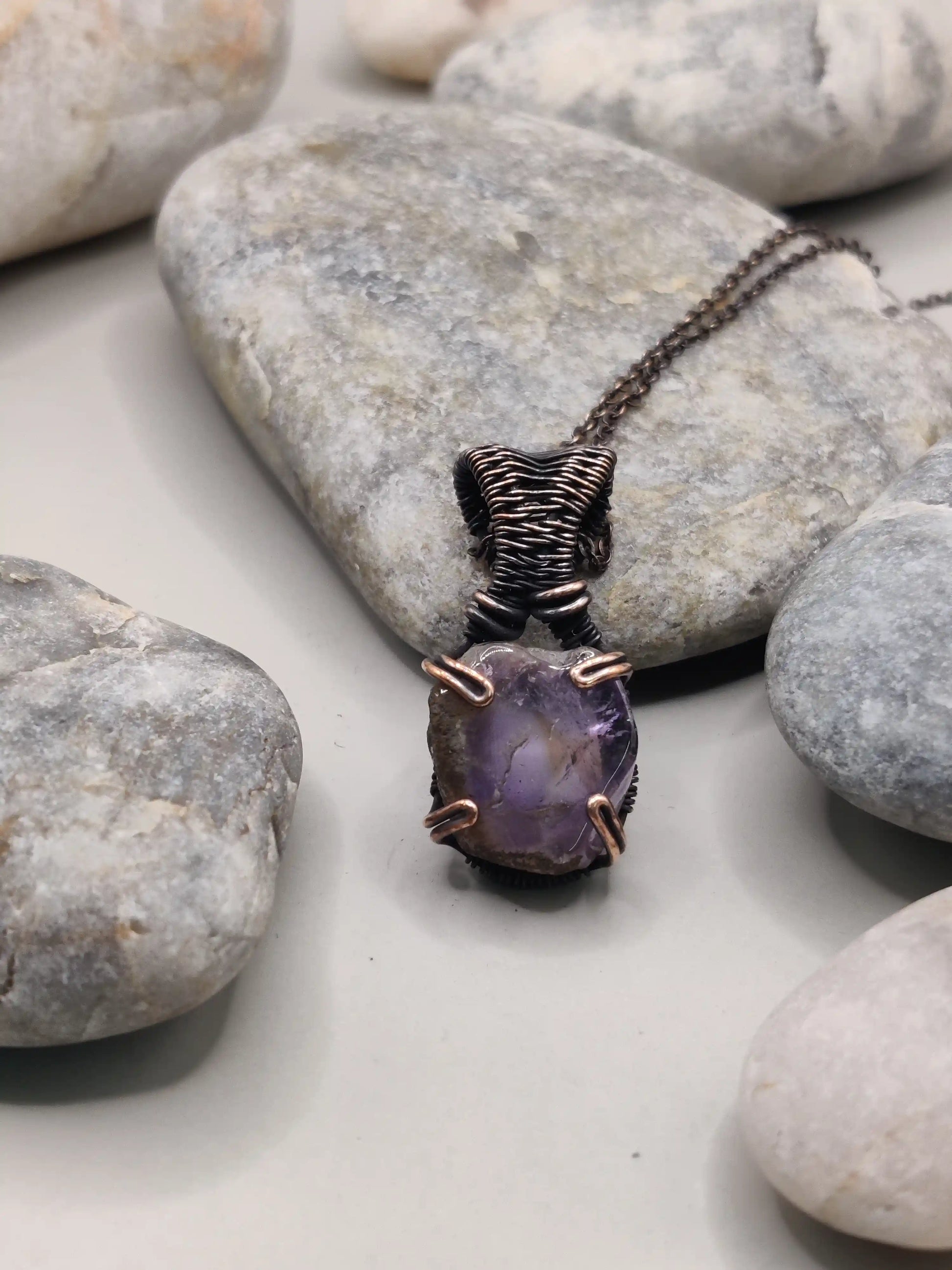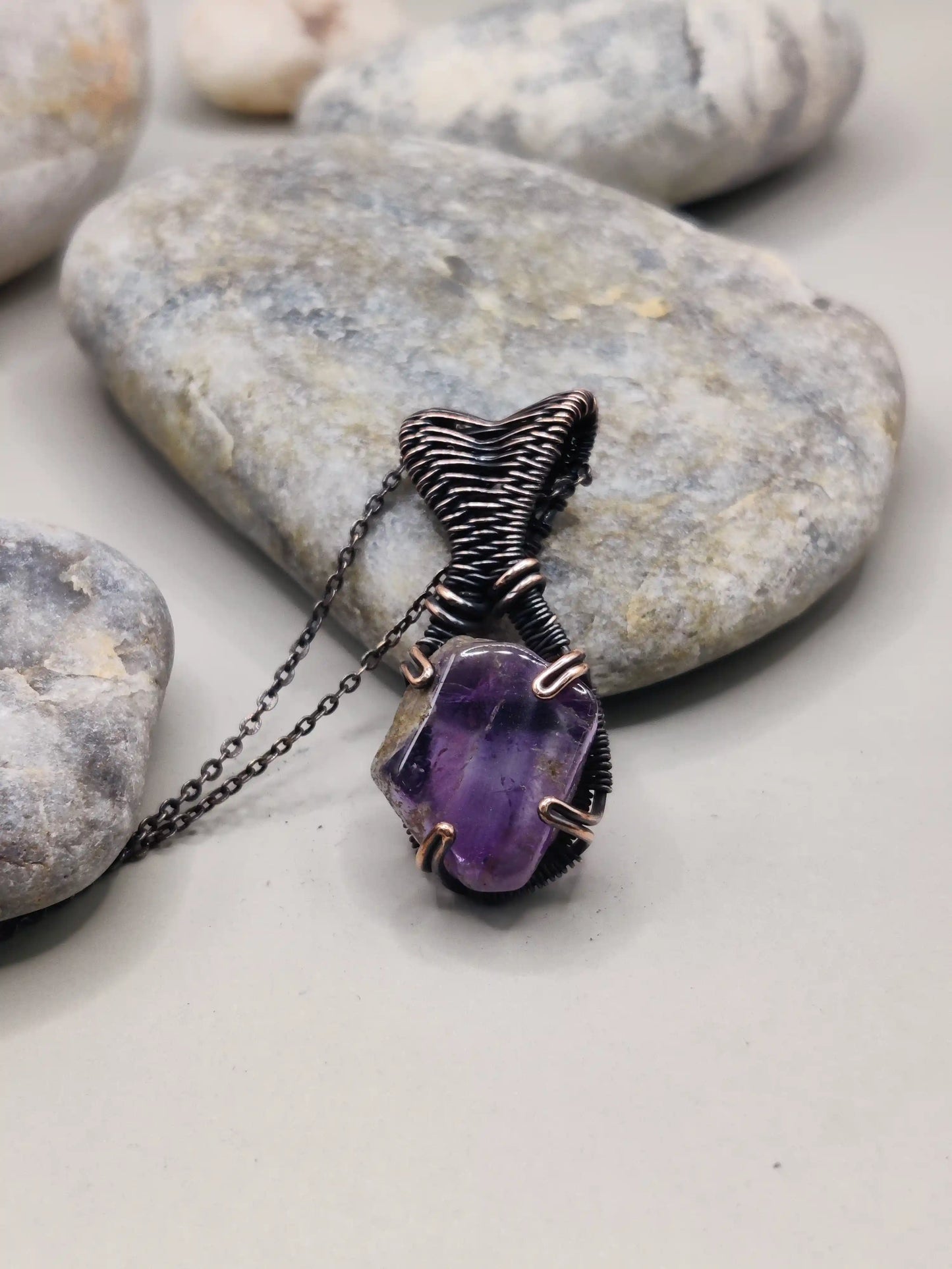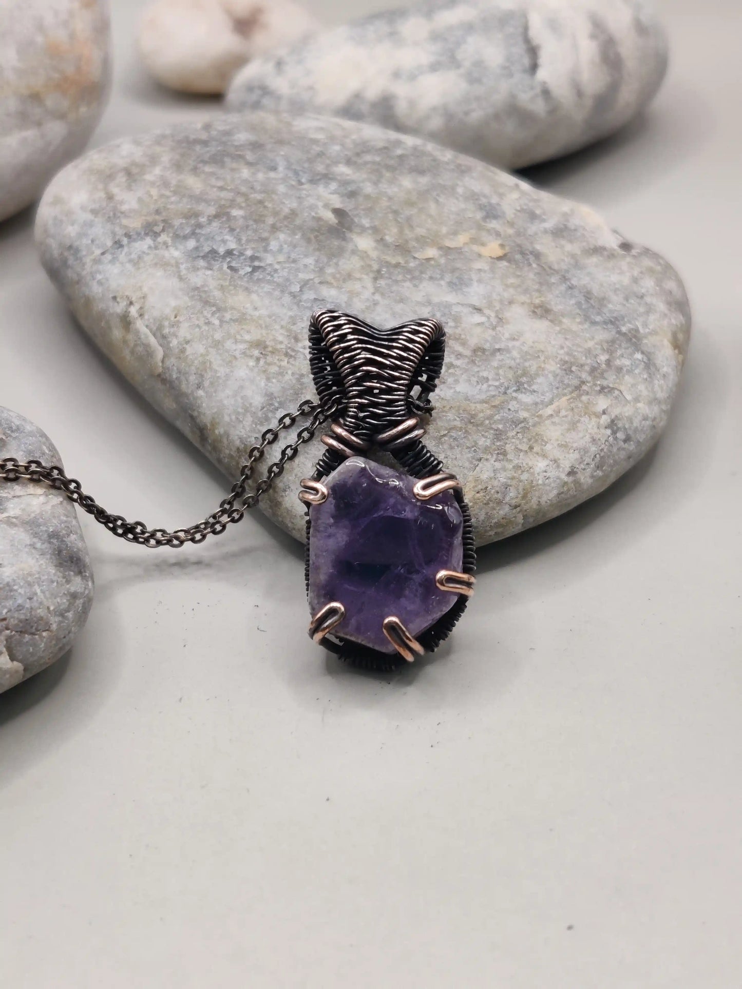 This necklace features a luminous amethyst pendant wrapped in oxidized copper, with intricate wirework that accentuates the natural beauty of the stone. Paired with a matching copper chain, the design exudes elegance and spiritual strength.