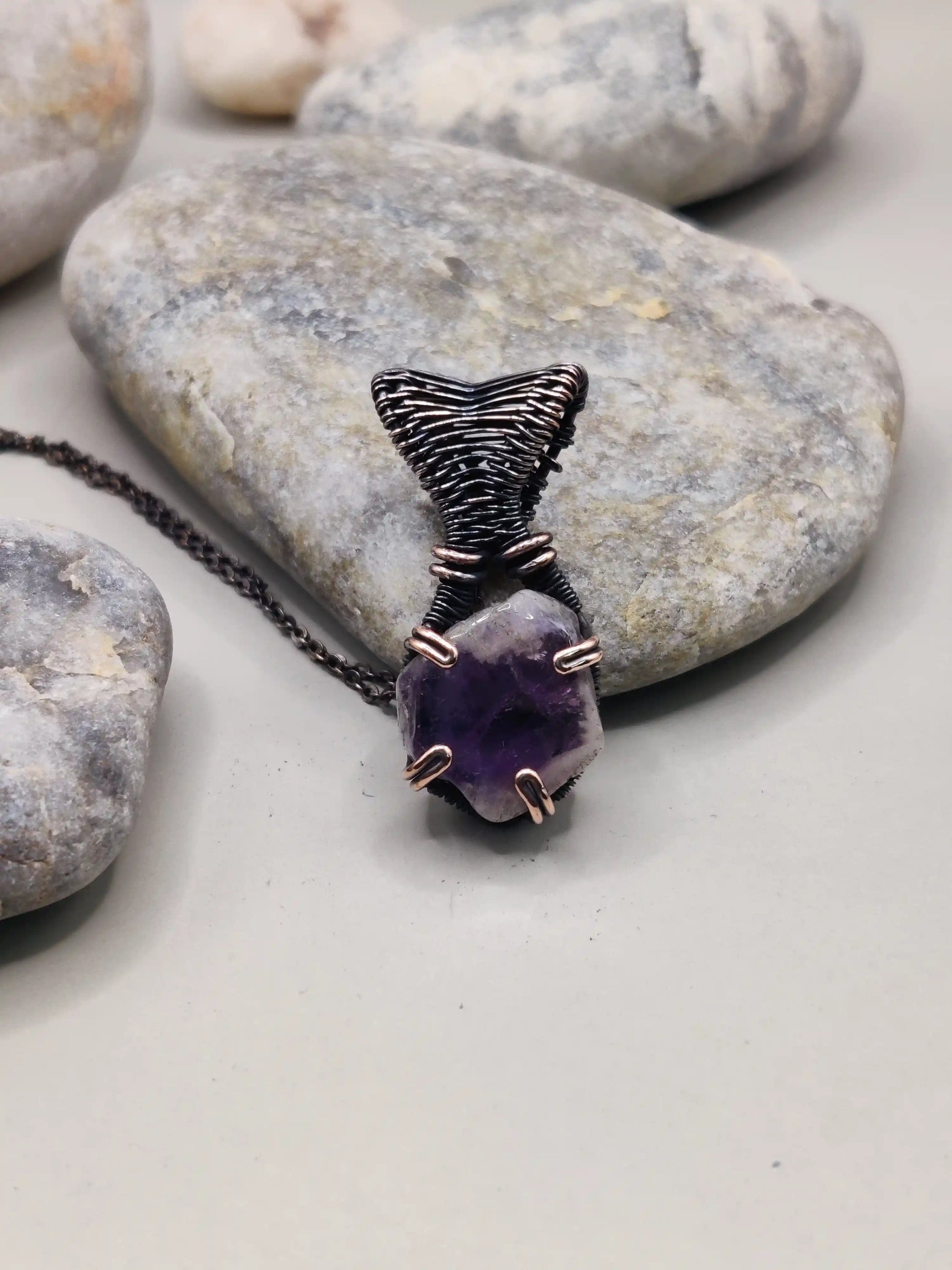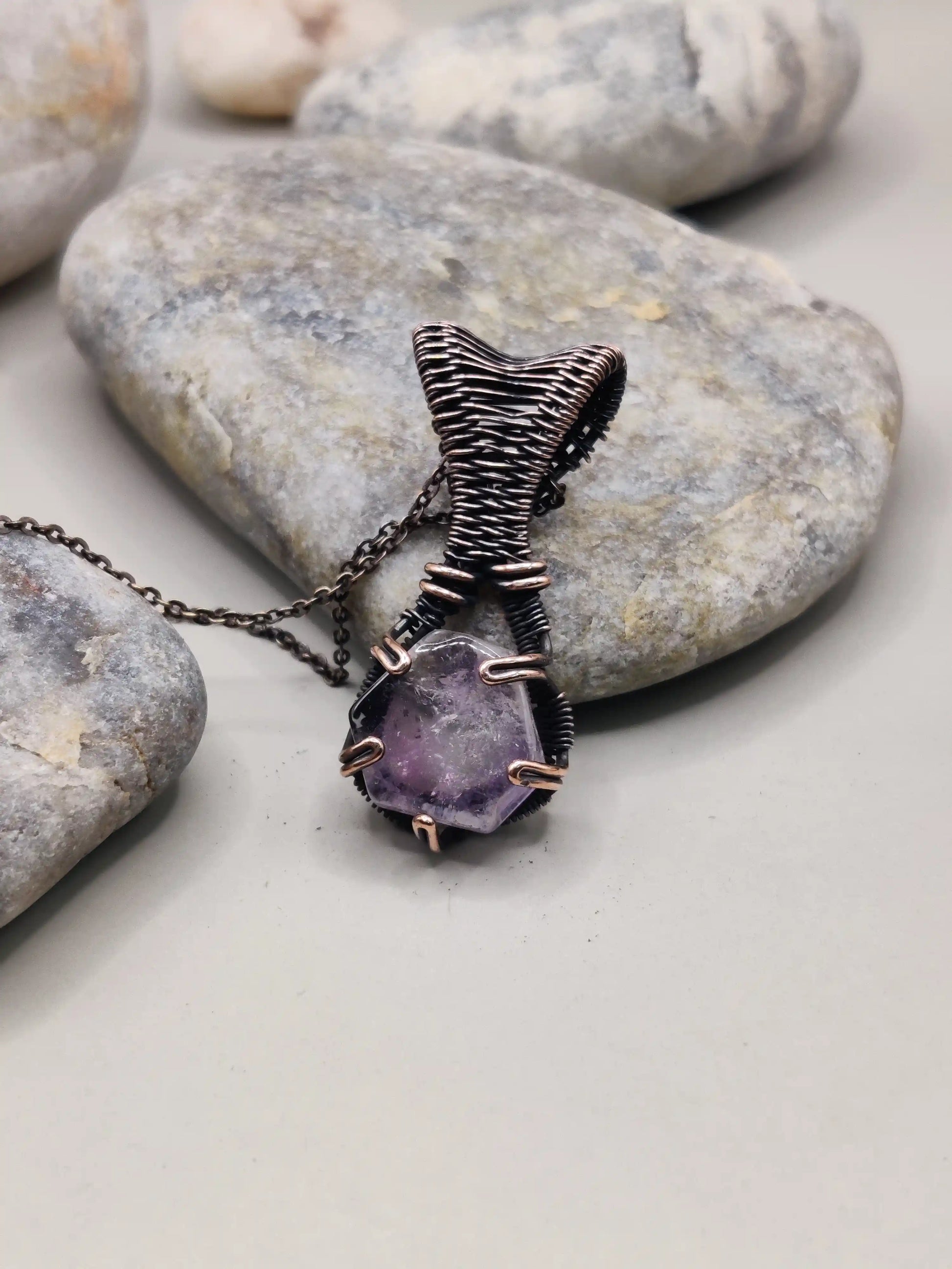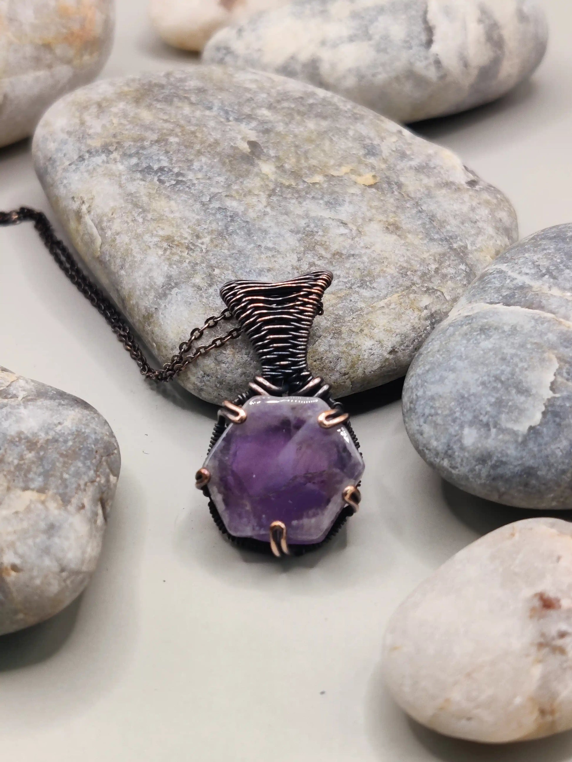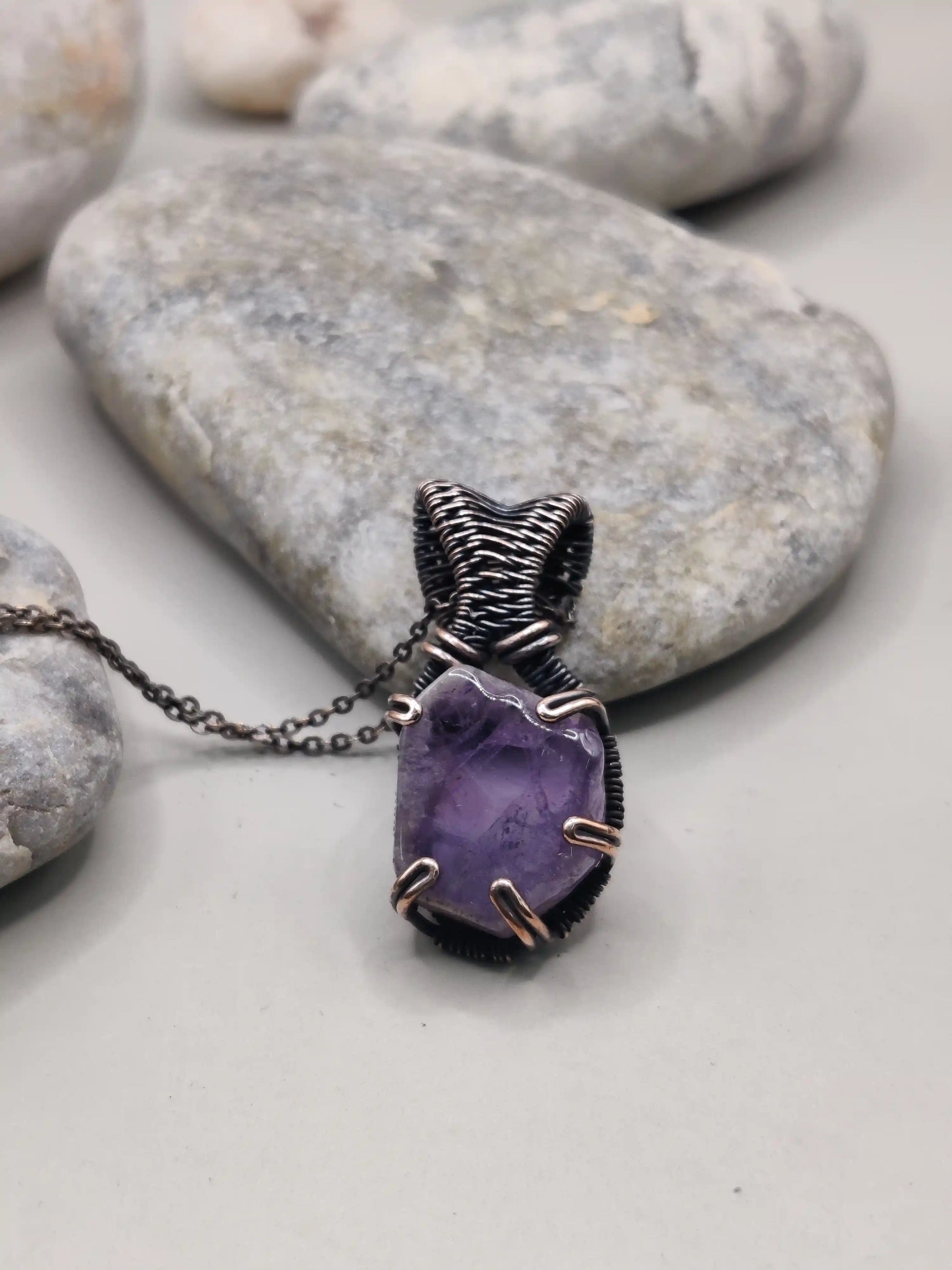 This necklace features a luminous amethyst pendant wrapped in oxidized copper, with intricate wirework that accentuates the natural beauty of the stone. Paired with a matching copper chain, the design exudes elegance and spiritual strength.