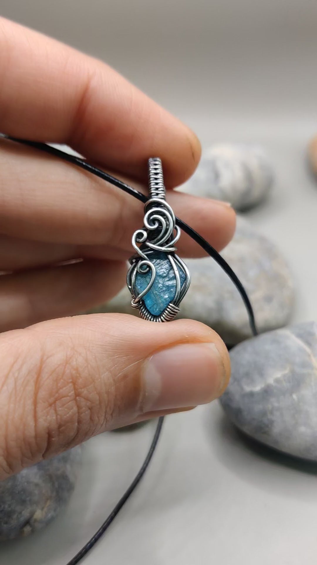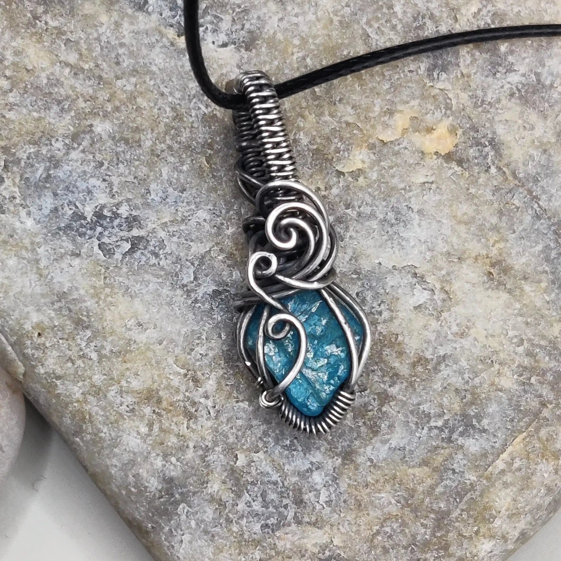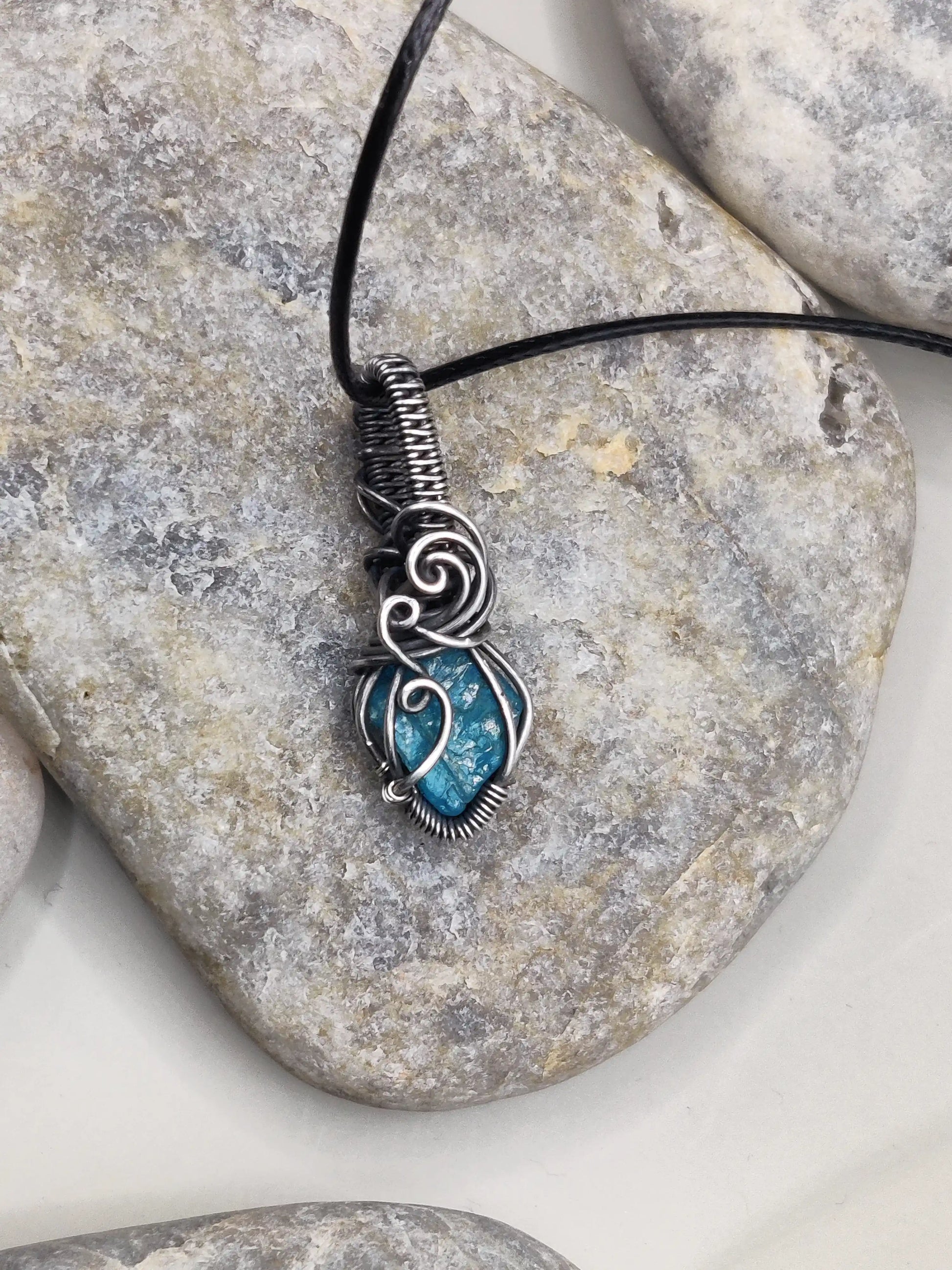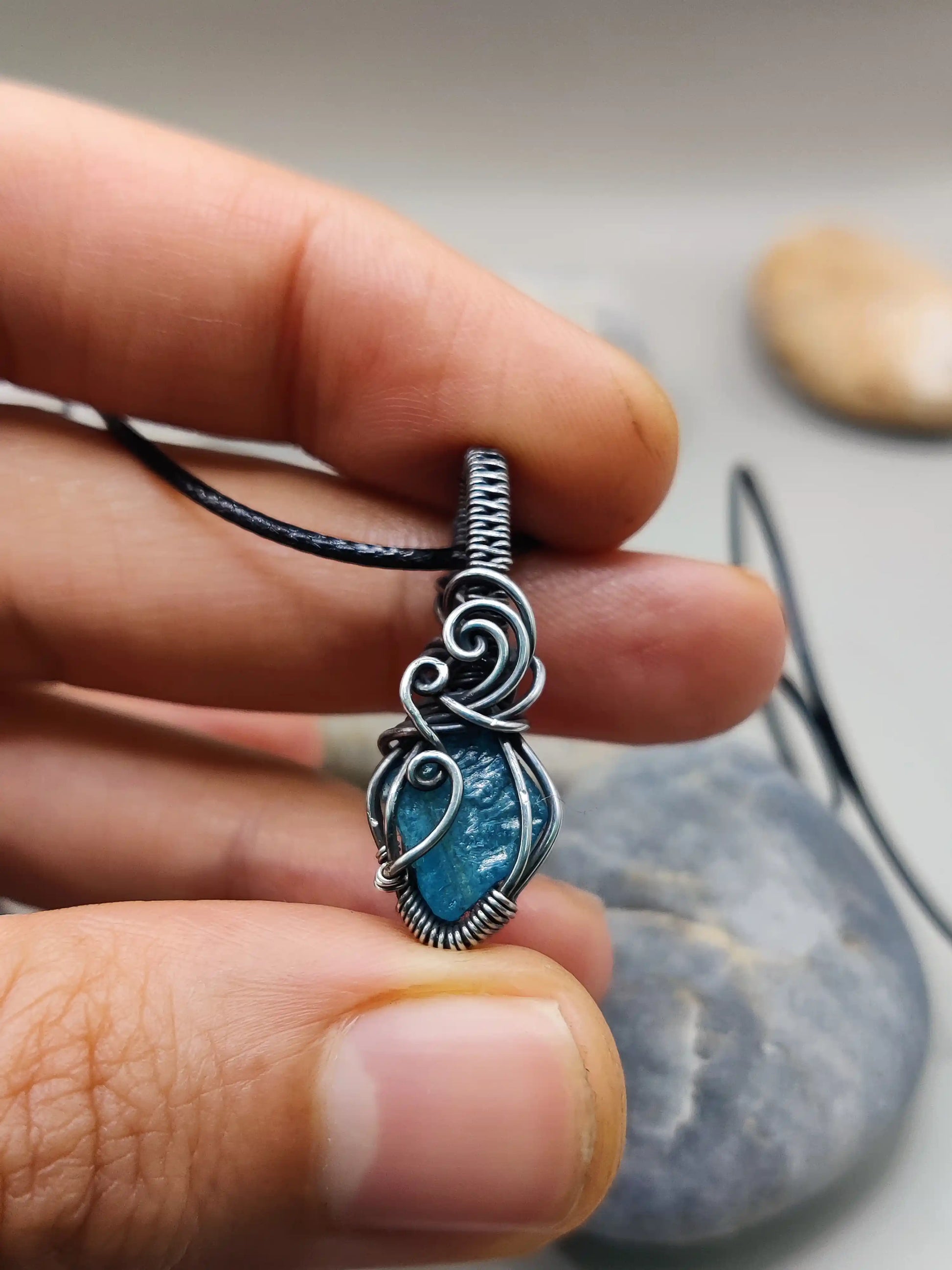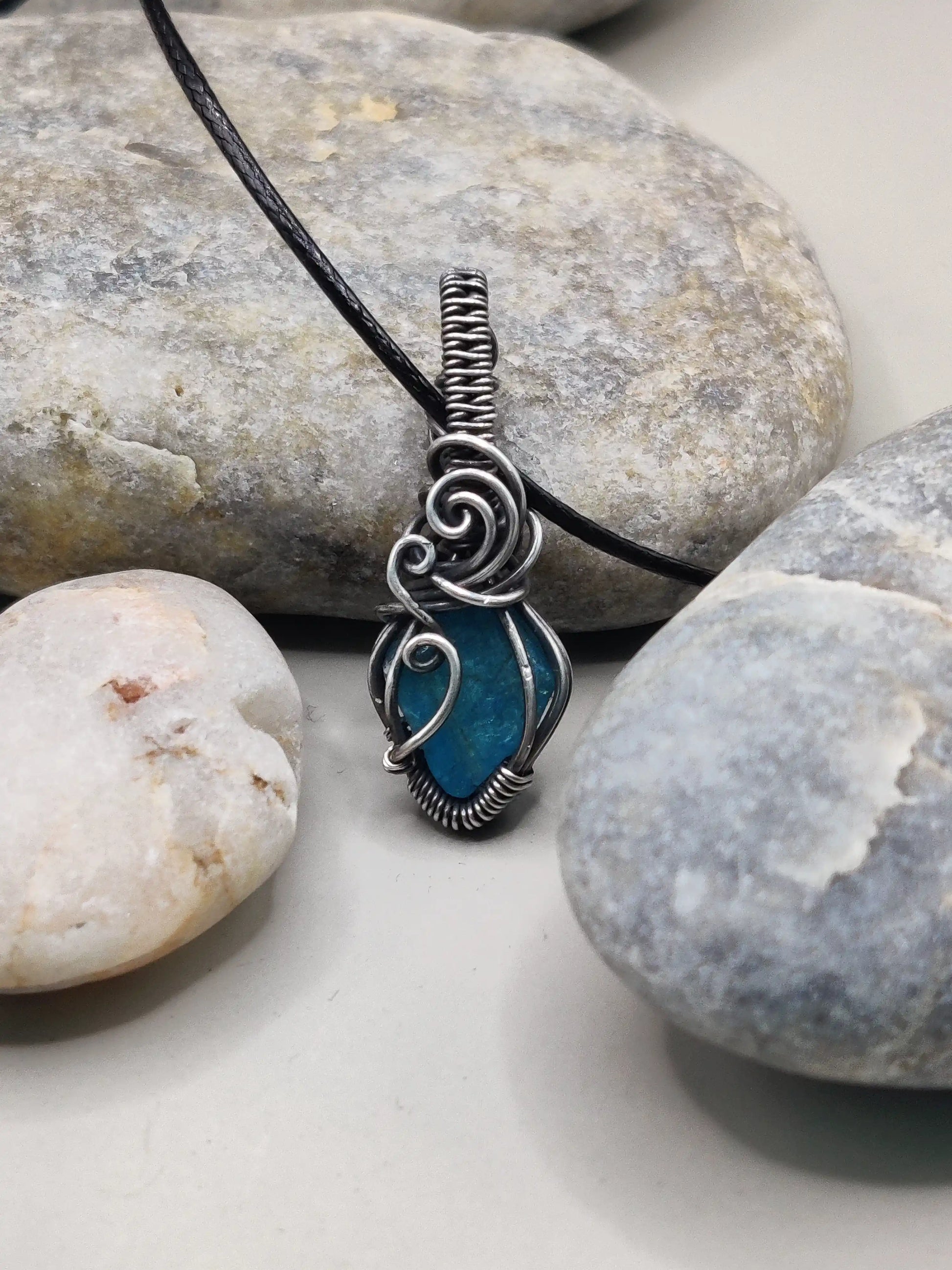 The raw beauty and uplifting energy of blue apatite, handcrafted in 925 sterling silver into a pendant. The rough, unpolished apatite stone brings forth its natural allure and potent spiritual properties, while the sterling silver setting amplifies its energy, making this pendant a profound tool for personal growth and creativity.