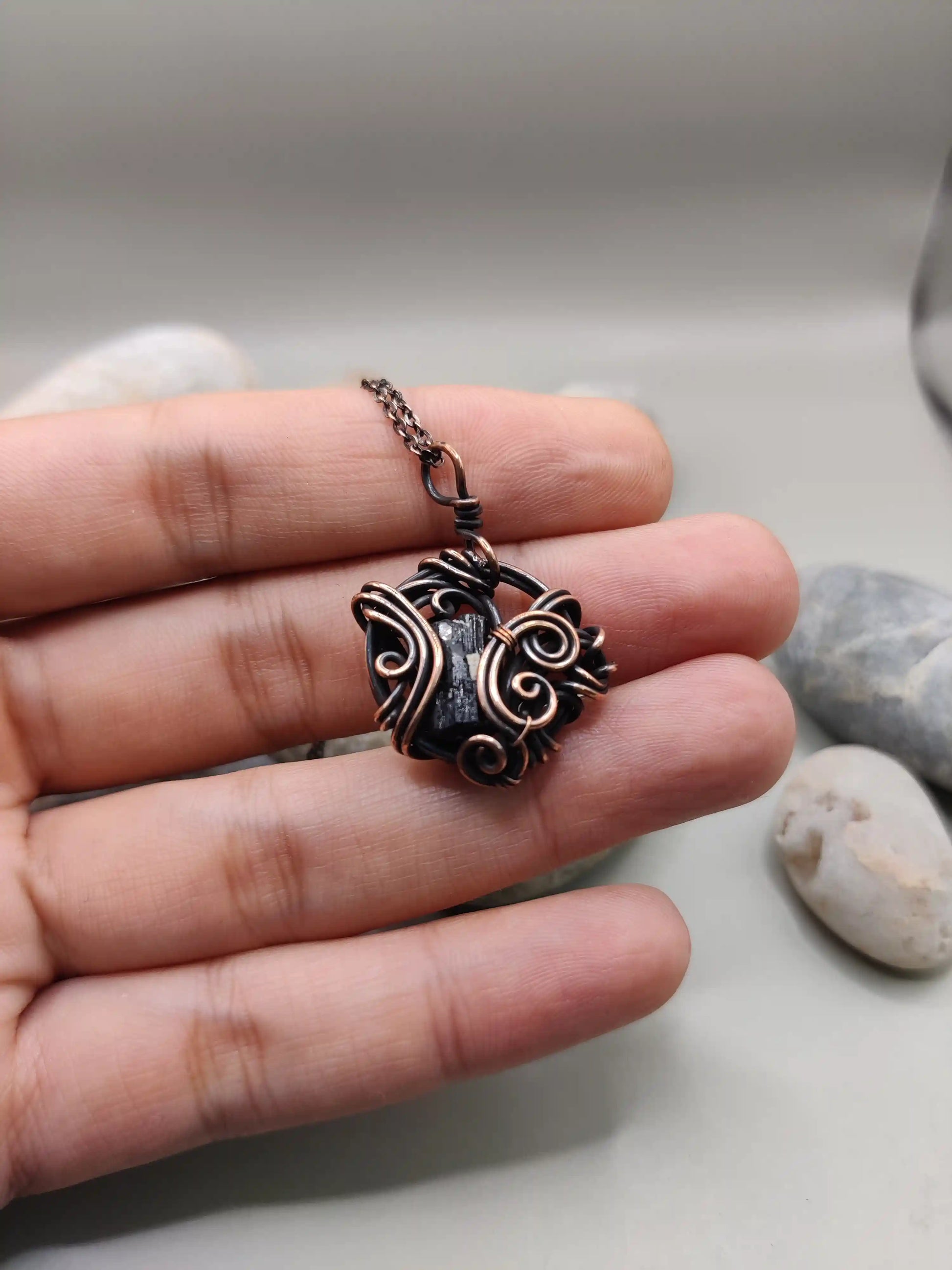 • Handmade with a natural raw black tourmaline pencil and oxidized copper wire