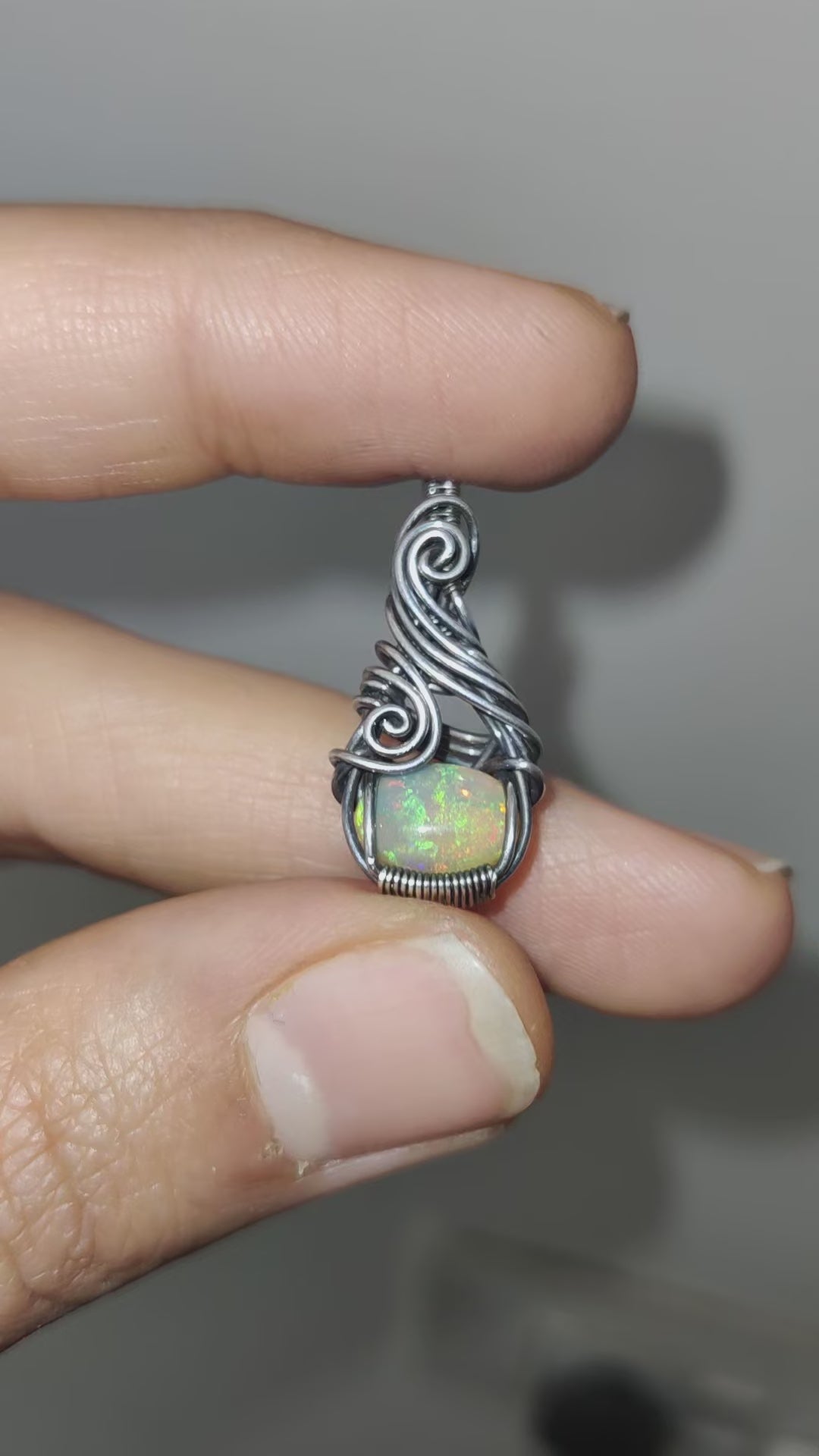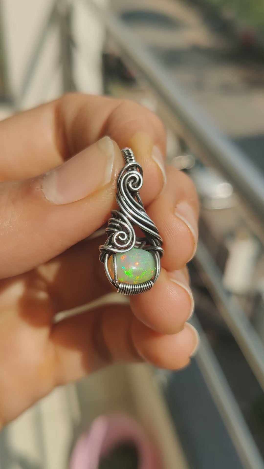This handcrafted pendant features a unique Ethiopian opal, ensuring each piece is a one-of-a-kind treasure. The opal is artfully set in gleaming sterling silver, creating a captivating display of color and light. It suspends gracefully from a delicate chain (not included), making it a versatile statement piece for any occasion.