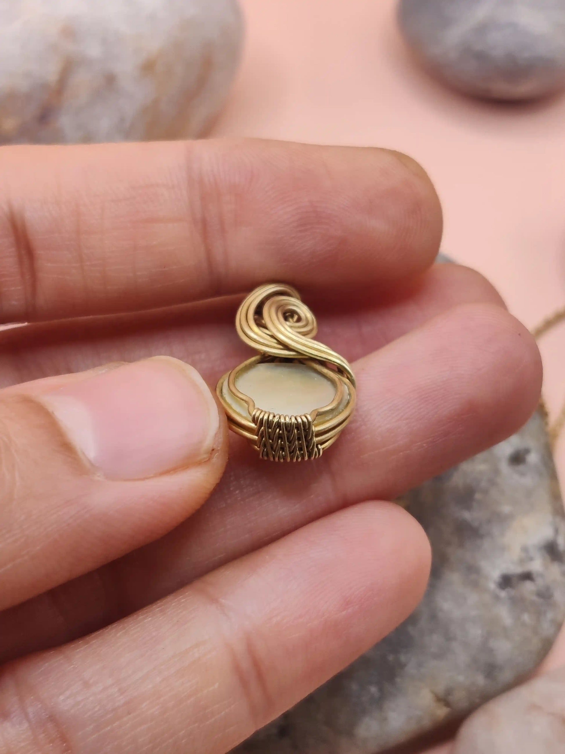 Its golden tone complements the soft iridescence of Mother of Pearl, making the overall piece both subtle and soulful.
