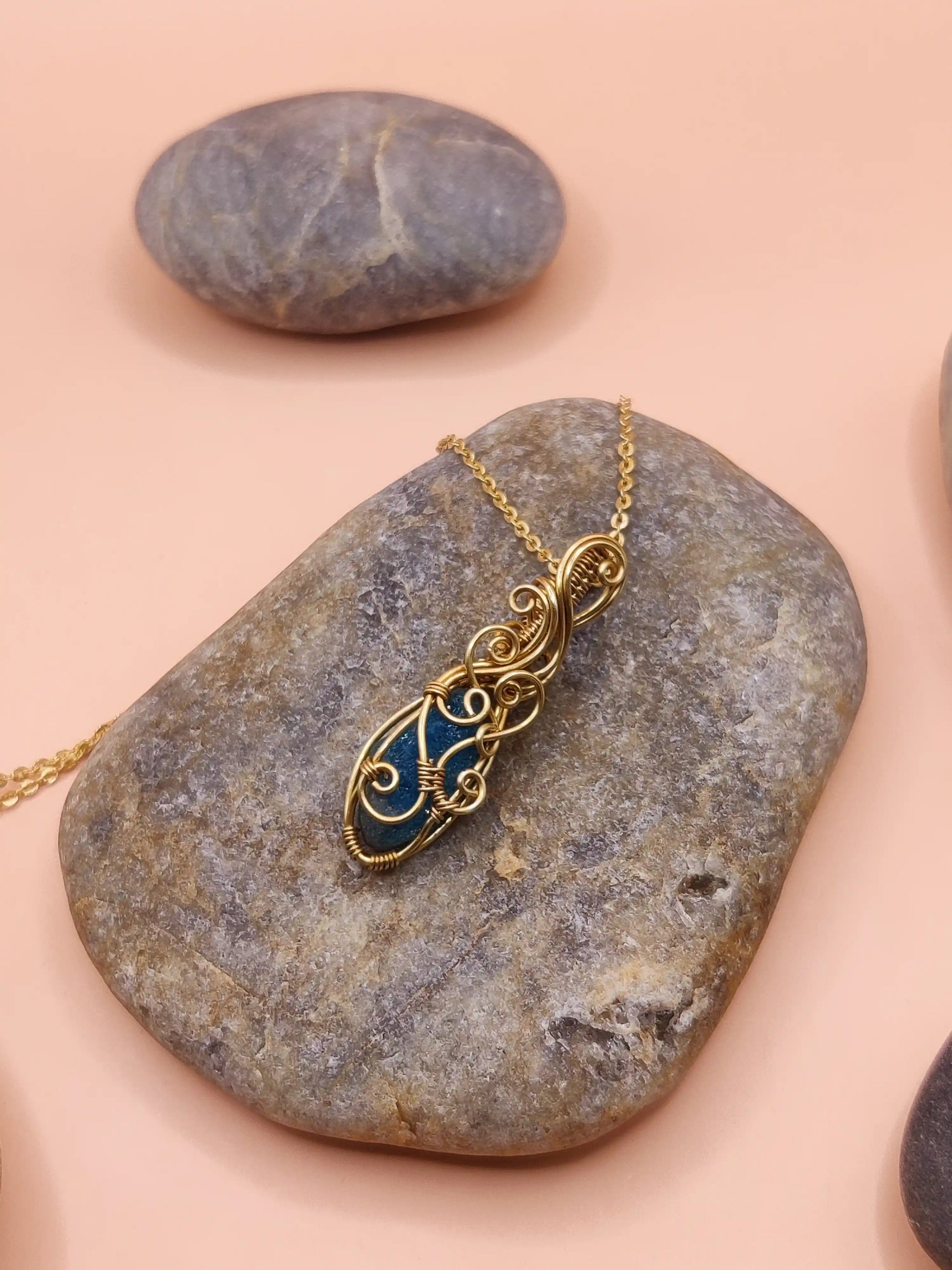 The golden warmth of brass beautifully complements the deep oceanic blue of the Apatite, creating a piece that is both spiritually powerful and visually stunning.