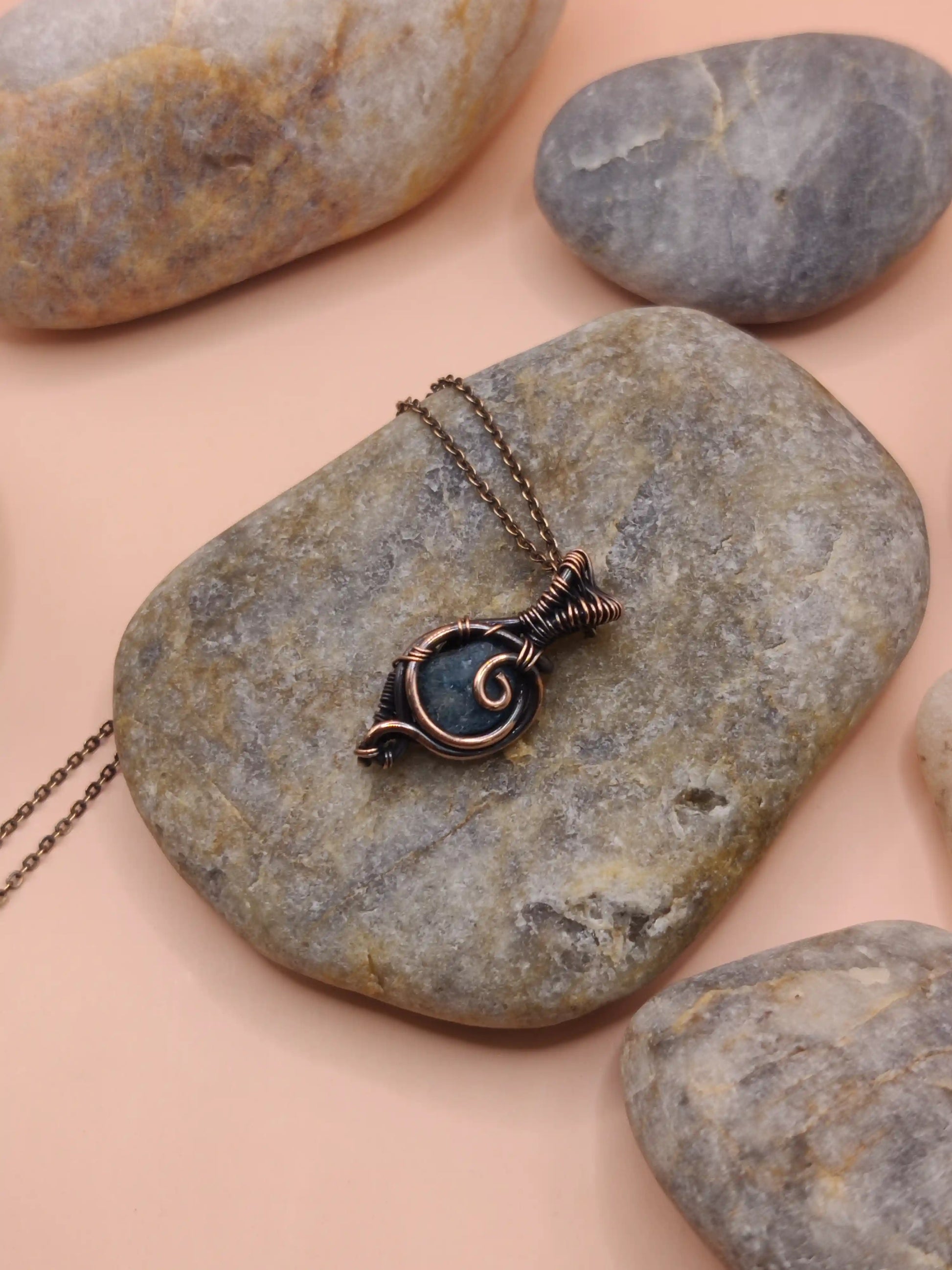 The antique finish of oxidized copper gives this necklace a timeless feel, anchoring the bright and watery energy of the stone with earthy wisdom.