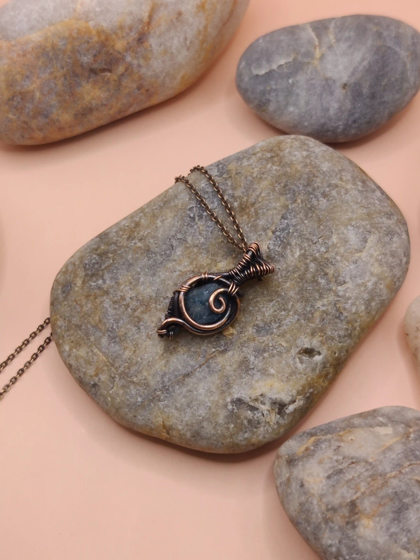 This handmade necklace features a raw, unpolished Neon Blue Apatite gemstone that glows with the brilliance of a tropical lagoon. Set in oxidized copper with detailed wirework and paired with a matching copper chain, this piece highlights the wild beauty of the stone while grounding it in earthy elegance. The result is a one-of-a-kind necklace that resonates with those seeking truth, confidence, and emotional clarity.