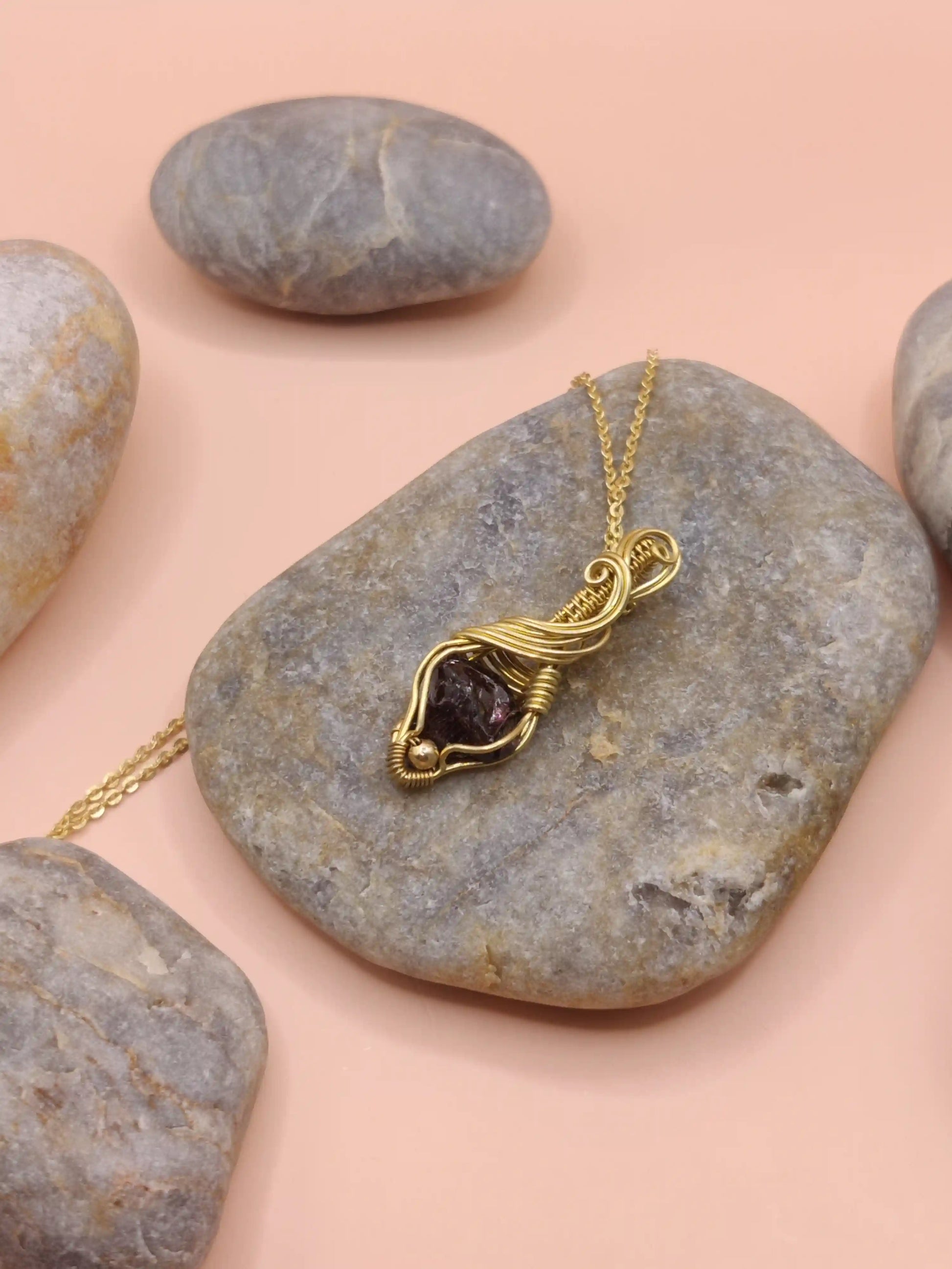 This handcrafted necklace showcases a raw, deep red garnet crystal in its natural form—unpolished yet gleaming with a quiet inner fire. Set in warm, golden brass wirework and paired with a matching brass chain, this piece radiates a timeless, earthy elegance. The raw crystal’s deep clarity and rugged texture are beautifully framed by the soft glow of brass, creating a necklace that feels both powerful and gracefully refined.