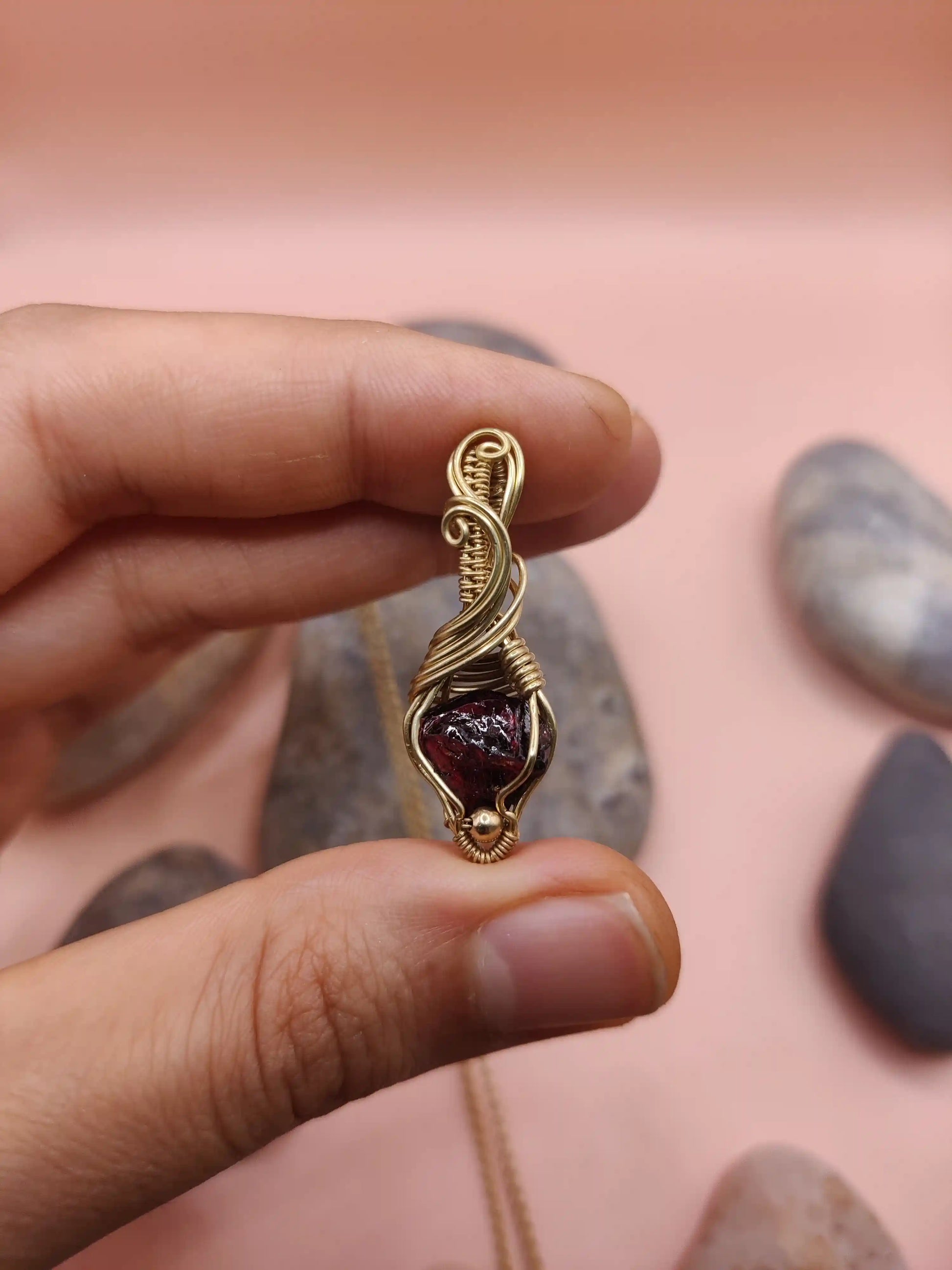 • Handcrafted with a natural, raw garnet crystal and warm brass wire